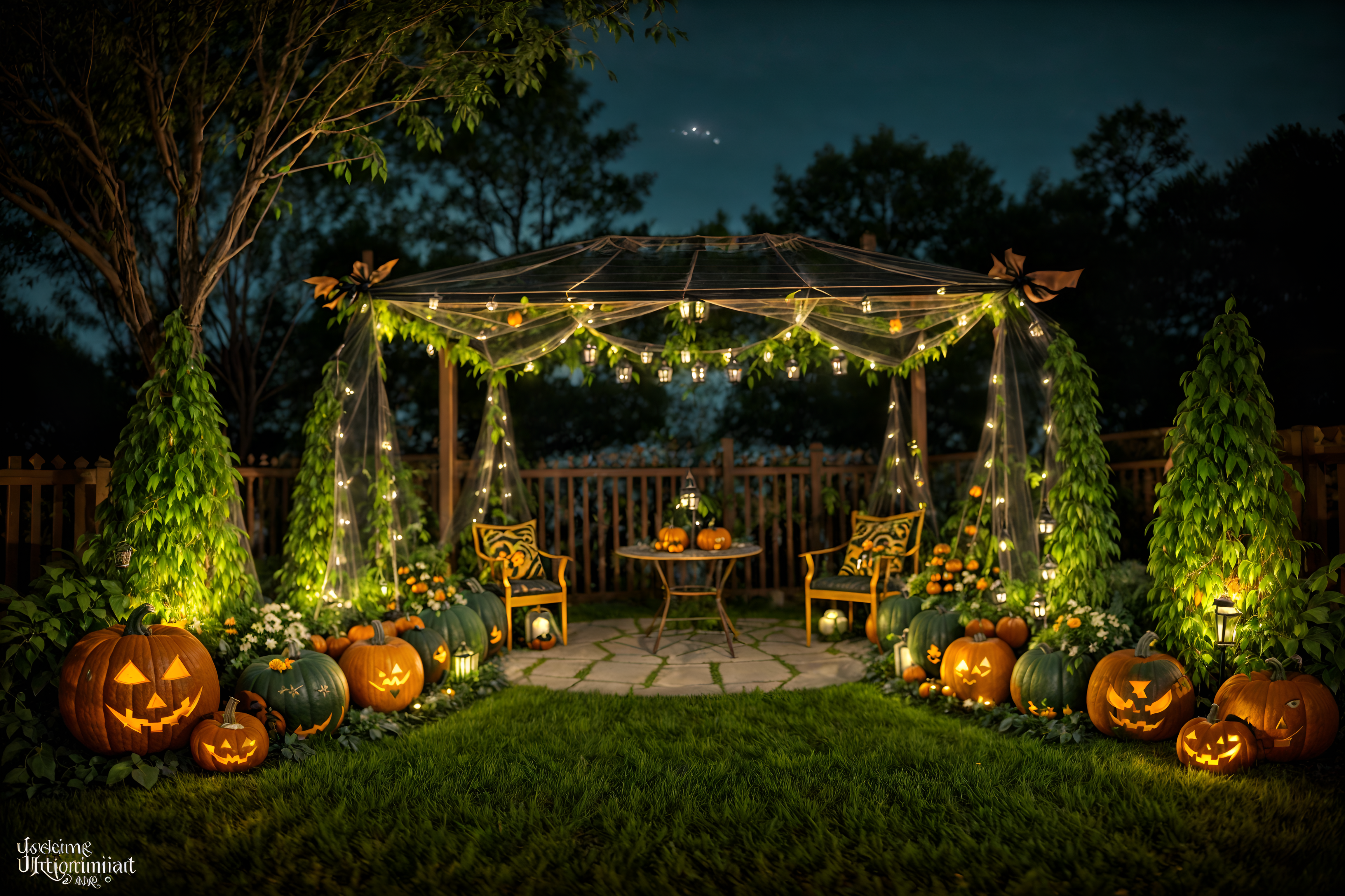 photo from pinterest of halloween-style designed (outdoor garden ) with garden plants and garden tree and grass and garden plants. . with glowing pumpkins and spiderwebs and lanterns and human skulls and lanterns and cobwebs and skeletons sitting and standing and yellow black balloons. . cinematic photo, highly detailed, cinematic lighting, ultra-detailed, ultrarealistic, photorealism, 8k. trending on pinterest. halloween design style. masterpiece, cinematic light, ultrarealistic+, photorealistic+, 8k, raw photo, realistic, sharp focus on eyes, (symmetrical eyes), (intact eyes), hyperrealistic, highest quality, best quality, , highly detailed, masterpiece, best quality, extremely detailed 8k wallpaper, masterpiece, best quality, ultra-detailed, best shadow, detailed background, detailed face, detailed eyes, high contrast, best illumination, detailed face, dulux, caustic, dynamic angle, detailed glow. dramatic lighting. highly detailed, insanely detailed hair, symmetrical, intricate details, professionally retouched, 8k high definition. strong bokeh. award winning photo.