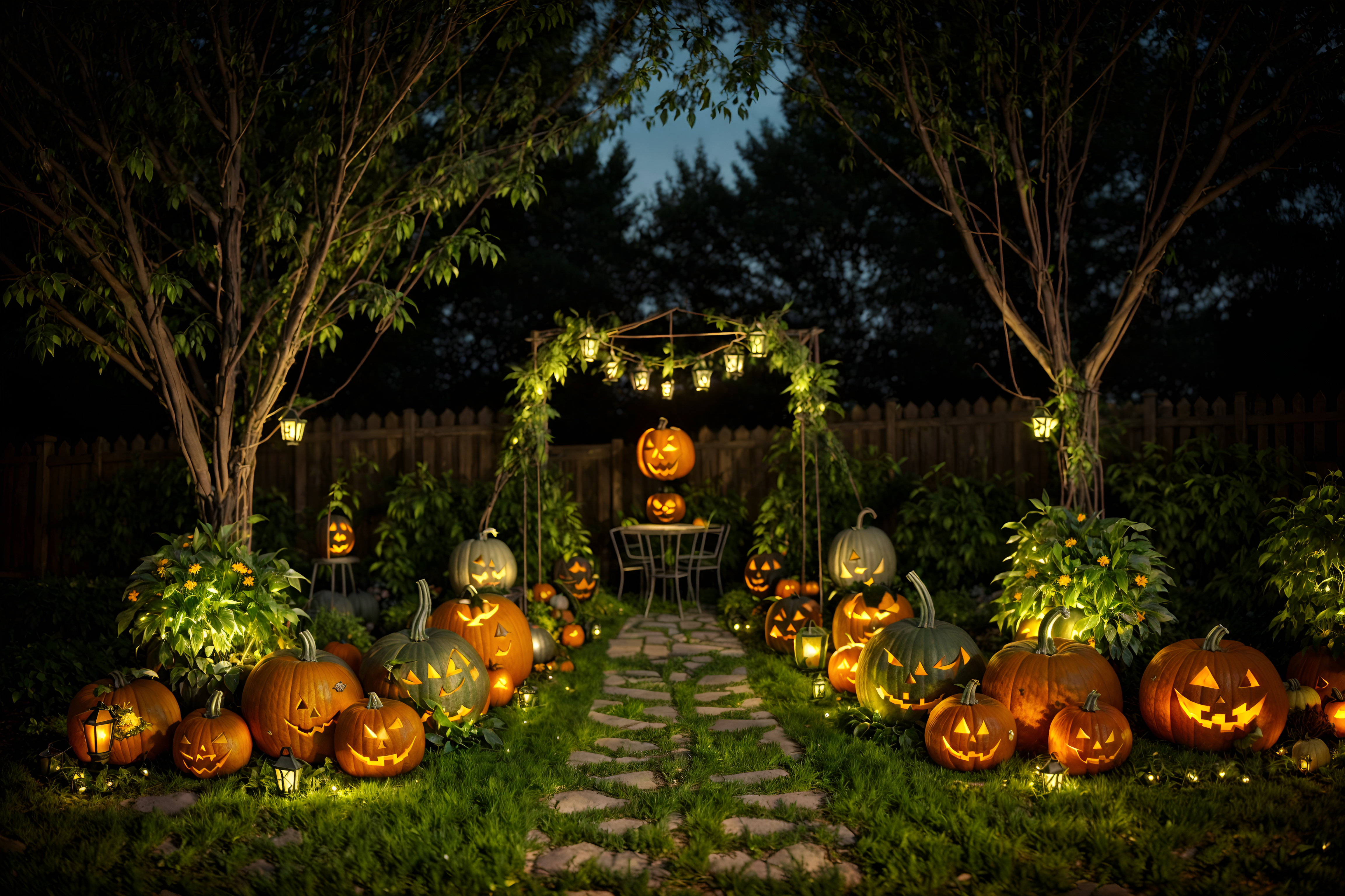 photo from pinterest of halloween-style designed (outdoor garden ) with garden plants and garden tree and grass and garden plants. . with glowing pumpkins and spiderwebs and lanterns and human skulls and lanterns and cobwebs and skeletons sitting and standing and yellow black balloons. . cinematic photo, highly detailed, cinematic lighting, ultra-detailed, ultrarealistic, photorealism, 8k. trending on pinterest. halloween design style. masterpiece, cinematic light, ultrarealistic+, photorealistic+, 8k, raw photo, realistic, sharp focus on eyes, (symmetrical eyes), (intact eyes), hyperrealistic, highest quality, best quality, , highly detailed, masterpiece, best quality, extremely detailed 8k wallpaper, masterpiece, best quality, ultra-detailed, best shadow, detailed background, detailed face, detailed eyes, high contrast, best illumination, detailed face, dulux, caustic, dynamic angle, detailed glow. dramatic lighting. highly detailed, insanely detailed hair, symmetrical, intricate details, professionally retouched, 8k high definition. strong bokeh. award winning photo.