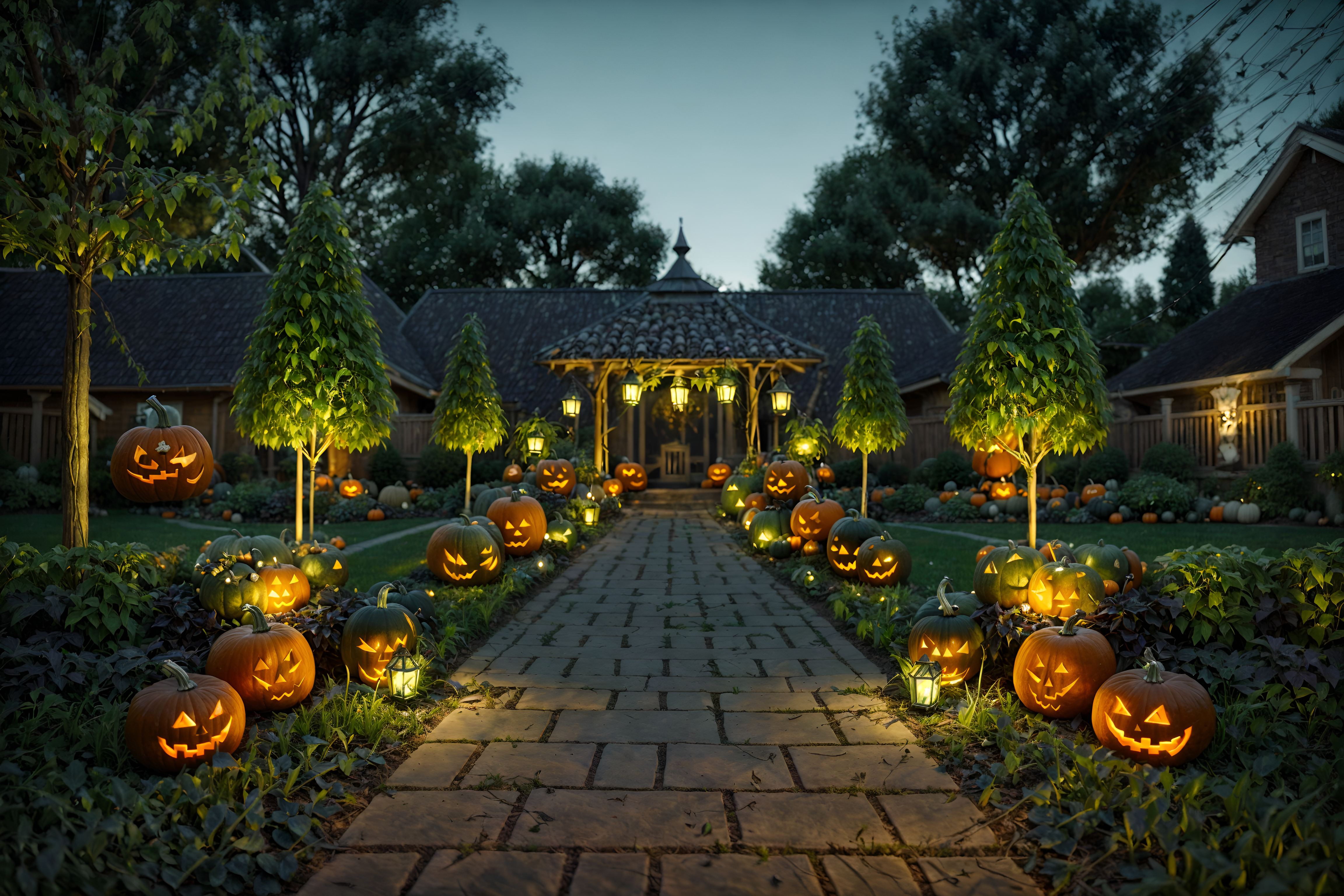 halloween outdoor gardensinterior decorate this outdoor garden with halloween style. . . with grass and garden plants and garden tree and grass. . with lanterns and cobwebs and spiderwebs and yellow black balloons and lanterns and skeletons sitting and standing and glowing pumpkins and human skulls. . .