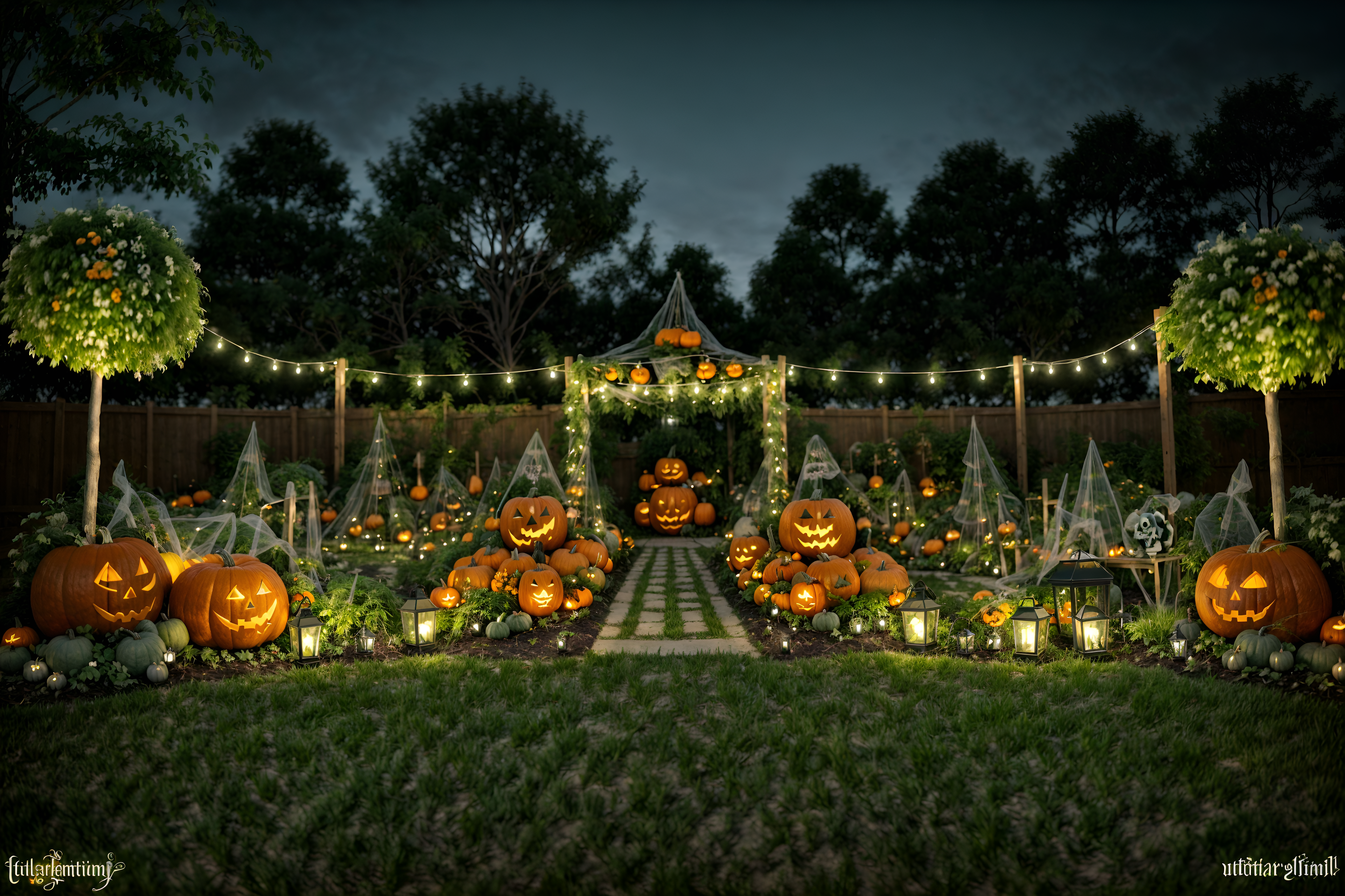 photo from pinterest of halloween-style designed (outdoor garden ) with garden plants and garden tree and grass and garden plants. . with glowing pumpkins and spiderwebs and lanterns and human skulls and lanterns and cobwebs and skeletons sitting and standing and yellow black balloons. . cinematic photo, highly detailed, cinematic lighting, ultra-detailed, ultrarealistic, photorealism, 8k. trending on pinterest. halloween design style. masterpiece, cinematic light, ultrarealistic+, photorealistic+, 8k, raw photo, realistic, sharp focus on eyes, (symmetrical eyes), (intact eyes), hyperrealistic, highest quality, best quality, , highly detailed, masterpiece, best quality, extremely detailed 8k wallpaper, masterpiece, best quality, ultra-detailed, best shadow, detailed background, detailed face, detailed eyes, high contrast, best illumination, detailed face, dulux, caustic, dynamic angle, detailed glow. dramatic lighting. highly detailed, insanely detailed hair, symmetrical, intricate details, professionally retouched, 8k high definition. strong bokeh. award winning photo.