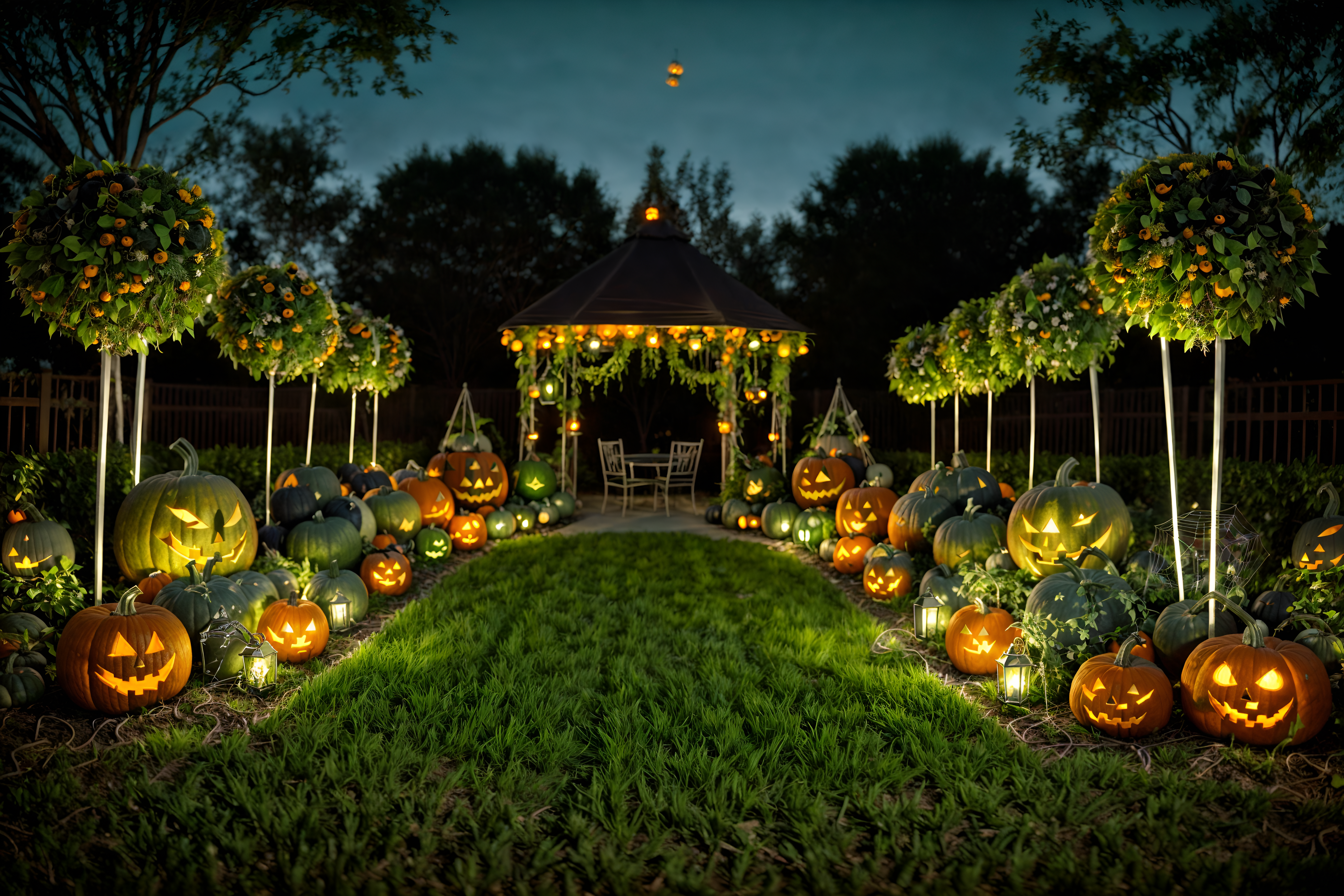 photo from pinterest of halloween-style designed (outdoor garden ) with garden plants and garden tree and grass and garden plants. . with glowing pumpkins and spiderwebs and lanterns and human skulls and lanterns and cobwebs and skeletons sitting and standing and yellow black balloons. . cinematic photo, highly detailed, cinematic lighting, ultra-detailed, ultrarealistic, photorealism, 8k. trending on pinterest. halloween design style. masterpiece, cinematic light, ultrarealistic+, photorealistic+, 8k, raw photo, realistic, sharp focus on eyes, (symmetrical eyes), (intact eyes), hyperrealistic, highest quality, best quality, , highly detailed, masterpiece, best quality, extremely detailed 8k wallpaper, masterpiece, best quality, ultra-detailed, best shadow, detailed background, detailed face, detailed eyes, high contrast, best illumination, detailed face, dulux, caustic, dynamic angle, detailed glow. dramatic lighting. highly detailed, insanely detailed hair, symmetrical, intricate details, professionally retouched, 8k high definition. strong bokeh. award winning photo.
