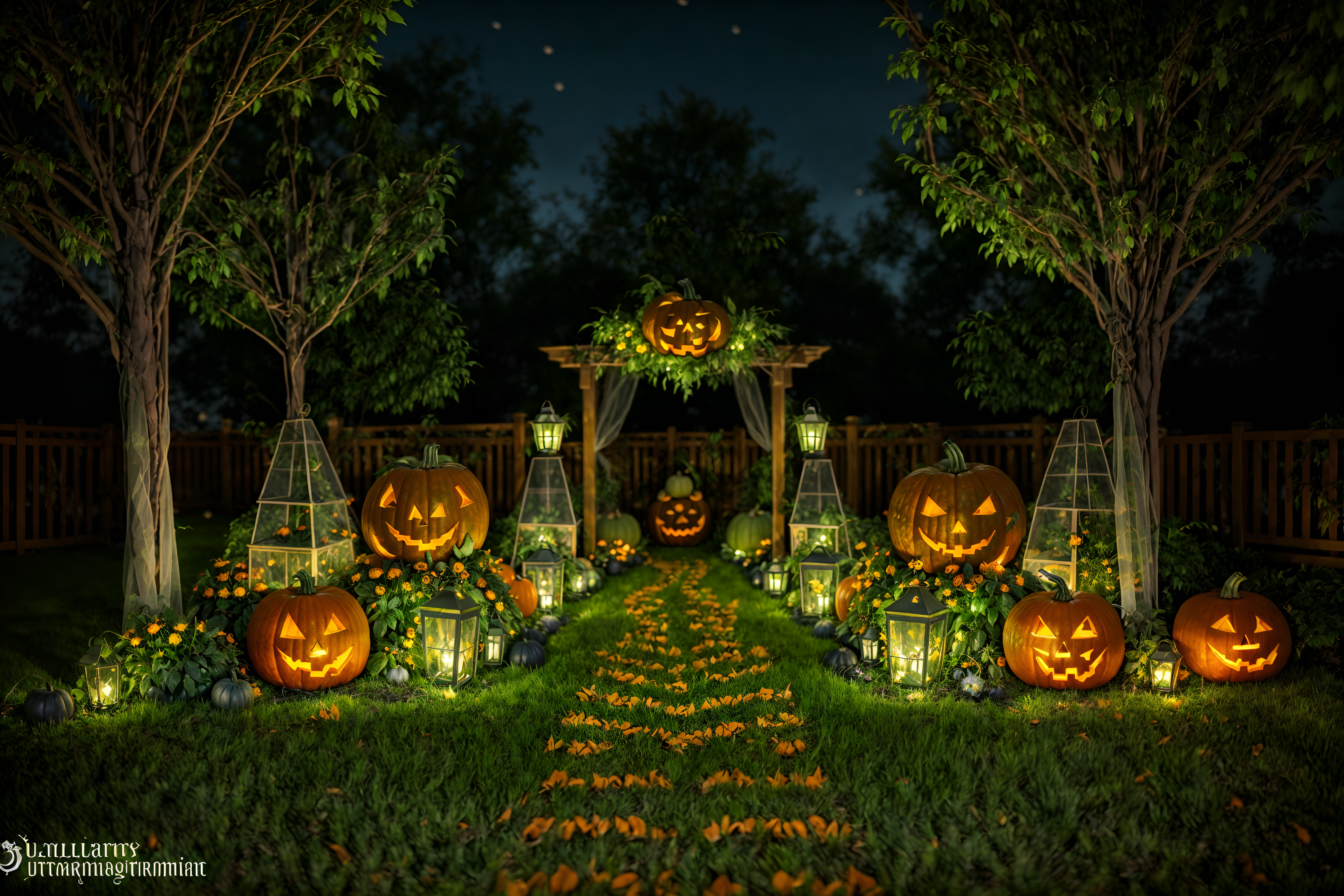 photo from pinterest of halloween-style designed (outdoor garden ) with garden plants and garden tree and grass and garden plants. . with glowing pumpkins and spiderwebs and lanterns and human skulls and lanterns and cobwebs and skeletons sitting and standing and yellow black balloons. . cinematic photo, highly detailed, cinematic lighting, ultra-detailed, ultrarealistic, photorealism, 8k. trending on pinterest. halloween design style. masterpiece, cinematic light, ultrarealistic+, photorealistic+, 8k, raw photo, realistic, sharp focus on eyes, (symmetrical eyes), (intact eyes), hyperrealistic, highest quality, best quality, , highly detailed, masterpiece, best quality, extremely detailed 8k wallpaper, masterpiece, best quality, ultra-detailed, best shadow, detailed background, detailed face, detailed eyes, high contrast, best illumination, detailed face, dulux, caustic, dynamic angle, detailed glow. dramatic lighting. highly detailed, insanely detailed hair, symmetrical, intricate details, professionally retouched, 8k high definition. strong bokeh. award winning photo.