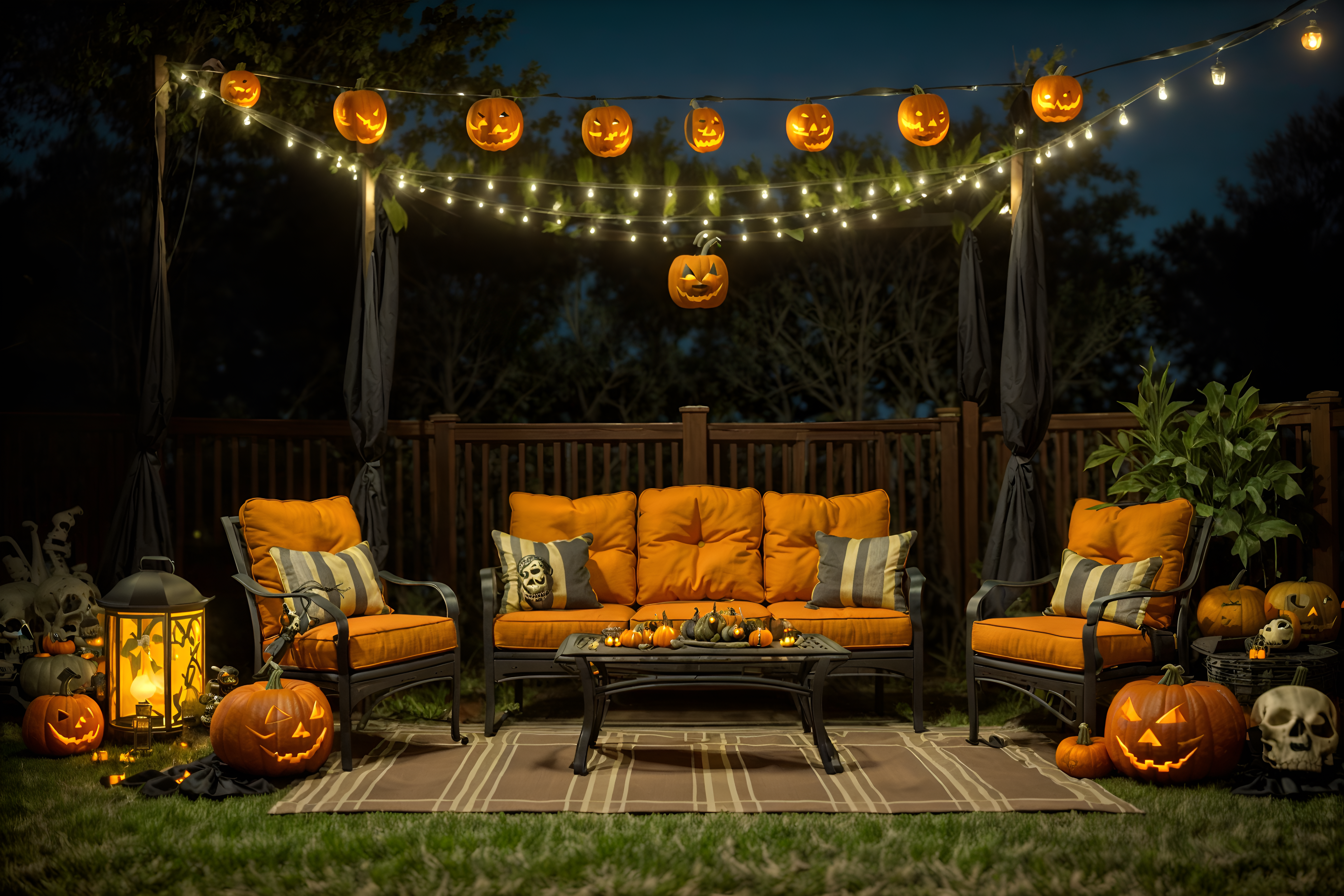halloween outdoor patiosinterior decorate this outdoor patio with halloween style. . . with plant and patio couch with pillows and deck with deck chairs and barbeque or grill and grass and plant. . with skeletons sitting and standing and spiderwebs and lanterns and yellow black balloons and glowing pumpkins and cobwebs and cobwebs and lanterns. . .