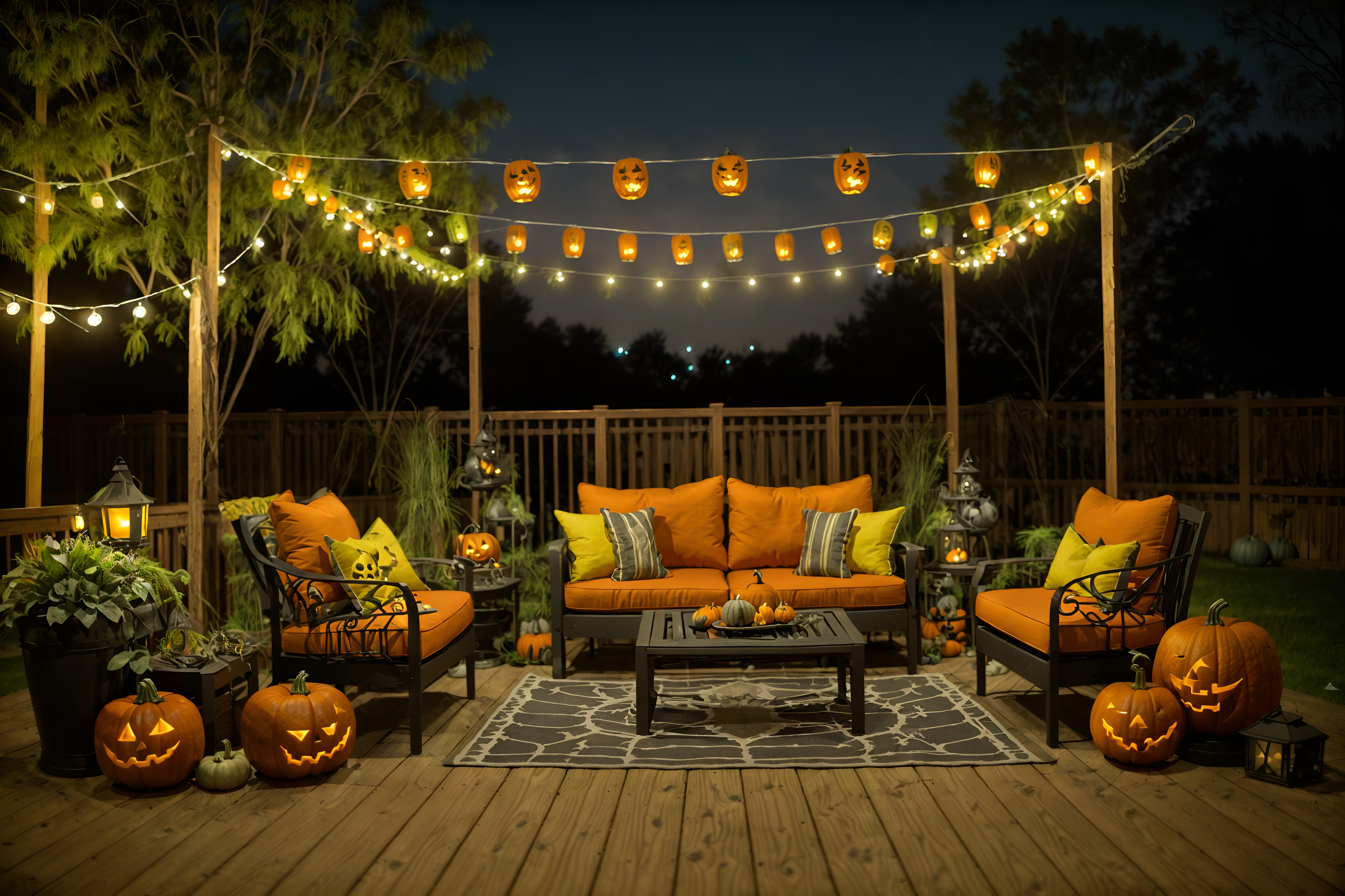 halloween outdoor patiosinterior decorate this outdoor patio with halloween style. . . with plant and patio couch with pillows and deck with deck chairs and barbeque or grill and grass and plant. . with skeletons sitting and standing and spiderwebs and lanterns and yellow black balloons and glowing pumpkins and cobwebs and cobwebs and lanterns. . .