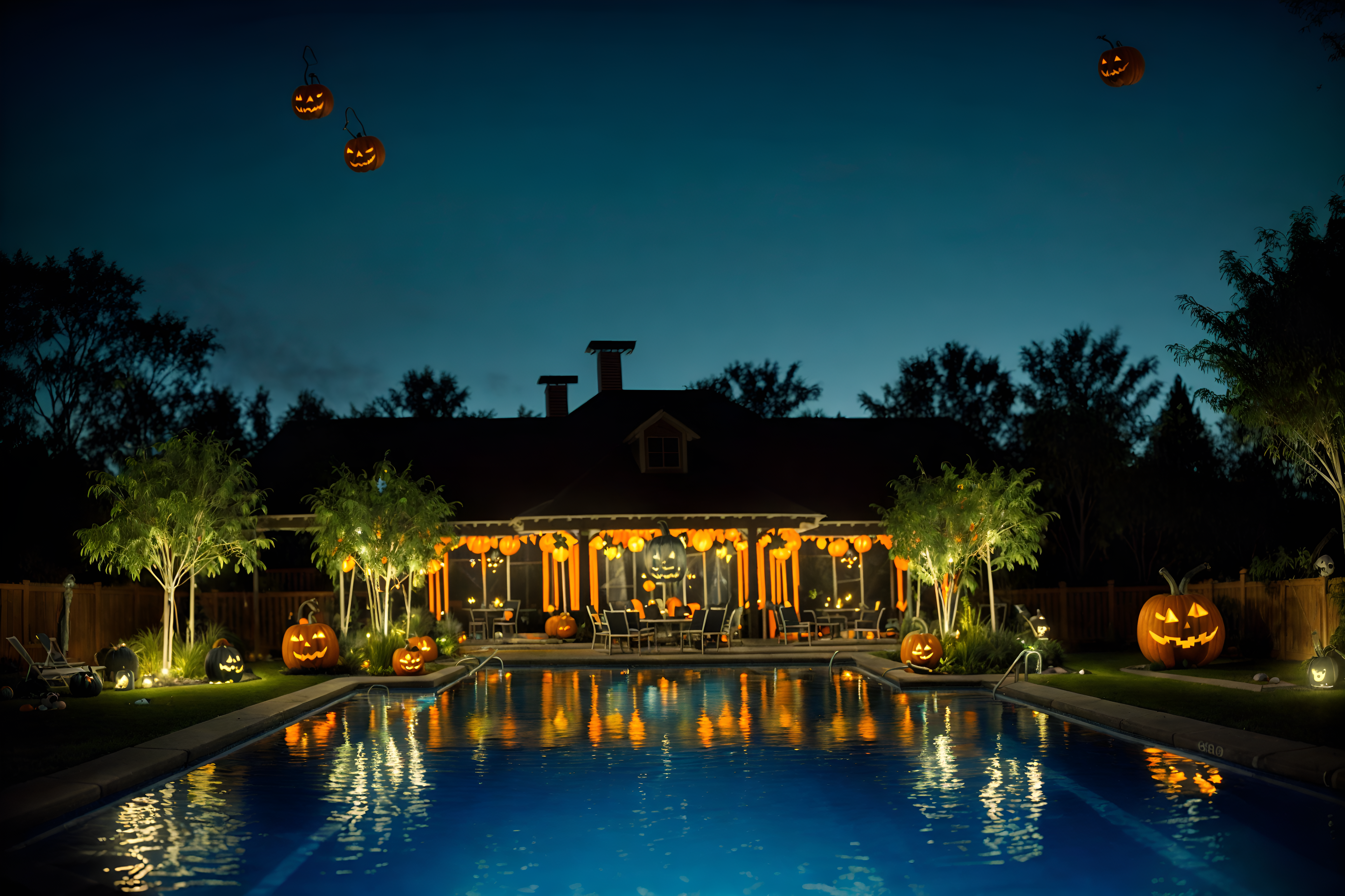 photo from pinterest of halloween-style designed (outdoor pool area ) with pool and pool lights and pool lounge chairs and pool. . with spiderwebs and glowing pumpkins and cobwebs and yellow black balloons and skeletons sitting and standing and human skulls and cobwebs and lanterns. . cinematic photo, highly detailed, cinematic lighting, ultra-detailed, ultrarealistic, photorealism, 8k. trending on pinterest. halloween design style. masterpiece, cinematic light, ultrarealistic+, photorealistic+, 8k, raw photo, realistic, sharp focus on eyes, (symmetrical eyes), (intact eyes), hyperrealistic, highest quality, best quality, , highly detailed, masterpiece, best quality, extremely detailed 8k wallpaper, masterpiece, best quality, ultra-detailed, best shadow, detailed background, detailed face, detailed eyes, high contrast, best illumination, detailed face, dulux, caustic, dynamic angle, detailed glow. dramatic lighting. highly detailed, insanely detailed hair, symmetrical, intricate details, professionally retouched, 8k high definition. strong bokeh. award winning photo.