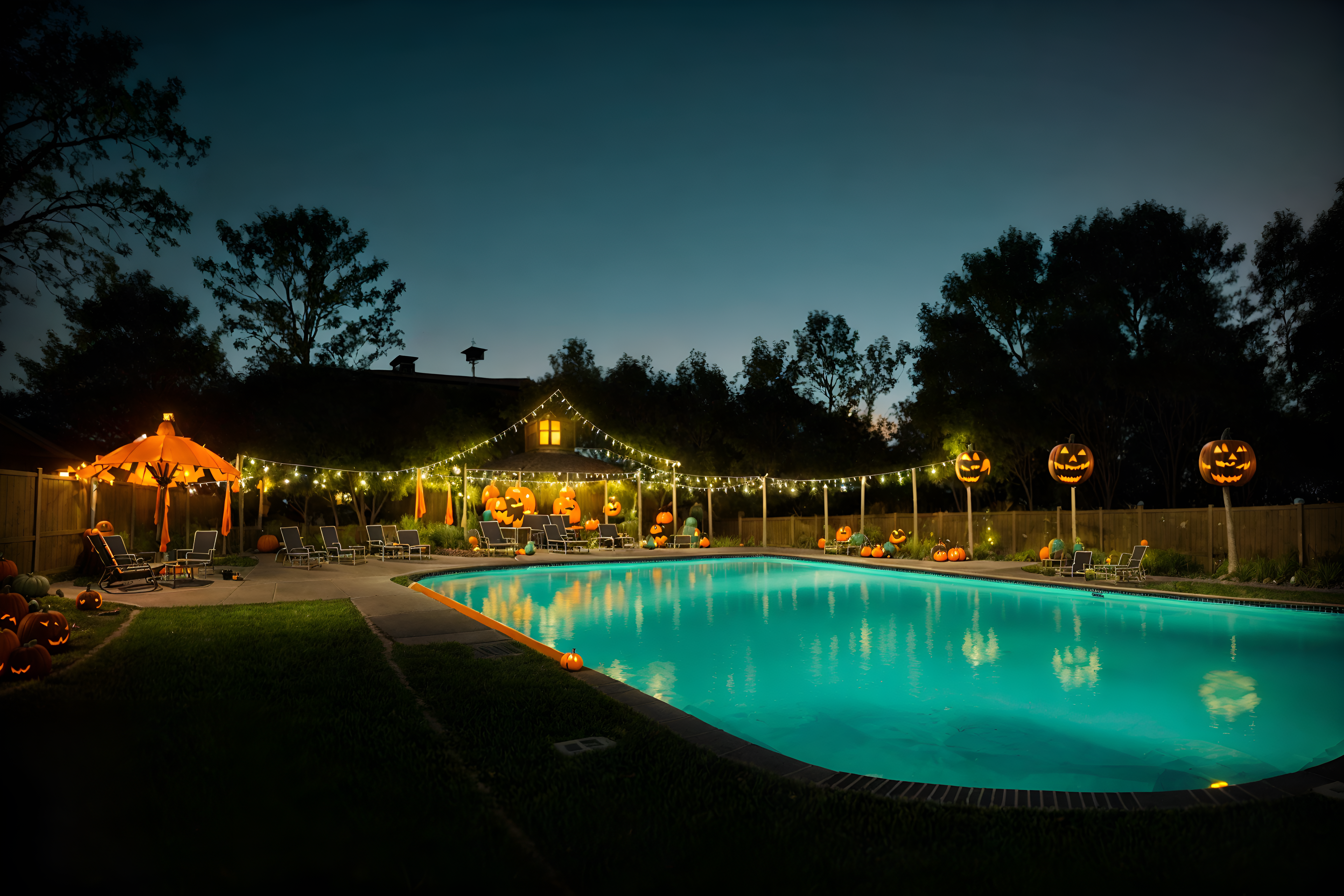 photo from pinterest of halloween-style designed (outdoor pool area ) with pool and pool lights and pool lounge chairs and pool. . with spiderwebs and glowing pumpkins and cobwebs and yellow black balloons and skeletons sitting and standing and human skulls and cobwebs and lanterns. . cinematic photo, highly detailed, cinematic lighting, ultra-detailed, ultrarealistic, photorealism, 8k. trending on pinterest. halloween design style. masterpiece, cinematic light, ultrarealistic+, photorealistic+, 8k, raw photo, realistic, sharp focus on eyes, (symmetrical eyes), (intact eyes), hyperrealistic, highest quality, best quality, , highly detailed, masterpiece, best quality, extremely detailed 8k wallpaper, masterpiece, best quality, ultra-detailed, best shadow, detailed background, detailed face, detailed eyes, high contrast, best illumination, detailed face, dulux, caustic, dynamic angle, detailed glow. dramatic lighting. highly detailed, insanely detailed hair, symmetrical, intricate details, professionally retouched, 8k high definition. strong bokeh. award winning photo.