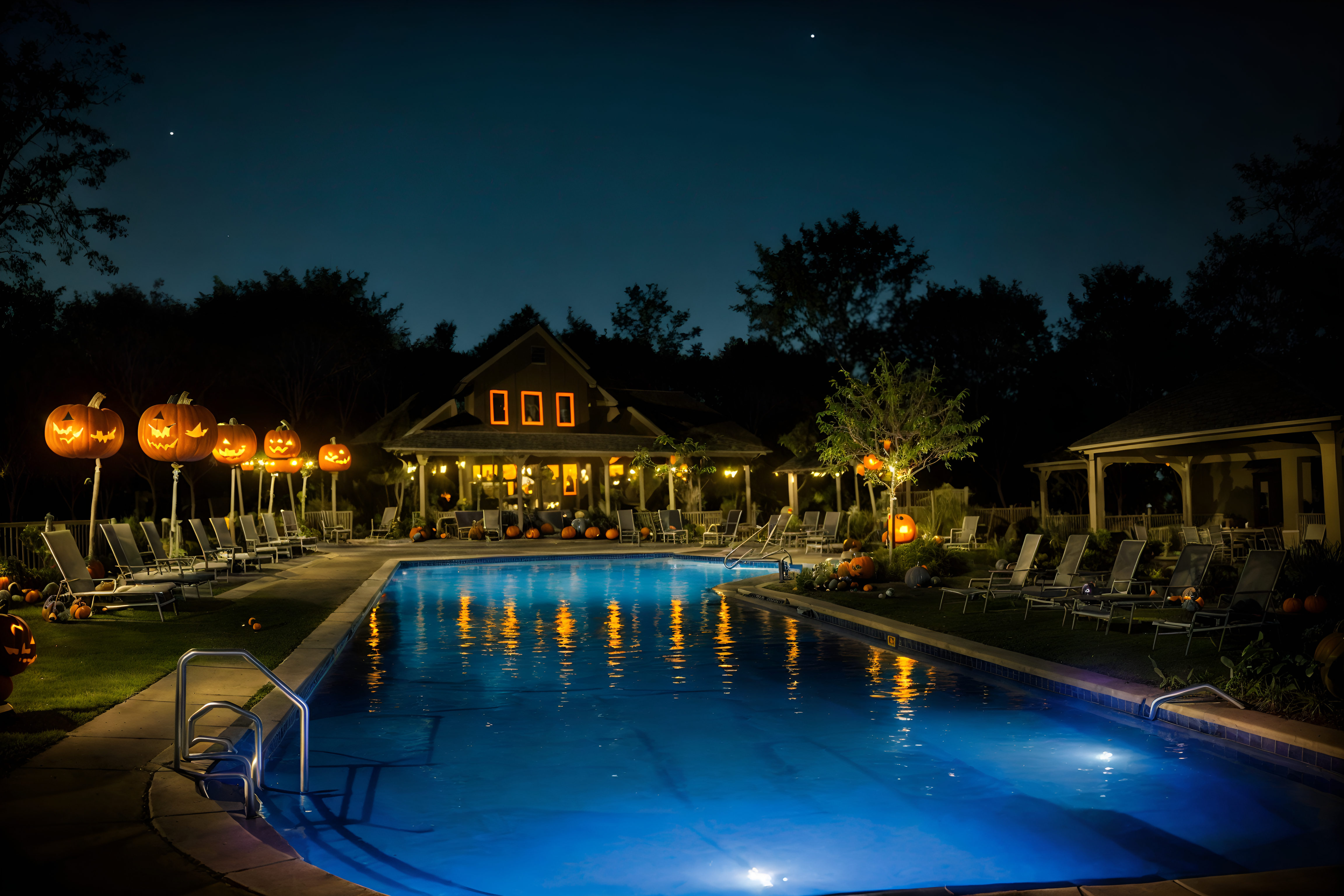 photo from pinterest of halloween-style designed (outdoor pool area ) with pool and pool lights and pool lounge chairs and pool. . with spiderwebs and glowing pumpkins and cobwebs and yellow black balloons and skeletons sitting and standing and human skulls and cobwebs and lanterns. . cinematic photo, highly detailed, cinematic lighting, ultra-detailed, ultrarealistic, photorealism, 8k. trending on pinterest. halloween design style. masterpiece, cinematic light, ultrarealistic+, photorealistic+, 8k, raw photo, realistic, sharp focus on eyes, (symmetrical eyes), (intact eyes), hyperrealistic, highest quality, best quality, , highly detailed, masterpiece, best quality, extremely detailed 8k wallpaper, masterpiece, best quality, ultra-detailed, best shadow, detailed background, detailed face, detailed eyes, high contrast, best illumination, detailed face, dulux, caustic, dynamic angle, detailed glow. dramatic lighting. highly detailed, insanely detailed hair, symmetrical, intricate details, professionally retouched, 8k high definition. strong bokeh. award winning photo.