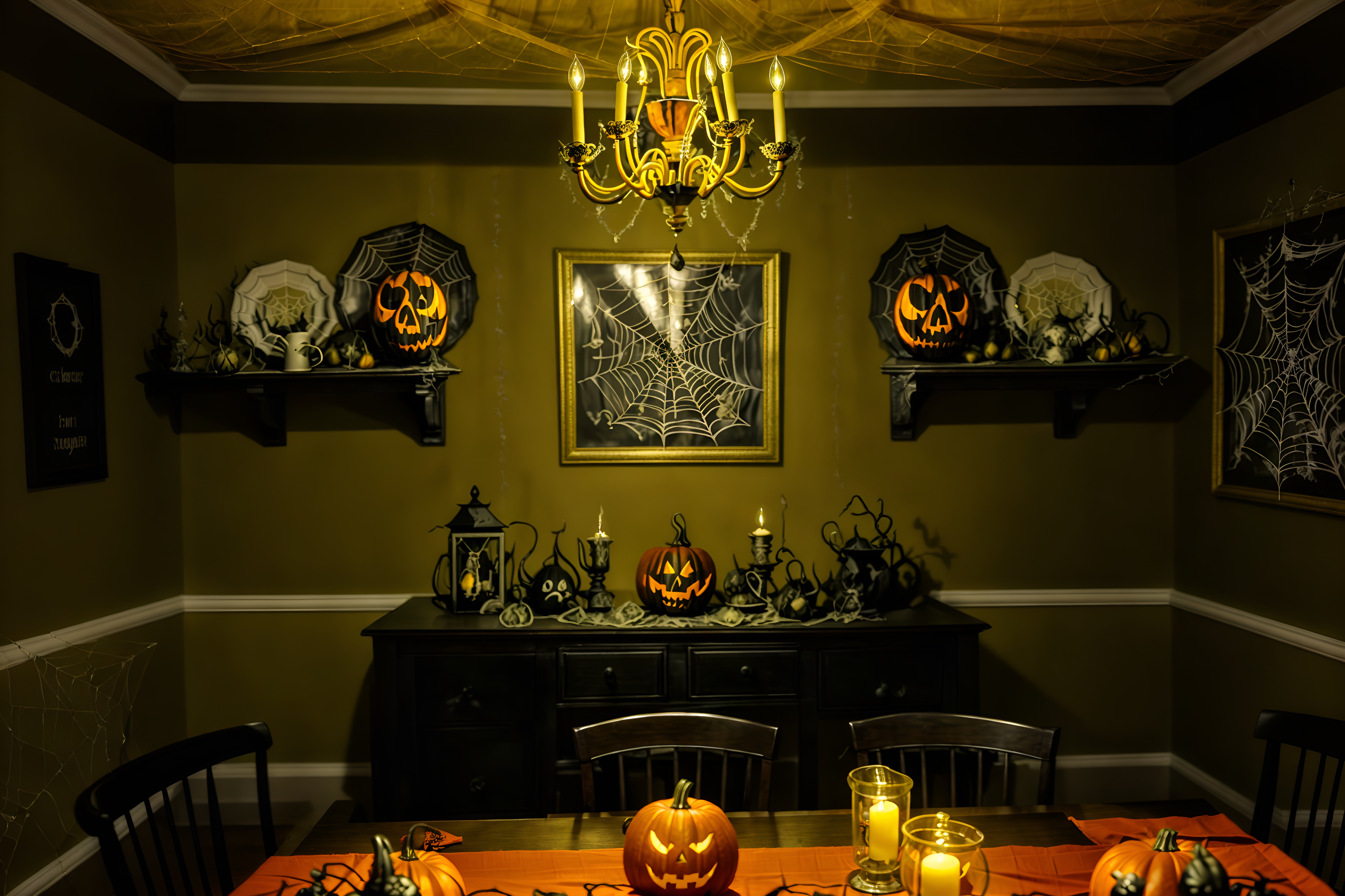 photo from pinterest of halloween-style interior designed (dining room interior) with plant and table cloth and painting or photo on wall and bookshelves and light or chandelier and dining table and vase and plates, cutlery and glasses on dining table. . with spiderwebs and cobwebs and lanterns and cobwebs and yellow black balloons and lanterns and glowing pumpkins and human skulls. . cinematic photo, highly detailed, cinematic lighting, ultra-detailed, ultrarealistic, photorealism, 8k. trending on pinterest. halloween interior design style. masterpiece, cinematic light, ultrarealistic+, photorealistic+, 8k, raw photo, realistic, sharp focus on eyes, (symmetrical eyes), (intact eyes), hyperrealistic, highest quality, best quality, , highly detailed, masterpiece, best quality, extremely detailed 8k wallpaper, masterpiece, best quality, ultra-detailed, best shadow, detailed background, detailed face, detailed eyes, high contrast, best illumination, detailed face, dulux, caustic, dynamic angle, detailed glow. dramatic lighting. highly detailed, insanely detailed hair, symmetrical, intricate details, professionally retouched, 8k high definition. strong bokeh. award winning photo.