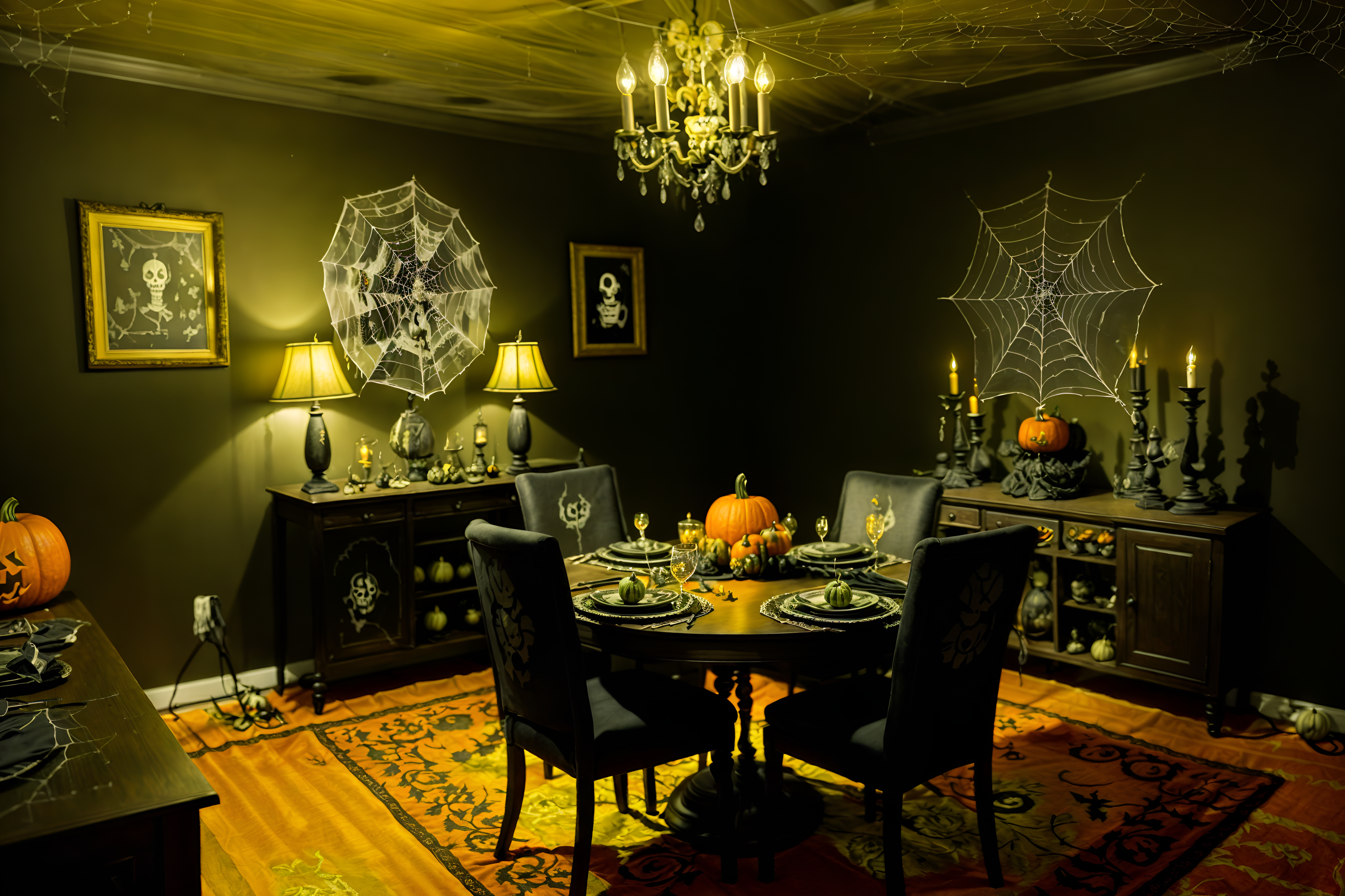 photo from pinterest of halloween-style interior designed (dining room interior) with plant and table cloth and painting or photo on wall and bookshelves and light or chandelier and dining table and vase and plates, cutlery and glasses on dining table. . with spiderwebs and cobwebs and lanterns and cobwebs and yellow black balloons and lanterns and glowing pumpkins and human skulls. . cinematic photo, highly detailed, cinematic lighting, ultra-detailed, ultrarealistic, photorealism, 8k. trending on pinterest. halloween interior design style. masterpiece, cinematic light, ultrarealistic+, photorealistic+, 8k, raw photo, realistic, sharp focus on eyes, (symmetrical eyes), (intact eyes), hyperrealistic, highest quality, best quality, , highly detailed, masterpiece, best quality, extremely detailed 8k wallpaper, masterpiece, best quality, ultra-detailed, best shadow, detailed background, detailed face, detailed eyes, high contrast, best illumination, detailed face, dulux, caustic, dynamic angle, detailed glow. dramatic lighting. highly detailed, insanely detailed hair, symmetrical, intricate details, professionally retouched, 8k high definition. strong bokeh. award winning photo.
