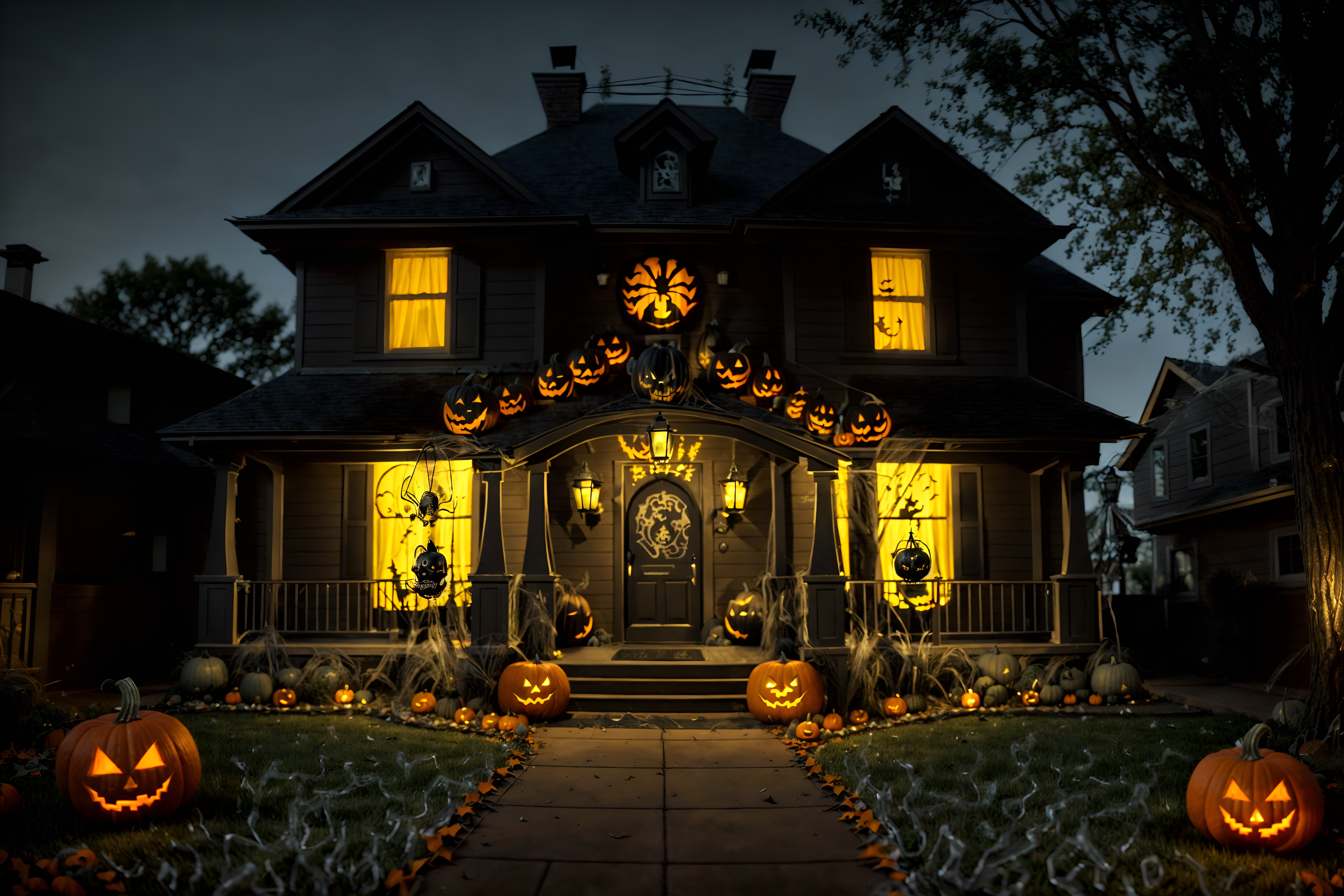 photo from pinterest of halloween-style exterior designed (house exterior exterior) . with cobwebs and spiderwebs and yellow black balloons and cobwebs and lanterns and lanterns and glowing pumpkins and human skulls. . cinematic photo, highly detailed, cinematic lighting, ultra-detailed, ultrarealistic, photorealism, 8k. trending on pinterest. halloween exterior design style. masterpiece, cinematic light, ultrarealistic+, photorealistic+, 8k, raw photo, realistic, sharp focus on eyes, (symmetrical eyes), (intact eyes), hyperrealistic, highest quality, best quality, , highly detailed, masterpiece, best quality, extremely detailed 8k wallpaper, masterpiece, best quality, ultra-detailed, best shadow, detailed background, detailed face, detailed eyes, high contrast, best illumination, detailed face, dulux, caustic, dynamic angle, detailed glow. dramatic lighting. highly detailed, insanely detailed hair, symmetrical, intricate details, professionally retouched, 8k high definition. strong bokeh. award winning photo.