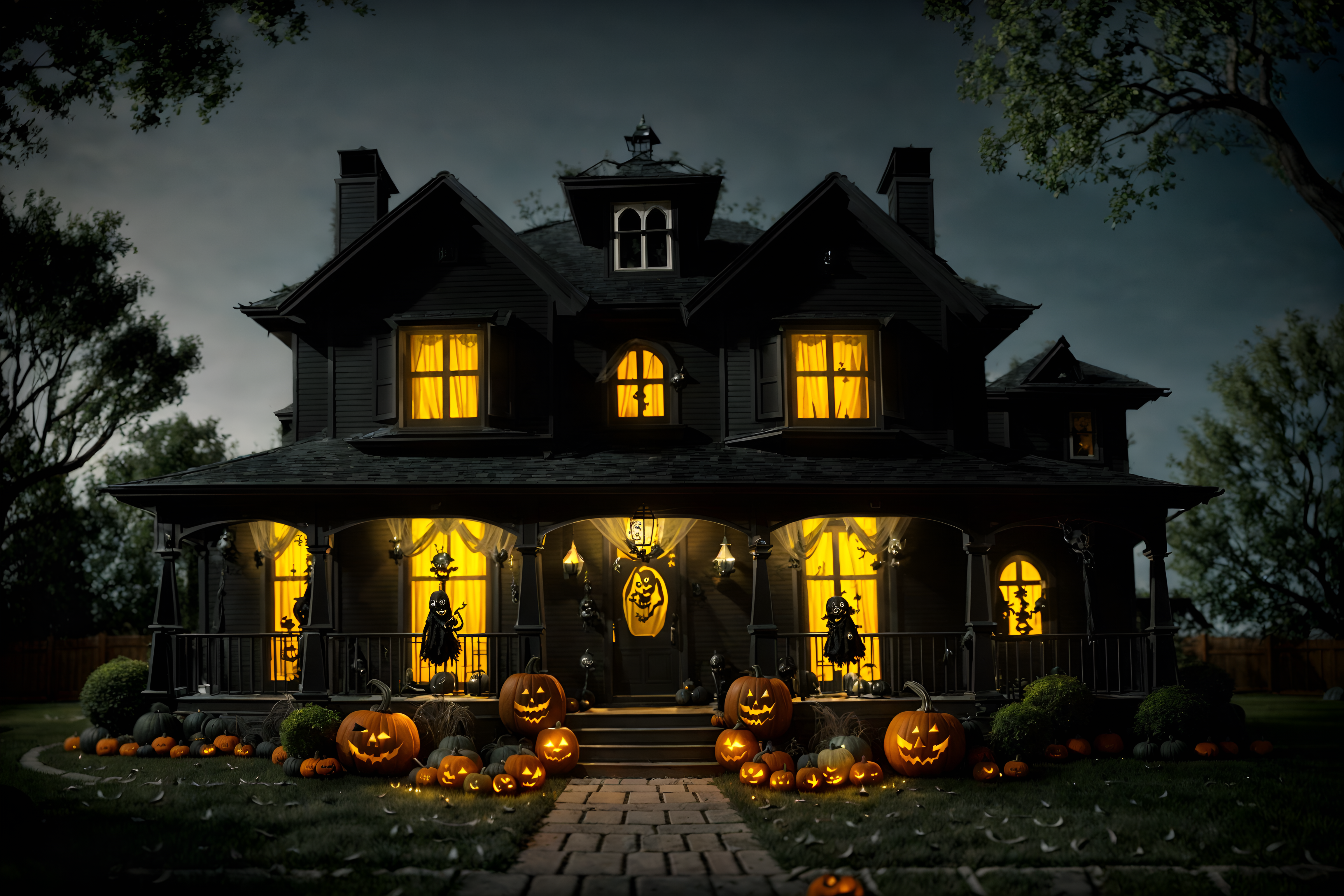 photo from pinterest of halloween-style exterior designed (house exterior exterior) . with cobwebs and spiderwebs and yellow black balloons and cobwebs and lanterns and lanterns and glowing pumpkins and human skulls. . cinematic photo, highly detailed, cinematic lighting, ultra-detailed, ultrarealistic, photorealism, 8k. trending on pinterest. halloween exterior design style. masterpiece, cinematic light, ultrarealistic+, photorealistic+, 8k, raw photo, realistic, sharp focus on eyes, (symmetrical eyes), (intact eyes), hyperrealistic, highest quality, best quality, , highly detailed, masterpiece, best quality, extremely detailed 8k wallpaper, masterpiece, best quality, ultra-detailed, best shadow, detailed background, detailed face, detailed eyes, high contrast, best illumination, detailed face, dulux, caustic, dynamic angle, detailed glow. dramatic lighting. highly detailed, insanely detailed hair, symmetrical, intricate details, professionally retouched, 8k high definition. strong bokeh. award winning photo.