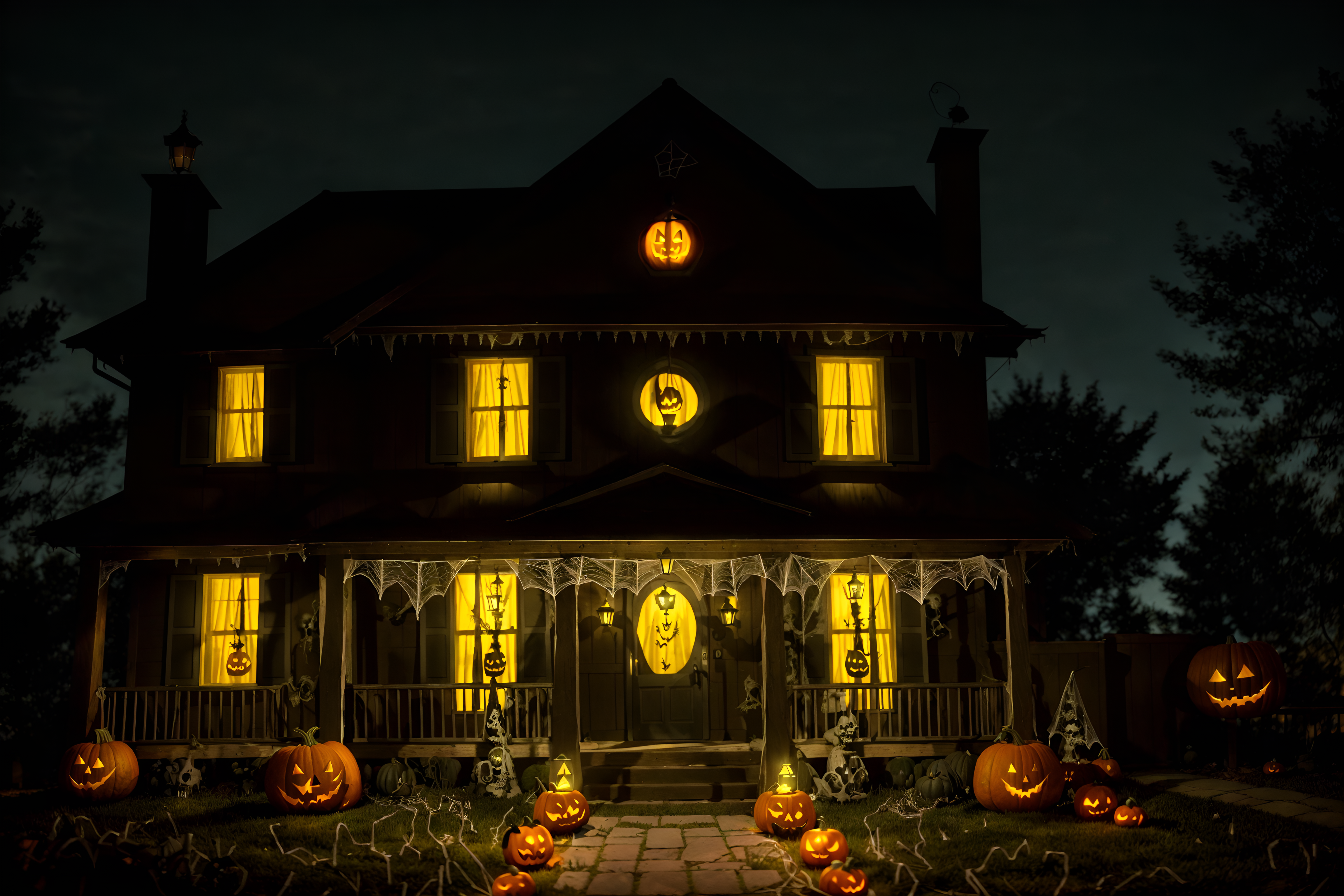 photo from pinterest of halloween-style exterior designed (house exterior exterior) . with cobwebs and spiderwebs and yellow black balloons and cobwebs and lanterns and lanterns and glowing pumpkins and human skulls. . cinematic photo, highly detailed, cinematic lighting, ultra-detailed, ultrarealistic, photorealism, 8k. trending on pinterest. halloween exterior design style. masterpiece, cinematic light, ultrarealistic+, photorealistic+, 8k, raw photo, realistic, sharp focus on eyes, (symmetrical eyes), (intact eyes), hyperrealistic, highest quality, best quality, , highly detailed, masterpiece, best quality, extremely detailed 8k wallpaper, masterpiece, best quality, ultra-detailed, best shadow, detailed background, detailed face, detailed eyes, high contrast, best illumination, detailed face, dulux, caustic, dynamic angle, detailed glow. dramatic lighting. highly detailed, insanely detailed hair, symmetrical, intricate details, professionally retouched, 8k high definition. strong bokeh. award winning photo.
