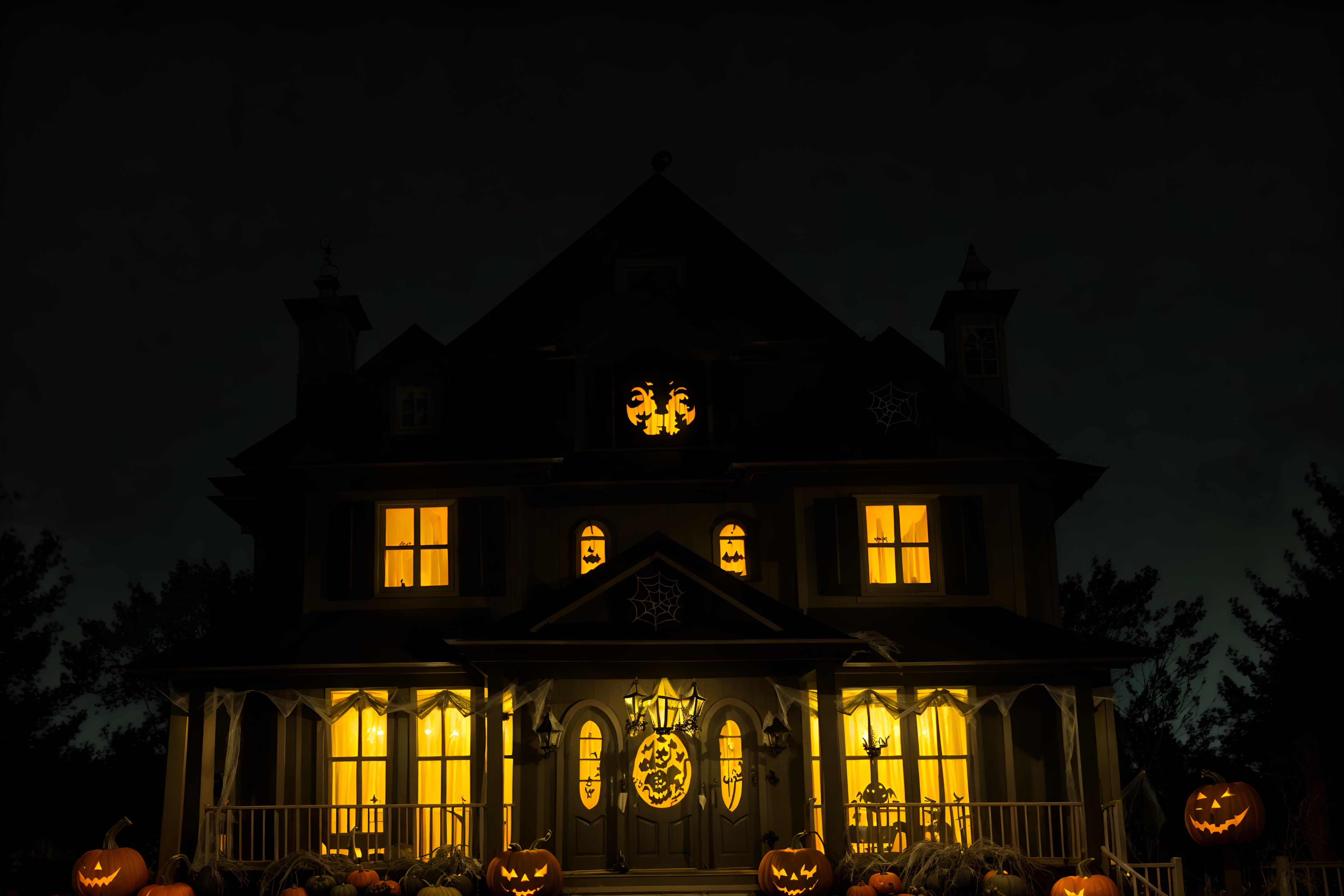 photo from pinterest of halloween-style exterior designed (house exterior exterior) . with cobwebs and spiderwebs and yellow black balloons and cobwebs and lanterns and lanterns and glowing pumpkins and human skulls. . cinematic photo, highly detailed, cinematic lighting, ultra-detailed, ultrarealistic, photorealism, 8k. trending on pinterest. halloween exterior design style. masterpiece, cinematic light, ultrarealistic+, photorealistic+, 8k, raw photo, realistic, sharp focus on eyes, (symmetrical eyes), (intact eyes), hyperrealistic, highest quality, best quality, , highly detailed, masterpiece, best quality, extremely detailed 8k wallpaper, masterpiece, best quality, ultra-detailed, best shadow, detailed background, detailed face, detailed eyes, high contrast, best illumination, detailed face, dulux, caustic, dynamic angle, detailed glow. dramatic lighting. highly detailed, insanely detailed hair, symmetrical, intricate details, professionally retouched, 8k high definition. strong bokeh. award winning photo.