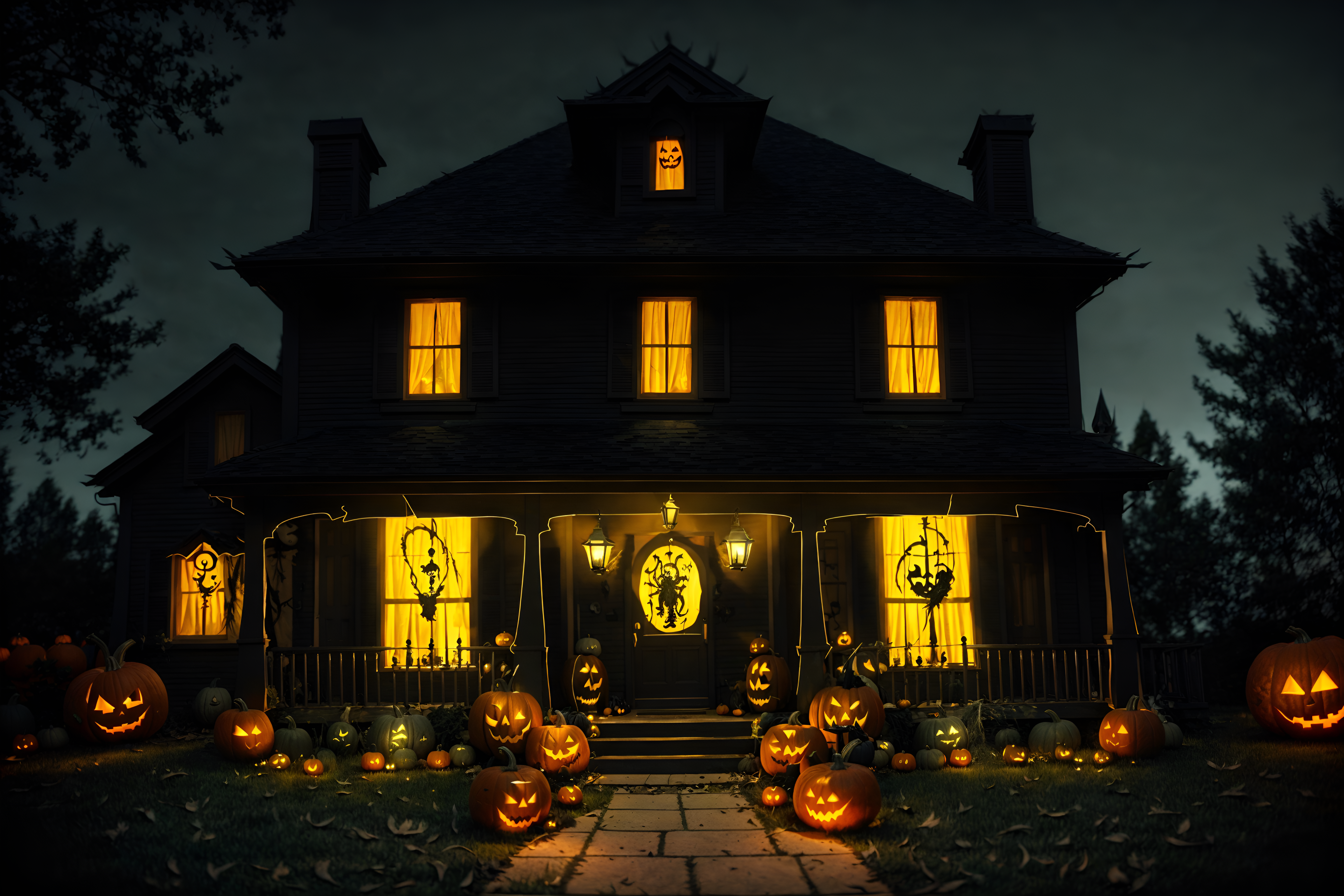 photo from pinterest of halloween-style exterior designed (house exterior exterior) . with cobwebs and spiderwebs and yellow black balloons and cobwebs and lanterns and lanterns and glowing pumpkins and human skulls. . cinematic photo, highly detailed, cinematic lighting, ultra-detailed, ultrarealistic, photorealism, 8k. trending on pinterest. halloween exterior design style. masterpiece, cinematic light, ultrarealistic+, photorealistic+, 8k, raw photo, realistic, sharp focus on eyes, (symmetrical eyes), (intact eyes), hyperrealistic, highest quality, best quality, , highly detailed, masterpiece, best quality, extremely detailed 8k wallpaper, masterpiece, best quality, ultra-detailed, best shadow, detailed background, detailed face, detailed eyes, high contrast, best illumination, detailed face, dulux, caustic, dynamic angle, detailed glow. dramatic lighting. highly detailed, insanely detailed hair, symmetrical, intricate details, professionally retouched, 8k high definition. strong bokeh. award winning photo.