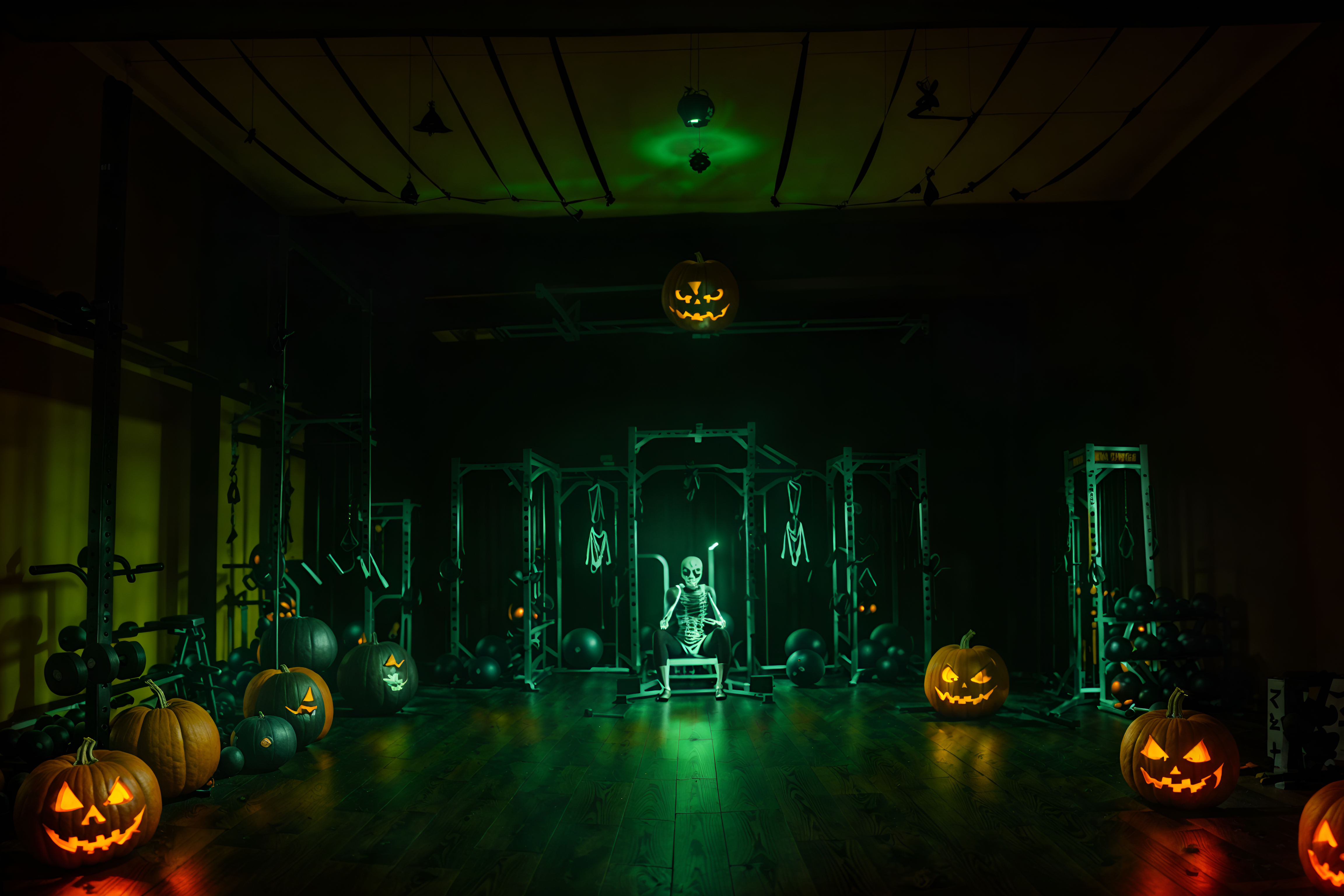 photo from pinterest of halloween-style interior designed (fitness gym interior) with dumbbell stand and crosstrainer and squat rack and bench press and exercise bicycle and dumbbell stand. . with yellow black balloons and lanterns and cobwebs and human skulls and skeletons sitting and standing and cobwebs and spiderwebs and glowing pumpkins. . cinematic photo, highly detailed, cinematic lighting, ultra-detailed, ultrarealistic, photorealism, 8k. trending on pinterest. halloween interior design style. masterpiece, cinematic light, ultrarealistic+, photorealistic+, 8k, raw photo, realistic, sharp focus on eyes, (symmetrical eyes), (intact eyes), hyperrealistic, highest quality, best quality, , highly detailed, masterpiece, best quality, extremely detailed 8k wallpaper, masterpiece, best quality, ultra-detailed, best shadow, detailed background, detailed face, detailed eyes, high contrast, best illumination, detailed face, dulux, caustic, dynamic angle, detailed glow. dramatic lighting. highly detailed, insanely detailed hair, symmetrical, intricate details, professionally retouched, 8k high definition. strong bokeh. award winning photo.
