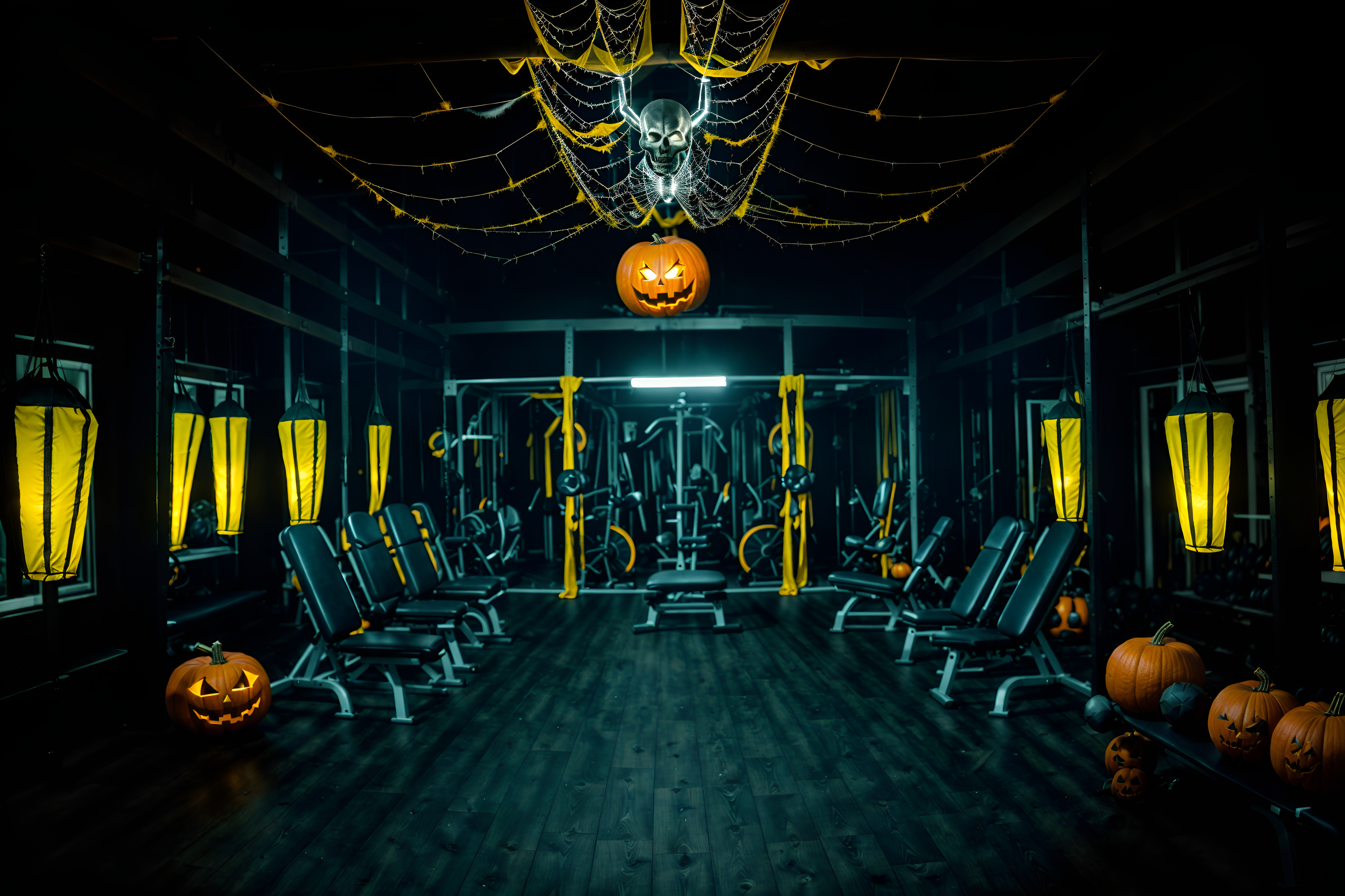 photo from pinterest of halloween-style interior designed (fitness gym interior) with dumbbell stand and crosstrainer and squat rack and bench press and exercise bicycle and dumbbell stand. . with yellow black balloons and lanterns and cobwebs and human skulls and skeletons sitting and standing and cobwebs and spiderwebs and glowing pumpkins. . cinematic photo, highly detailed, cinematic lighting, ultra-detailed, ultrarealistic, photorealism, 8k. trending on pinterest. halloween interior design style. masterpiece, cinematic light, ultrarealistic+, photorealistic+, 8k, raw photo, realistic, sharp focus on eyes, (symmetrical eyes), (intact eyes), hyperrealistic, highest quality, best quality, , highly detailed, masterpiece, best quality, extremely detailed 8k wallpaper, masterpiece, best quality, ultra-detailed, best shadow, detailed background, detailed face, detailed eyes, high contrast, best illumination, detailed face, dulux, caustic, dynamic angle, detailed glow. dramatic lighting. highly detailed, insanely detailed hair, symmetrical, intricate details, professionally retouched, 8k high definition. strong bokeh. award winning photo.