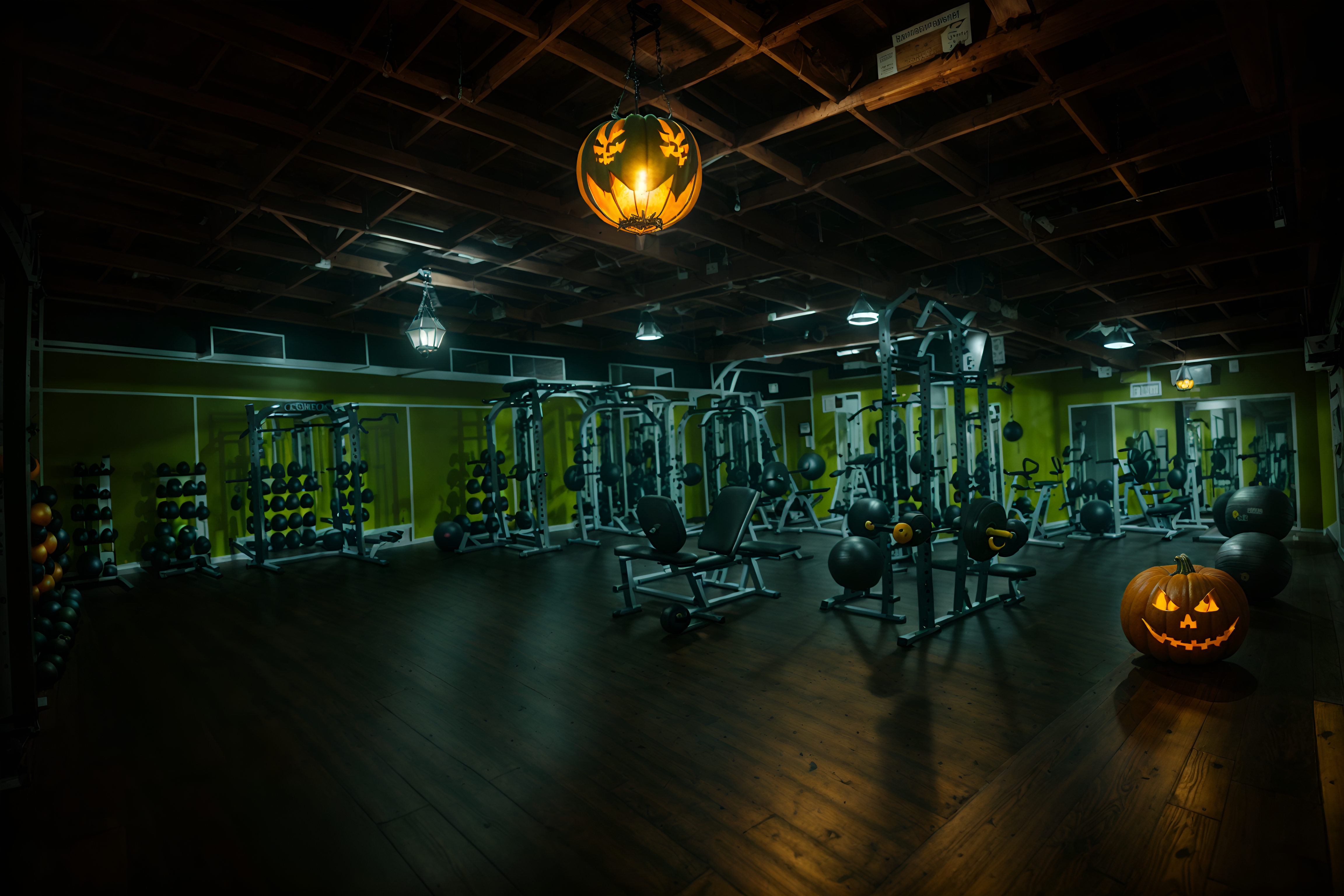 photo from pinterest of halloween-style interior designed (fitness gym interior) with dumbbell stand and crosstrainer and squat rack and bench press and exercise bicycle and dumbbell stand. . with yellow black balloons and lanterns and cobwebs and human skulls and skeletons sitting and standing and cobwebs and spiderwebs and glowing pumpkins. . cinematic photo, highly detailed, cinematic lighting, ultra-detailed, ultrarealistic, photorealism, 8k. trending on pinterest. halloween interior design style. masterpiece, cinematic light, ultrarealistic+, photorealistic+, 8k, raw photo, realistic, sharp focus on eyes, (symmetrical eyes), (intact eyes), hyperrealistic, highest quality, best quality, , highly detailed, masterpiece, best quality, extremely detailed 8k wallpaper, masterpiece, best quality, ultra-detailed, best shadow, detailed background, detailed face, detailed eyes, high contrast, best illumination, detailed face, dulux, caustic, dynamic angle, detailed glow. dramatic lighting. highly detailed, insanely detailed hair, symmetrical, intricate details, professionally retouched, 8k high definition. strong bokeh. award winning photo.