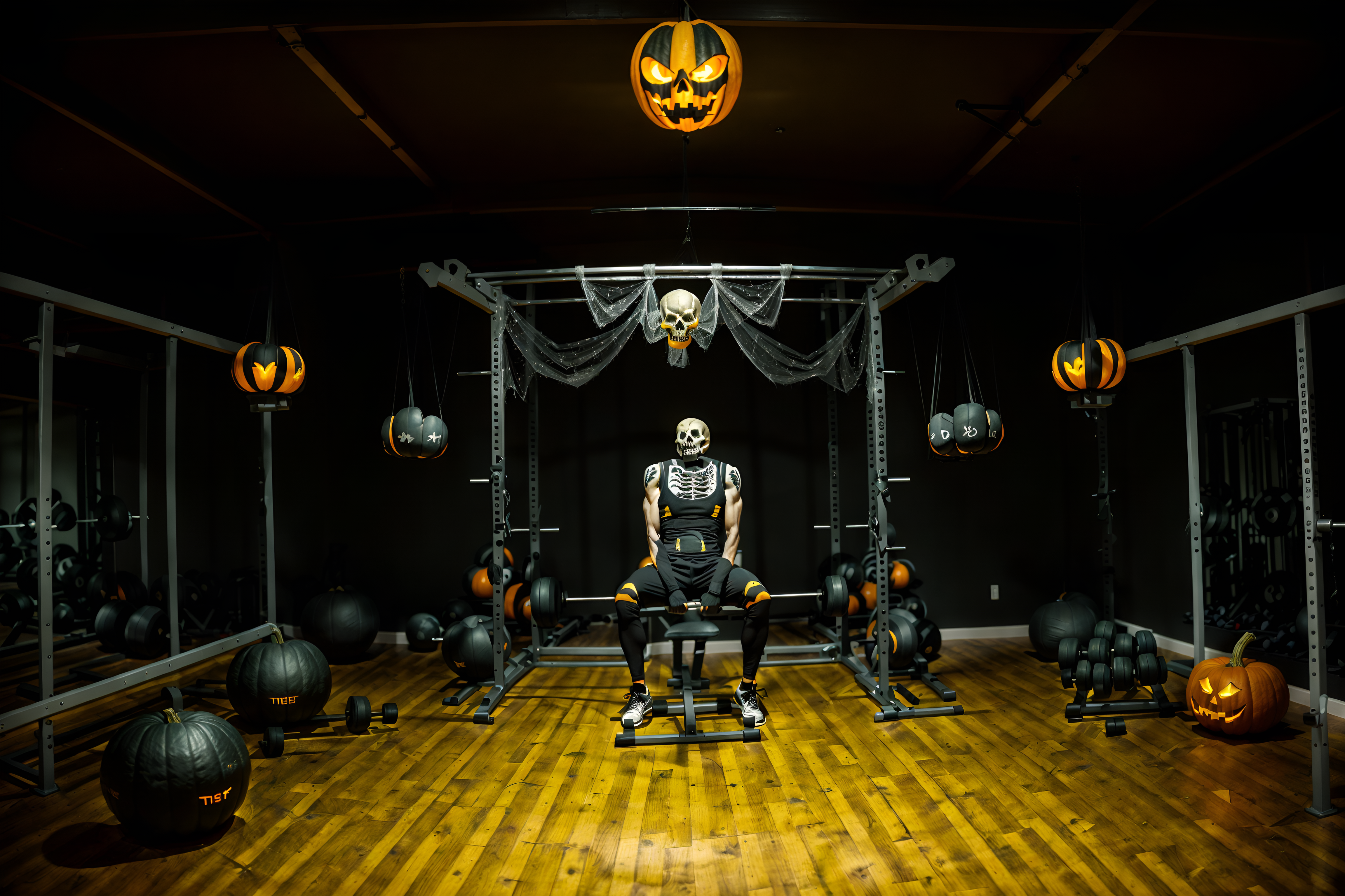 photo from pinterest of halloween-style interior designed (fitness gym interior) with dumbbell stand and crosstrainer and squat rack and bench press and exercise bicycle and dumbbell stand. . with yellow black balloons and lanterns and cobwebs and human skulls and skeletons sitting and standing and cobwebs and spiderwebs and glowing pumpkins. . cinematic photo, highly detailed, cinematic lighting, ultra-detailed, ultrarealistic, photorealism, 8k. trending on pinterest. halloween interior design style. masterpiece, cinematic light, ultrarealistic+, photorealistic+, 8k, raw photo, realistic, sharp focus on eyes, (symmetrical eyes), (intact eyes), hyperrealistic, highest quality, best quality, , highly detailed, masterpiece, best quality, extremely detailed 8k wallpaper, masterpiece, best quality, ultra-detailed, best shadow, detailed background, detailed face, detailed eyes, high contrast, best illumination, detailed face, dulux, caustic, dynamic angle, detailed glow. dramatic lighting. highly detailed, insanely detailed hair, symmetrical, intricate details, professionally retouched, 8k high definition. strong bokeh. award winning photo.