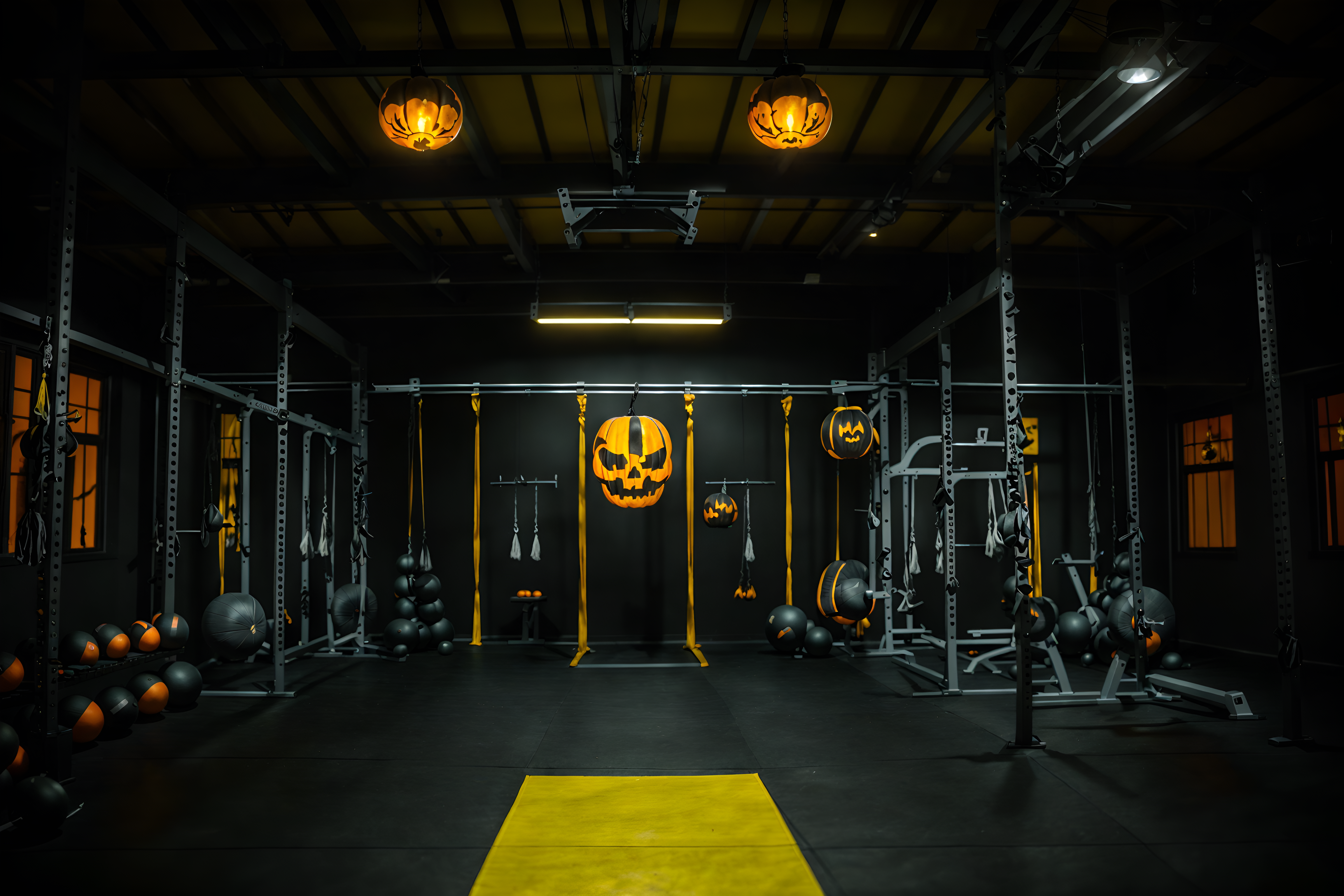 photo from pinterest of halloween-style interior designed (fitness gym interior) with dumbbell stand and crosstrainer and squat rack and bench press and exercise bicycle and dumbbell stand. . with yellow black balloons and lanterns and cobwebs and human skulls and skeletons sitting and standing and cobwebs and spiderwebs and glowing pumpkins. . cinematic photo, highly detailed, cinematic lighting, ultra-detailed, ultrarealistic, photorealism, 8k. trending on pinterest. halloween interior design style. masterpiece, cinematic light, ultrarealistic+, photorealistic+, 8k, raw photo, realistic, sharp focus on eyes, (symmetrical eyes), (intact eyes), hyperrealistic, highest quality, best quality, , highly detailed, masterpiece, best quality, extremely detailed 8k wallpaper, masterpiece, best quality, ultra-detailed, best shadow, detailed background, detailed face, detailed eyes, high contrast, best illumination, detailed face, dulux, caustic, dynamic angle, detailed glow. dramatic lighting. highly detailed, insanely detailed hair, symmetrical, intricate details, professionally retouched, 8k high definition. strong bokeh. award winning photo.