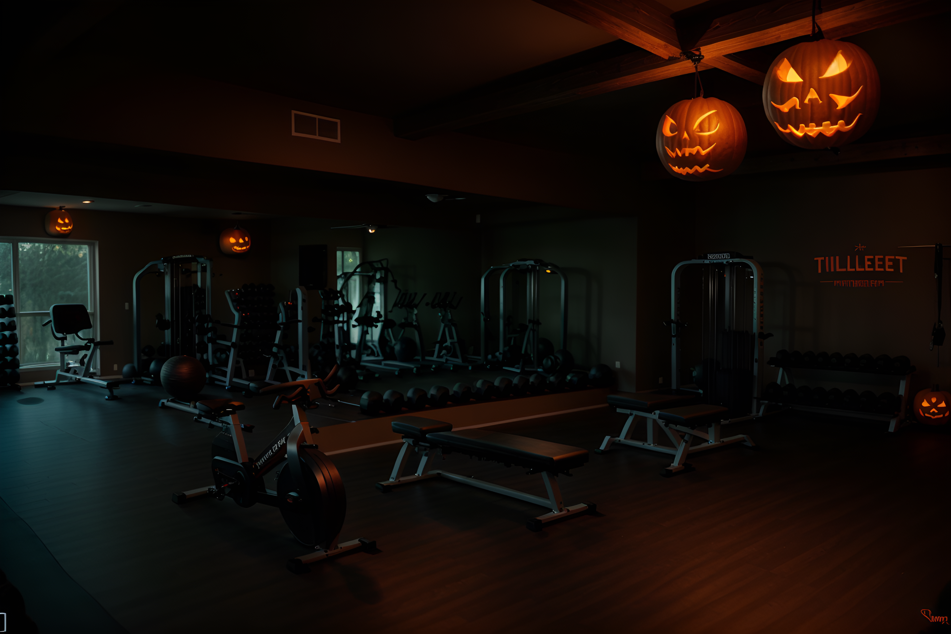 Photo from Pinterest of Halloween-style interior designed (fitness gym interior) With exercise bicycle and bench press and dumbbell stand and crosstrainer and squat rack and exercise bicycle. . With lanterns and human skulls and glowing pumpkins and cobwebs and spiderwebs and lanterns. . Cinematic photo, highly detailed, cinematic lighting, ultra-detailed, ultrarealistic, photorealism, 8k. Trending on Pinterest. Halloween interior design style