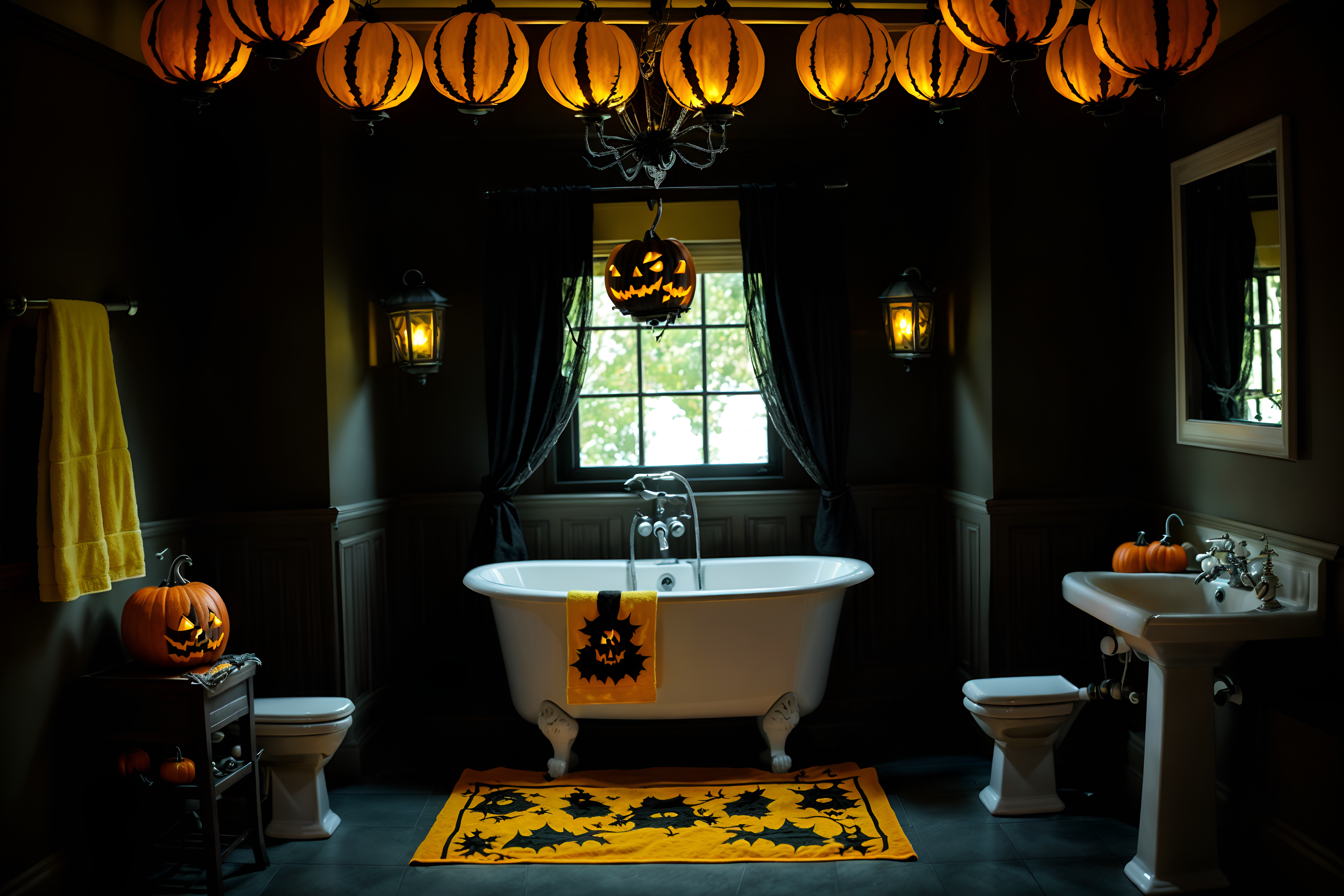 photo from pinterest of halloween-style interior designed (hotel bathroom interior) with bathroom sink with faucet and bathtub and bathroom cabinet and shower and bath rail and bath towel and waste basket and toilet seat. . with lanterns and spiderwebs and human skulls and yellow black balloons and lanterns and cobwebs and skeletons sitting and standing and glowing pumpkins. . cinematic photo, highly detailed, cinematic lighting, ultra-detailed, ultrarealistic, photorealism, 8k. trending on pinterest. halloween interior design style. masterpiece, cinematic light, ultrarealistic+, photorealistic+, 8k, raw photo, realistic, sharp focus on eyes, (symmetrical eyes), (intact eyes), hyperrealistic, highest quality, best quality, , highly detailed, masterpiece, best quality, extremely detailed 8k wallpaper, masterpiece, best quality, ultra-detailed, best shadow, detailed background, detailed face, detailed eyes, high contrast, best illumination, detailed face, dulux, caustic, dynamic angle, detailed glow. dramatic lighting. highly detailed, insanely detailed hair, symmetrical, intricate details, professionally retouched, 8k high definition. strong bokeh. award winning photo.