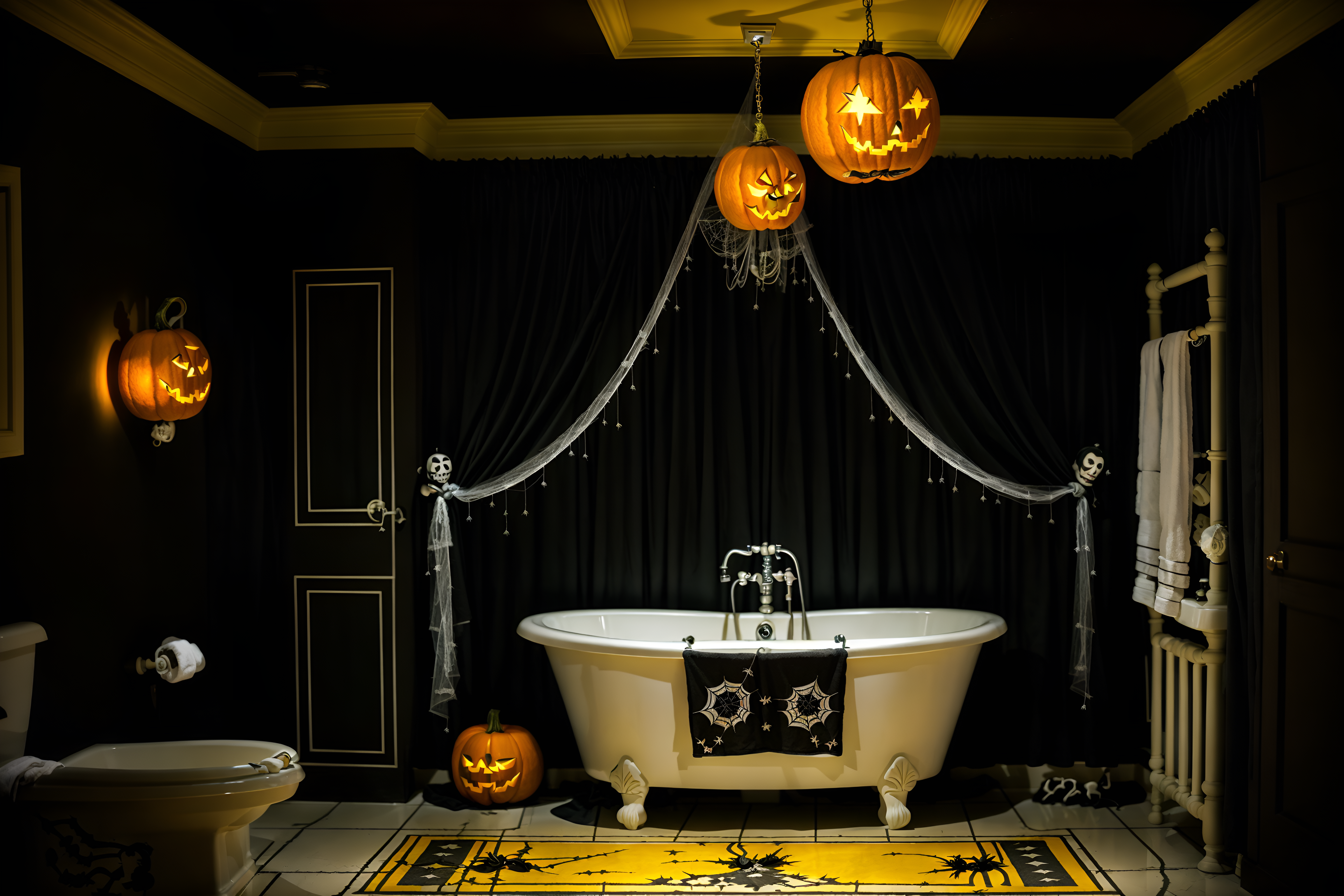 photo from pinterest of halloween-style interior designed (hotel bathroom interior) with bathroom sink with faucet and bathtub and bathroom cabinet and shower and bath rail and bath towel and waste basket and toilet seat. . with lanterns and spiderwebs and human skulls and yellow black balloons and lanterns and cobwebs and skeletons sitting and standing and glowing pumpkins. . cinematic photo, highly detailed, cinematic lighting, ultra-detailed, ultrarealistic, photorealism, 8k. trending on pinterest. halloween interior design style. masterpiece, cinematic light, ultrarealistic+, photorealistic+, 8k, raw photo, realistic, sharp focus on eyes, (symmetrical eyes), (intact eyes), hyperrealistic, highest quality, best quality, , highly detailed, masterpiece, best quality, extremely detailed 8k wallpaper, masterpiece, best quality, ultra-detailed, best shadow, detailed background, detailed face, detailed eyes, high contrast, best illumination, detailed face, dulux, caustic, dynamic angle, detailed glow. dramatic lighting. highly detailed, insanely detailed hair, symmetrical, intricate details, professionally retouched, 8k high definition. strong bokeh. award winning photo.
