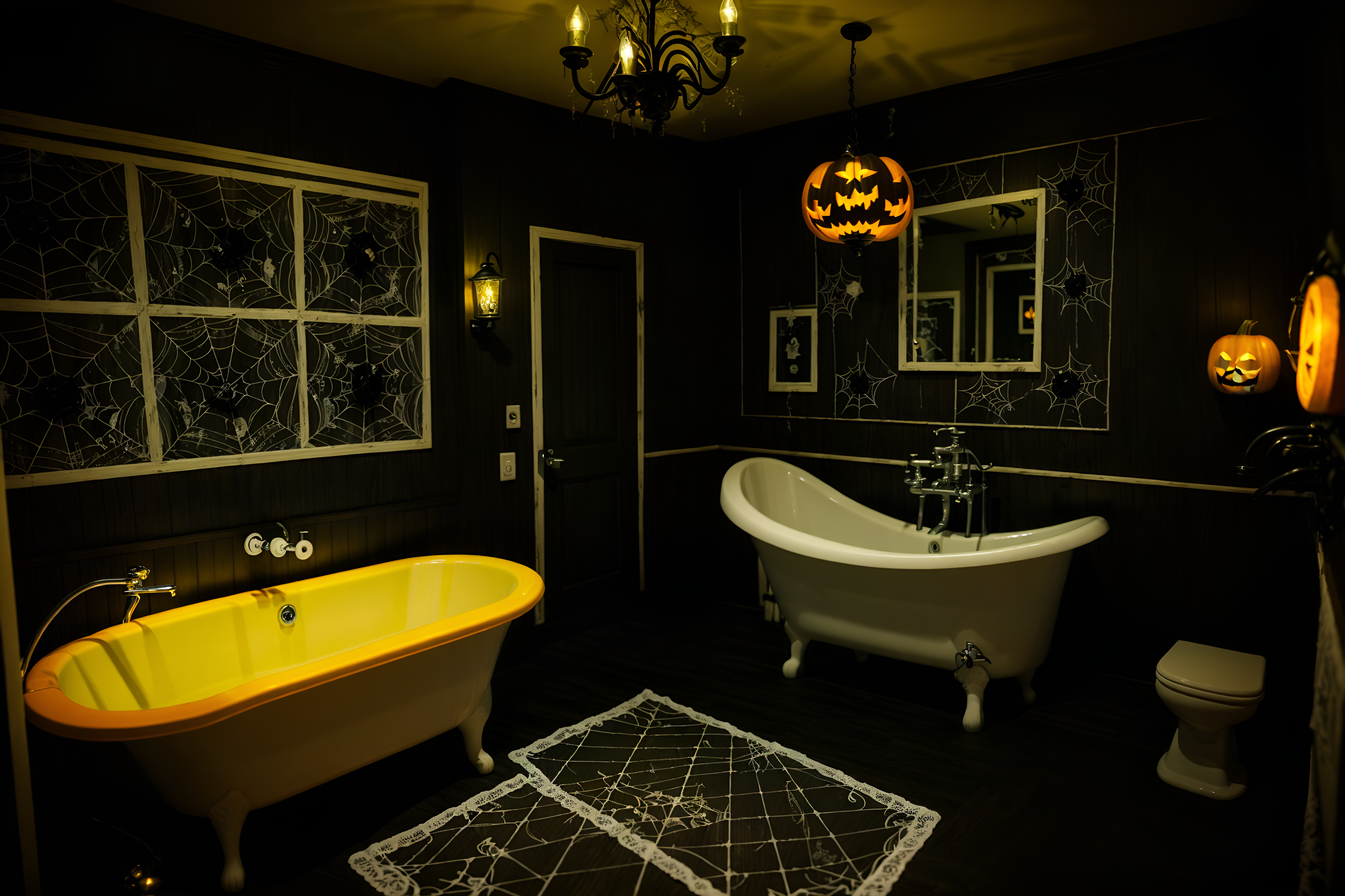 photo from pinterest of halloween-style interior designed (hotel bathroom interior) with bathroom sink with faucet and bathtub and bathroom cabinet and shower and bath rail and bath towel and waste basket and toilet seat. . with lanterns and spiderwebs and human skulls and yellow black balloons and lanterns and cobwebs and skeletons sitting and standing and glowing pumpkins. . cinematic photo, highly detailed, cinematic lighting, ultra-detailed, ultrarealistic, photorealism, 8k. trending on pinterest. halloween interior design style. masterpiece, cinematic light, ultrarealistic+, photorealistic+, 8k, raw photo, realistic, sharp focus on eyes, (symmetrical eyes), (intact eyes), hyperrealistic, highest quality, best quality, , highly detailed, masterpiece, best quality, extremely detailed 8k wallpaper, masterpiece, best quality, ultra-detailed, best shadow, detailed background, detailed face, detailed eyes, high contrast, best illumination, detailed face, dulux, caustic, dynamic angle, detailed glow. dramatic lighting. highly detailed, insanely detailed hair, symmetrical, intricate details, professionally retouched, 8k high definition. strong bokeh. award winning photo.