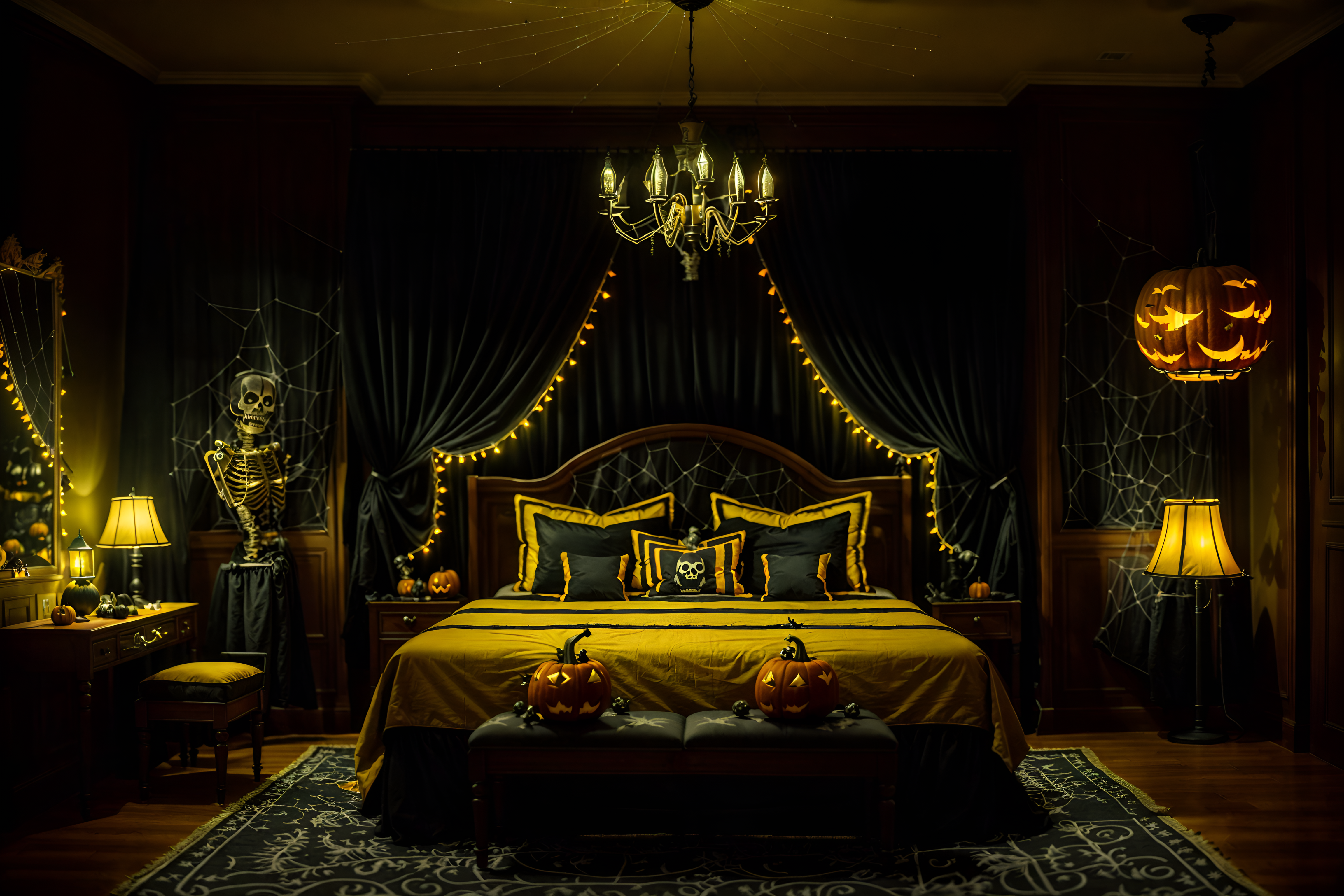 photo from pinterest of halloween-style interior designed (hotel room interior) with bed and storage bench or ottoman and hotel bathroom and accent chair and plant and night light and mirror and headboard. . with lanterns and skeletons sitting and standing and spiderwebs and glowing pumpkins and yellow black balloons and lanterns and cobwebs and human skulls. . cinematic photo, highly detailed, cinematic lighting, ultra-detailed, ultrarealistic, photorealism, 8k. trending on pinterest. halloween interior design style. masterpiece, cinematic light, ultrarealistic+, photorealistic+, 8k, raw photo, realistic, sharp focus on eyes, (symmetrical eyes), (intact eyes), hyperrealistic, highest quality, best quality, , highly detailed, masterpiece, best quality, extremely detailed 8k wallpaper, masterpiece, best quality, ultra-detailed, best shadow, detailed background, detailed face, detailed eyes, high contrast, best illumination, detailed face, dulux, caustic, dynamic angle, detailed glow. dramatic lighting. highly detailed, insanely detailed hair, symmetrical, intricate details, professionally retouched, 8k high definition. strong bokeh. award winning photo.