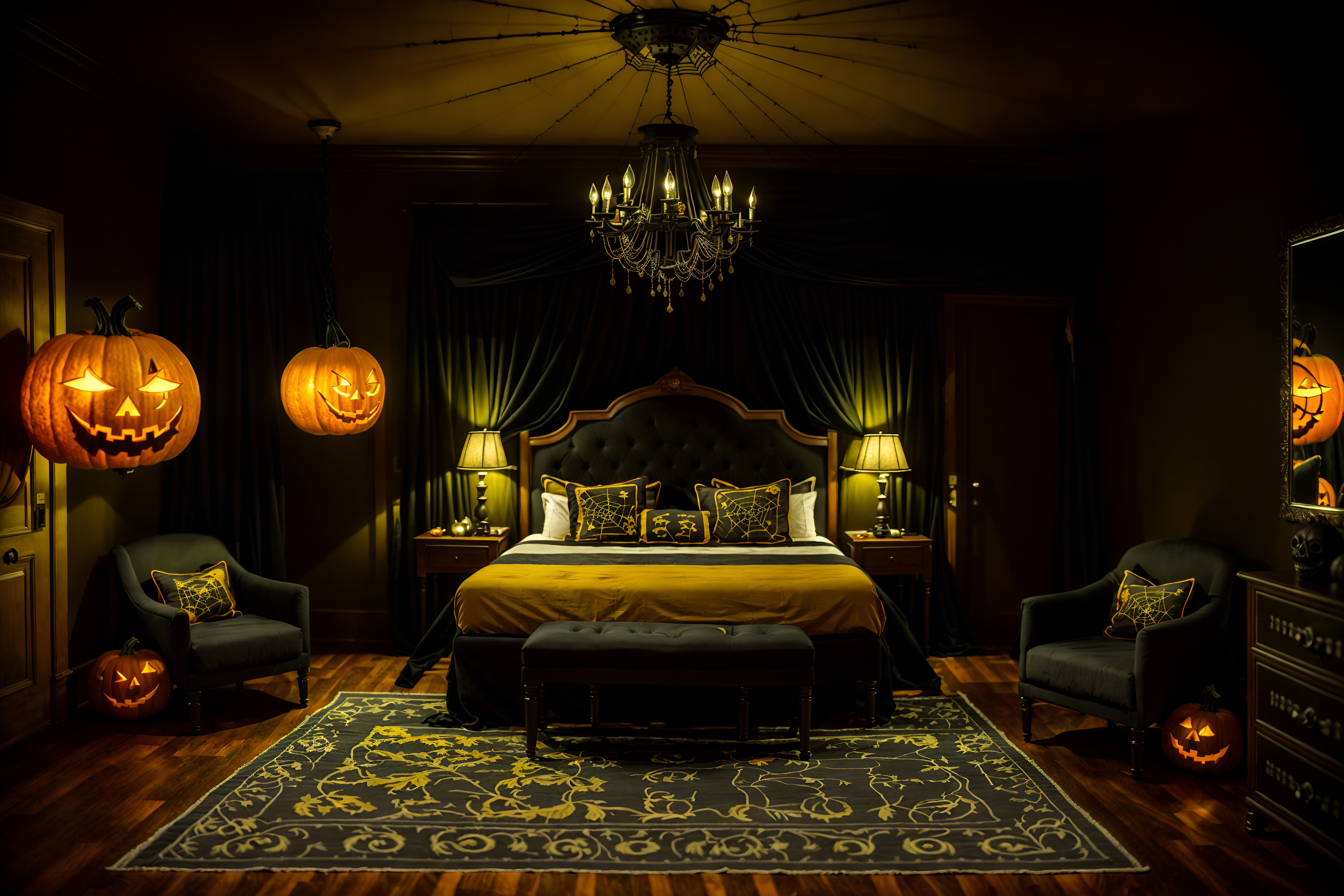 photo from pinterest of halloween-style interior designed (hotel room interior) with bed and storage bench or ottoman and hotel bathroom and accent chair and plant and night light and mirror and headboard. . with lanterns and skeletons sitting and standing and spiderwebs and glowing pumpkins and yellow black balloons and lanterns and cobwebs and human skulls. . cinematic photo, highly detailed, cinematic lighting, ultra-detailed, ultrarealistic, photorealism, 8k. trending on pinterest. halloween interior design style. masterpiece, cinematic light, ultrarealistic+, photorealistic+, 8k, raw photo, realistic, sharp focus on eyes, (symmetrical eyes), (intact eyes), hyperrealistic, highest quality, best quality, , highly detailed, masterpiece, best quality, extremely detailed 8k wallpaper, masterpiece, best quality, ultra-detailed, best shadow, detailed background, detailed face, detailed eyes, high contrast, best illumination, detailed face, dulux, caustic, dynamic angle, detailed glow. dramatic lighting. highly detailed, insanely detailed hair, symmetrical, intricate details, professionally retouched, 8k high definition. strong bokeh. award winning photo.