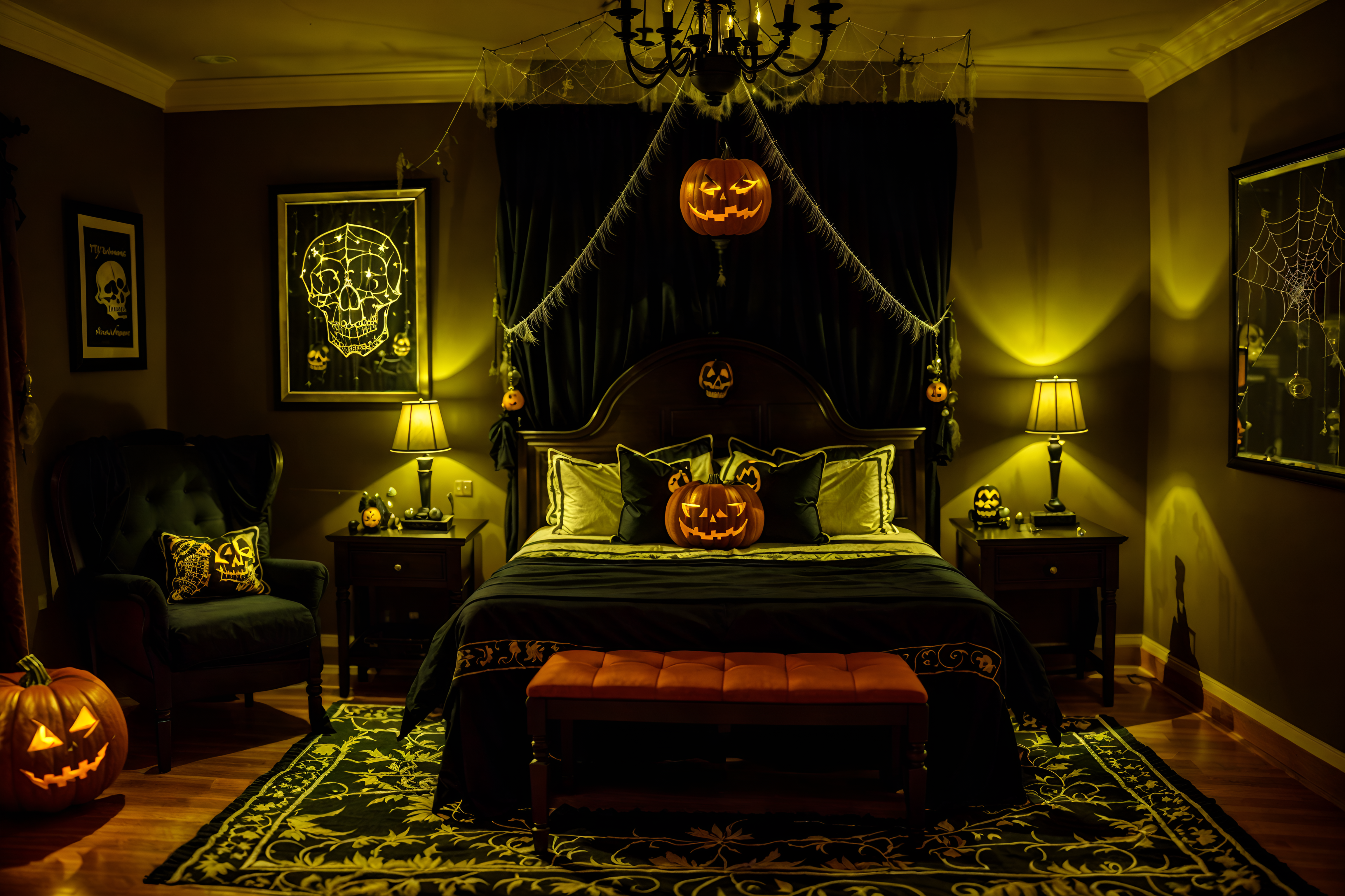 photo from pinterest of halloween-style interior designed (hotel room interior) with bed and storage bench or ottoman and hotel bathroom and accent chair and plant and night light and mirror and headboard. . with lanterns and skeletons sitting and standing and spiderwebs and glowing pumpkins and yellow black balloons and lanterns and cobwebs and human skulls. . cinematic photo, highly detailed, cinematic lighting, ultra-detailed, ultrarealistic, photorealism, 8k. trending on pinterest. halloween interior design style. masterpiece, cinematic light, ultrarealistic+, photorealistic+, 8k, raw photo, realistic, sharp focus on eyes, (symmetrical eyes), (intact eyes), hyperrealistic, highest quality, best quality, , highly detailed, masterpiece, best quality, extremely detailed 8k wallpaper, masterpiece, best quality, ultra-detailed, best shadow, detailed background, detailed face, detailed eyes, high contrast, best illumination, detailed face, dulux, caustic, dynamic angle, detailed glow. dramatic lighting. highly detailed, insanely detailed hair, symmetrical, intricate details, professionally retouched, 8k high definition. strong bokeh. award winning photo.