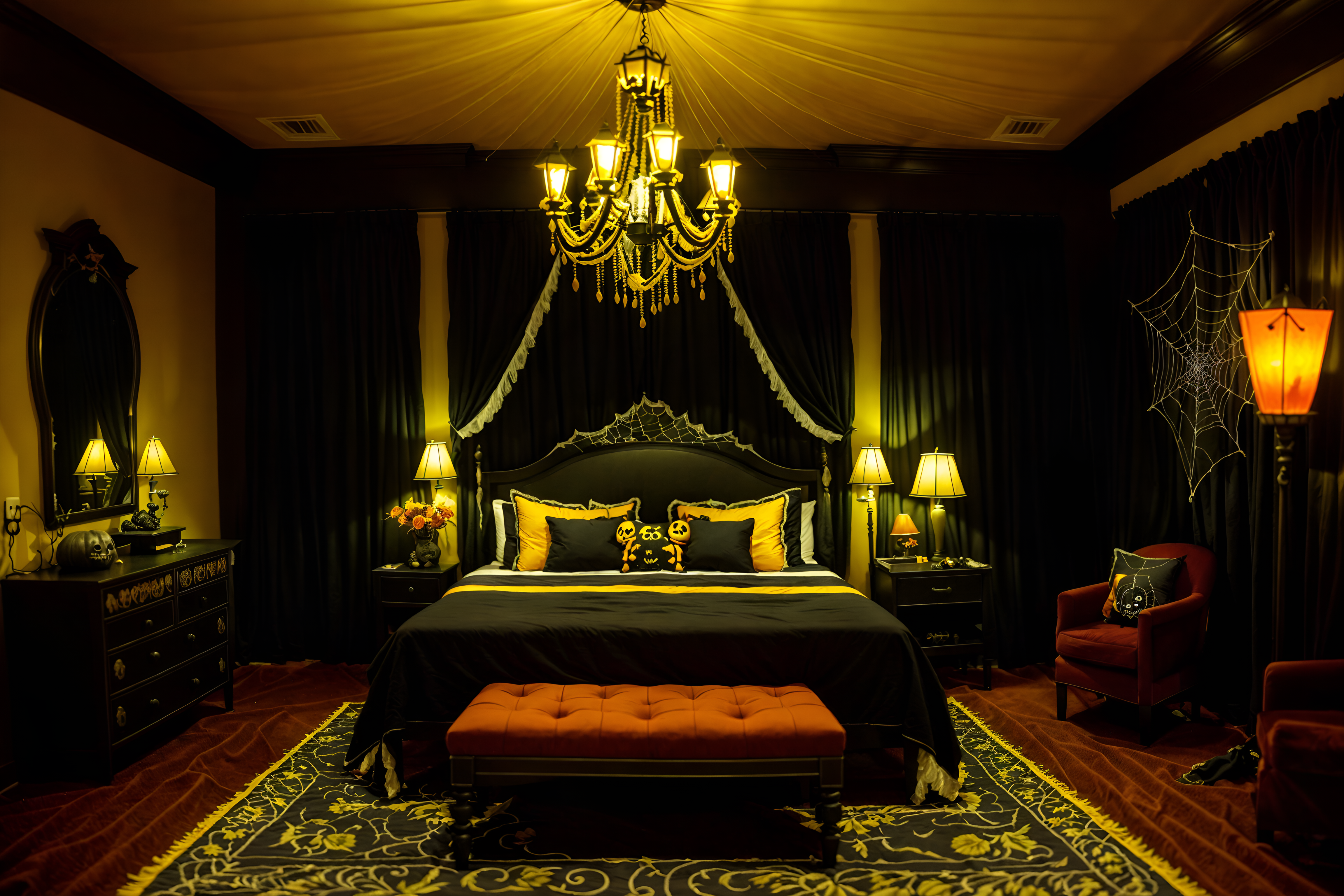 photo from pinterest of halloween-style interior designed (hotel room interior) with bed and storage bench or ottoman and hotel bathroom and accent chair and plant and night light and mirror and headboard. . with lanterns and skeletons sitting and standing and spiderwebs and glowing pumpkins and yellow black balloons and lanterns and cobwebs and human skulls. . cinematic photo, highly detailed, cinematic lighting, ultra-detailed, ultrarealistic, photorealism, 8k. trending on pinterest. halloween interior design style. masterpiece, cinematic light, ultrarealistic+, photorealistic+, 8k, raw photo, realistic, sharp focus on eyes, (symmetrical eyes), (intact eyes), hyperrealistic, highest quality, best quality, , highly detailed, masterpiece, best quality, extremely detailed 8k wallpaper, masterpiece, best quality, ultra-detailed, best shadow, detailed background, detailed face, detailed eyes, high contrast, best illumination, detailed face, dulux, caustic, dynamic angle, detailed glow. dramatic lighting. highly detailed, insanely detailed hair, symmetrical, intricate details, professionally retouched, 8k high definition. strong bokeh. award winning photo.