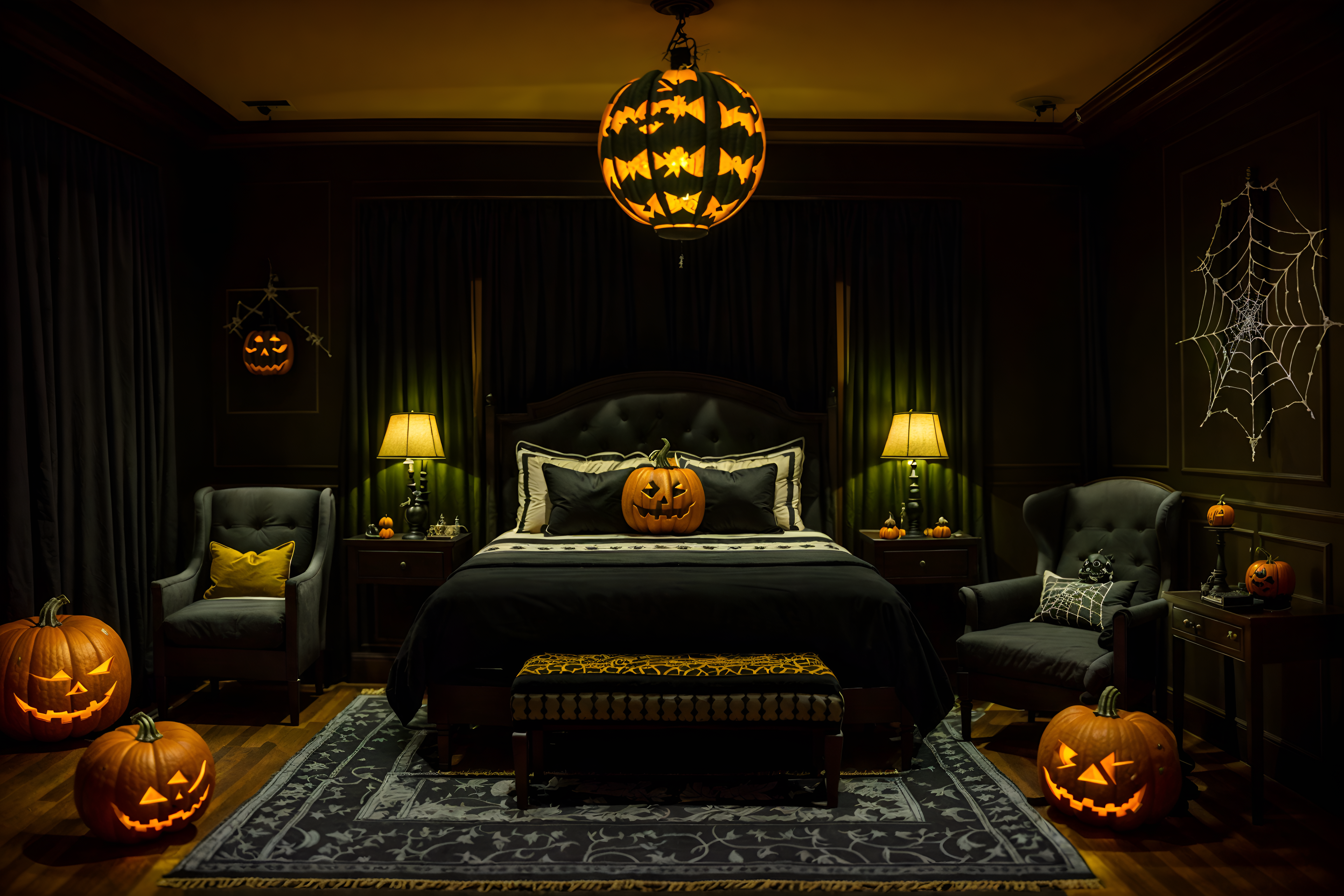 photo from pinterest of halloween-style interior designed (hotel room interior) with bed and storage bench or ottoman and hotel bathroom and accent chair and plant and night light and mirror and headboard. . with lanterns and skeletons sitting and standing and spiderwebs and glowing pumpkins and yellow black balloons and lanterns and cobwebs and human skulls. . cinematic photo, highly detailed, cinematic lighting, ultra-detailed, ultrarealistic, photorealism, 8k. trending on pinterest. halloween interior design style. masterpiece, cinematic light, ultrarealistic+, photorealistic+, 8k, raw photo, realistic, sharp focus on eyes, (symmetrical eyes), (intact eyes), hyperrealistic, highest quality, best quality, , highly detailed, masterpiece, best quality, extremely detailed 8k wallpaper, masterpiece, best quality, ultra-detailed, best shadow, detailed background, detailed face, detailed eyes, high contrast, best illumination, detailed face, dulux, caustic, dynamic angle, detailed glow. dramatic lighting. highly detailed, insanely detailed hair, symmetrical, intricate details, professionally retouched, 8k high definition. strong bokeh. award winning photo.