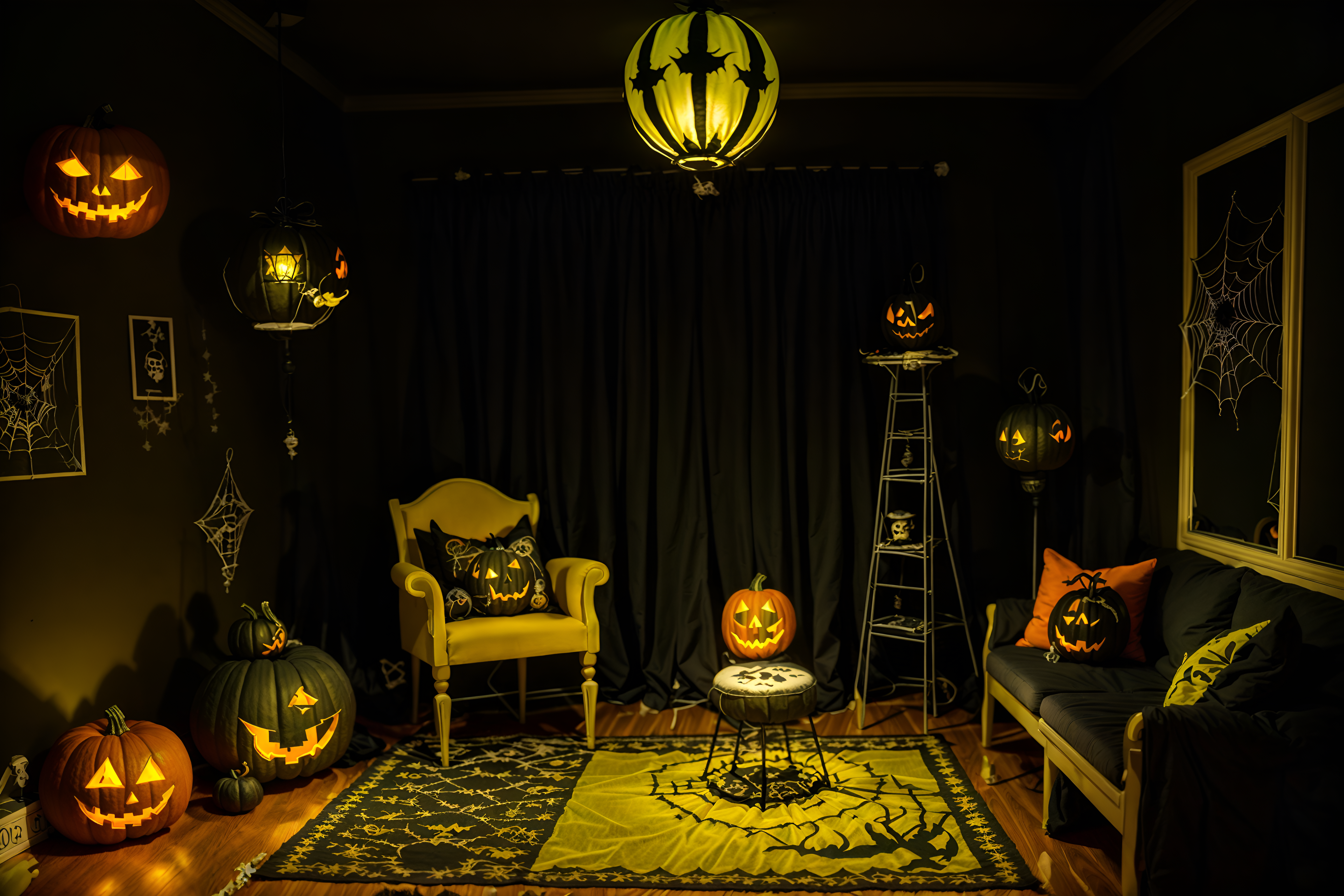 photo from pinterest of halloween-style interior designed (kids room interior) with accent chair and night light and mirror and bed and storage bench or ottoman and bedside table or night stand and dresser closet and plant. . with cobwebs and lanterns and spiderwebs and yellow black balloons and glowing pumpkins and skeletons sitting and standing and lanterns and cobwebs. . cinematic photo, highly detailed, cinematic lighting, ultra-detailed, ultrarealistic, photorealism, 8k. trending on pinterest. halloween interior design style. masterpiece, cinematic light, ultrarealistic+, photorealistic+, 8k, raw photo, realistic, sharp focus on eyes, (symmetrical eyes), (intact eyes), hyperrealistic, highest quality, best quality, , highly detailed, masterpiece, best quality, extremely detailed 8k wallpaper, masterpiece, best quality, ultra-detailed, best shadow, detailed background, detailed face, detailed eyes, high contrast, best illumination, detailed face, dulux, caustic, dynamic angle, detailed glow. dramatic lighting. highly detailed, insanely detailed hair, symmetrical, intricate details, professionally retouched, 8k high definition. strong bokeh. award winning photo.