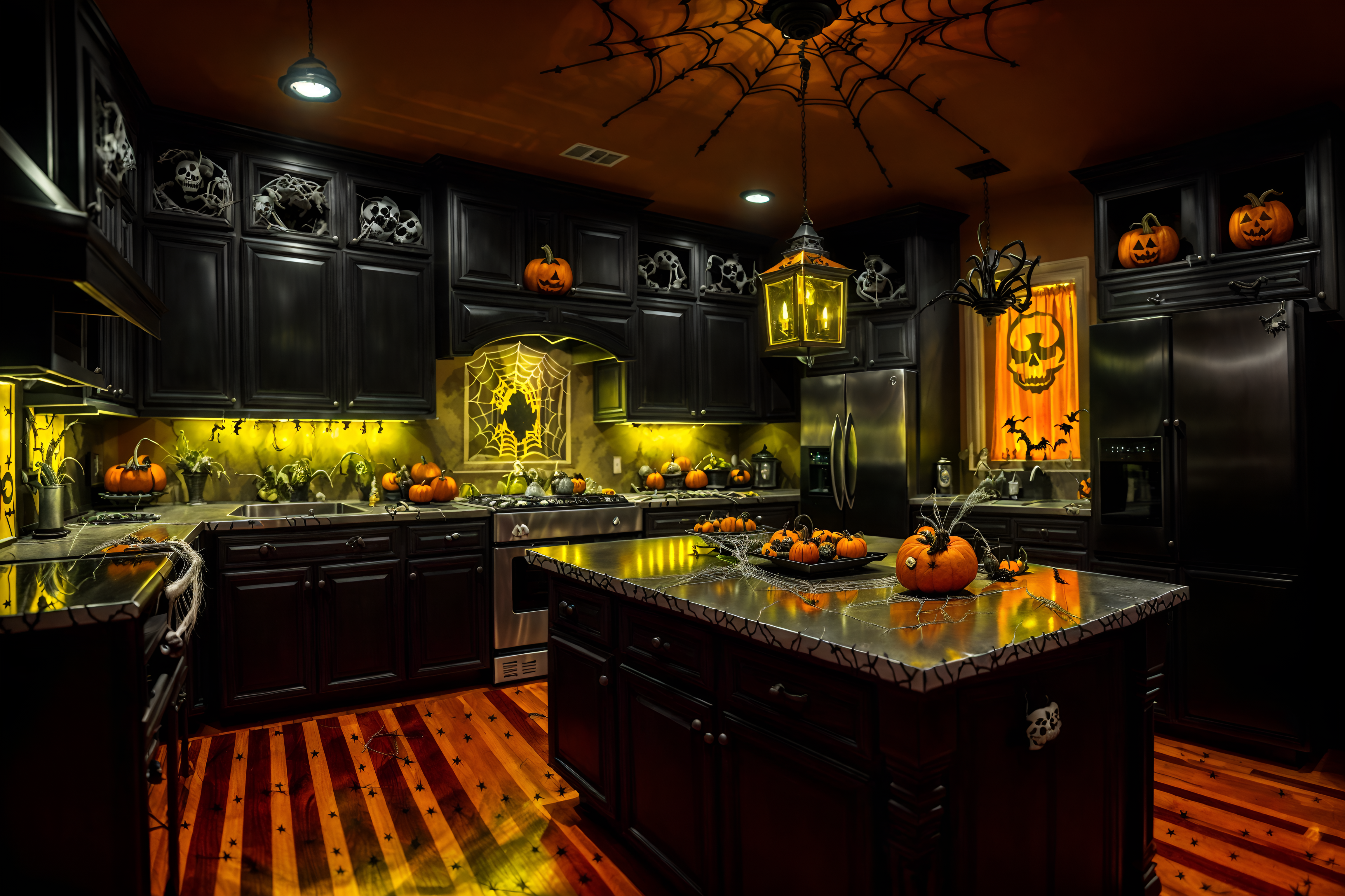 photo from pinterest of halloween-style interior designed (kitchen interior) with kitchen cabinets and refrigerator and sink and stove and worktops and plant and kitchen cabinets. . with cobwebs and lanterns and skeletons sitting and standing and glowing pumpkins and lanterns and cobwebs and spiderwebs and human skulls. . cinematic photo, highly detailed, cinematic lighting, ultra-detailed, ultrarealistic, photorealism, 8k. trending on pinterest. halloween interior design style. masterpiece, cinematic light, ultrarealistic+, photorealistic+, 8k, raw photo, realistic, sharp focus on eyes, (symmetrical eyes), (intact eyes), hyperrealistic, highest quality, best quality, , highly detailed, masterpiece, best quality, extremely detailed 8k wallpaper, masterpiece, best quality, ultra-detailed, best shadow, detailed background, detailed face, detailed eyes, high contrast, best illumination, detailed face, dulux, caustic, dynamic angle, detailed glow. dramatic lighting. highly detailed, insanely detailed hair, symmetrical, intricate details, professionally retouched, 8k high definition. strong bokeh. award winning photo.