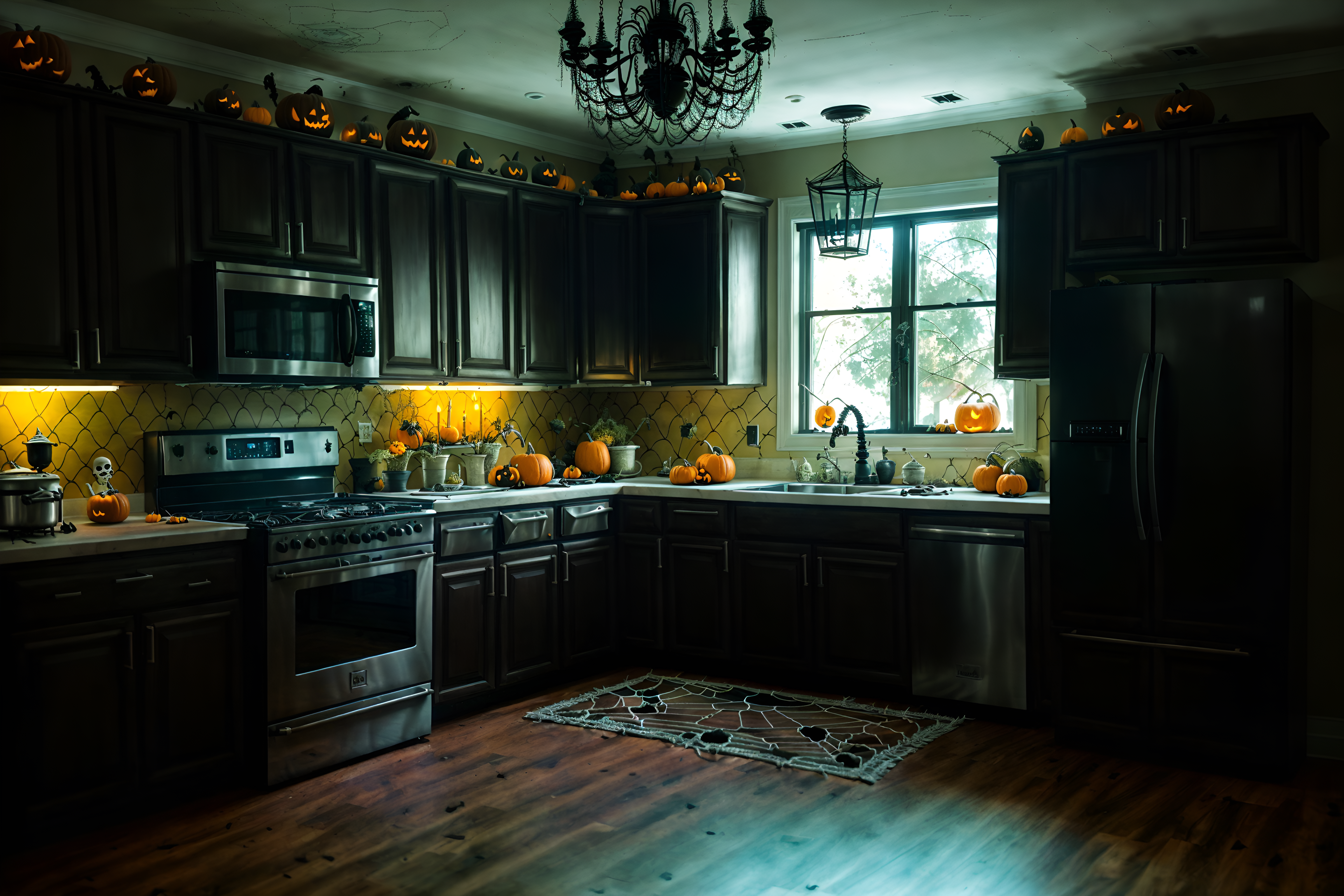 photo from pinterest of halloween-style interior designed (kitchen interior) with kitchen cabinets and refrigerator and sink and stove and worktops and plant and kitchen cabinets. . with cobwebs and lanterns and skeletons sitting and standing and glowing pumpkins and lanterns and cobwebs and spiderwebs and human skulls. . cinematic photo, highly detailed, cinematic lighting, ultra-detailed, ultrarealistic, photorealism, 8k. trending on pinterest. halloween interior design style. masterpiece, cinematic light, ultrarealistic+, photorealistic+, 8k, raw photo, realistic, sharp focus on eyes, (symmetrical eyes), (intact eyes), hyperrealistic, highest quality, best quality, , highly detailed, masterpiece, best quality, extremely detailed 8k wallpaper, masterpiece, best quality, ultra-detailed, best shadow, detailed background, detailed face, detailed eyes, high contrast, best illumination, detailed face, dulux, caustic, dynamic angle, detailed glow. dramatic lighting. highly detailed, insanely detailed hair, symmetrical, intricate details, professionally retouched, 8k high definition. strong bokeh. award winning photo.