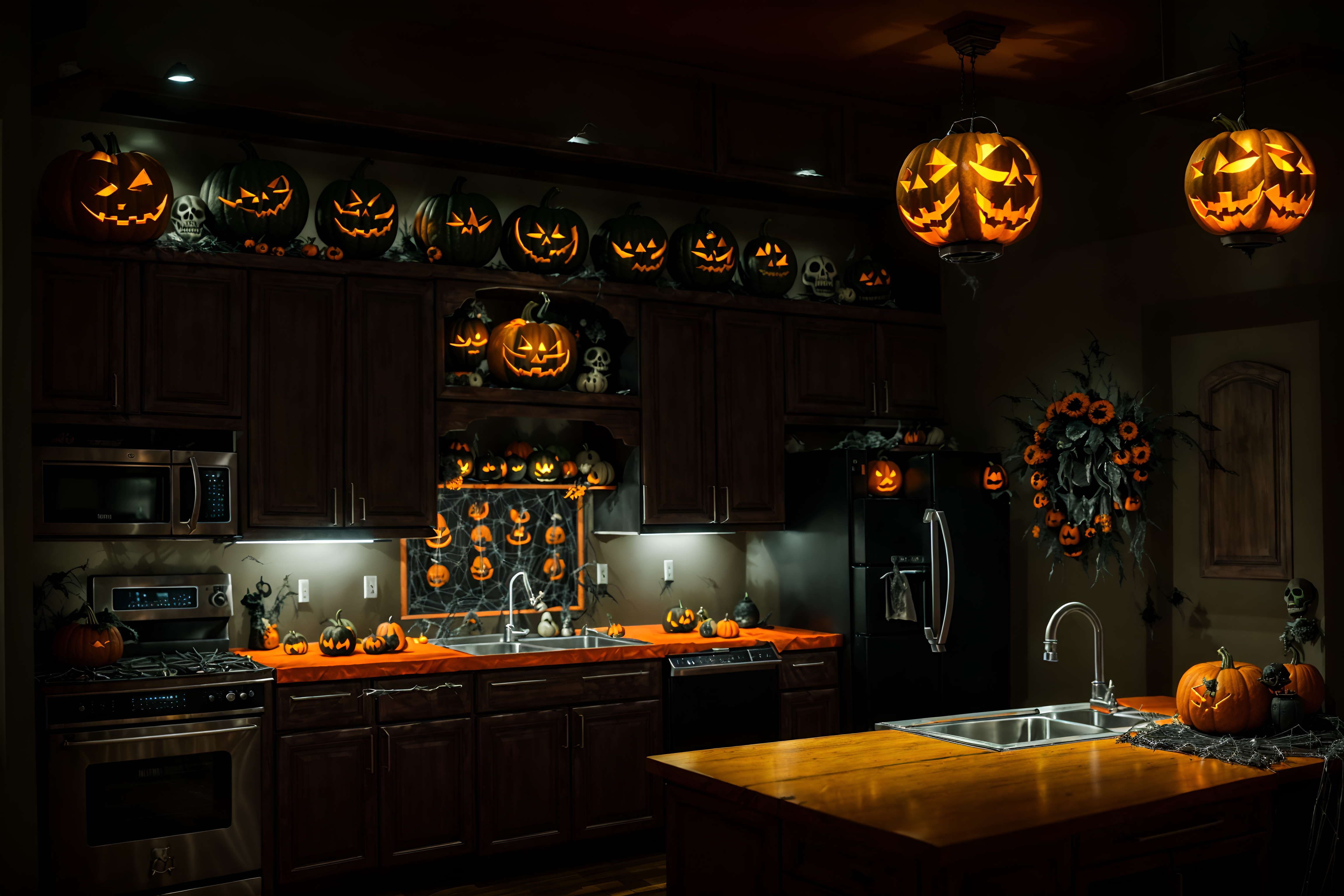 photo from pinterest of halloween-style interior designed (kitchen interior) with kitchen cabinets and refrigerator and sink and stove and worktops and plant and kitchen cabinets. . with cobwebs and lanterns and skeletons sitting and standing and glowing pumpkins and lanterns and cobwebs and spiderwebs and human skulls. . cinematic photo, highly detailed, cinematic lighting, ultra-detailed, ultrarealistic, photorealism, 8k. trending on pinterest. halloween interior design style. masterpiece, cinematic light, ultrarealistic+, photorealistic+, 8k, raw photo, realistic, sharp focus on eyes, (symmetrical eyes), (intact eyes), hyperrealistic, highest quality, best quality, , highly detailed, masterpiece, best quality, extremely detailed 8k wallpaper, masterpiece, best quality, ultra-detailed, best shadow, detailed background, detailed face, detailed eyes, high contrast, best illumination, detailed face, dulux, caustic, dynamic angle, detailed glow. dramatic lighting. highly detailed, insanely detailed hair, symmetrical, intricate details, professionally retouched, 8k high definition. strong bokeh. award winning photo.