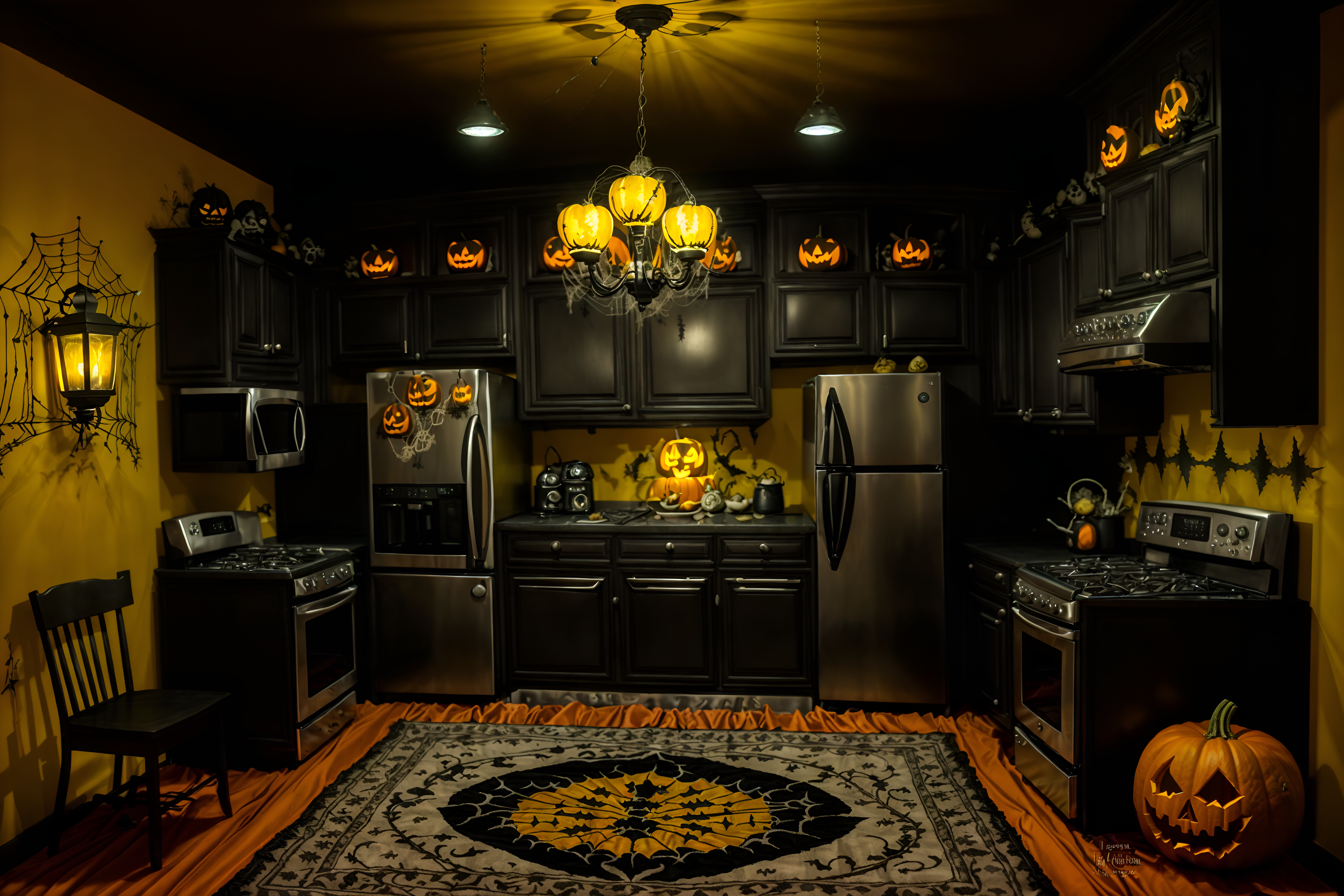photo from pinterest of halloween-style interior designed (kitchen living combo interior) with coffee tables and chairs and refrigerator and stove and furniture and televisions and sink and rug. . with spiderwebs and lanterns and cobwebs and human skulls and lanterns and glowing pumpkins and skeletons sitting and standing and yellow black balloons. . cinematic photo, highly detailed, cinematic lighting, ultra-detailed, ultrarealistic, photorealism, 8k. trending on pinterest. halloween interior design style. masterpiece, cinematic light, ultrarealistic+, photorealistic+, 8k, raw photo, realistic, sharp focus on eyes, (symmetrical eyes), (intact eyes), hyperrealistic, highest quality, best quality, , highly detailed, masterpiece, best quality, extremely detailed 8k wallpaper, masterpiece, best quality, ultra-detailed, best shadow, detailed background, detailed face, detailed eyes, high contrast, best illumination, detailed face, dulux, caustic, dynamic angle, detailed glow. dramatic lighting. highly detailed, insanely detailed hair, symmetrical, intricate details, professionally retouched, 8k high definition. strong bokeh. award winning photo.