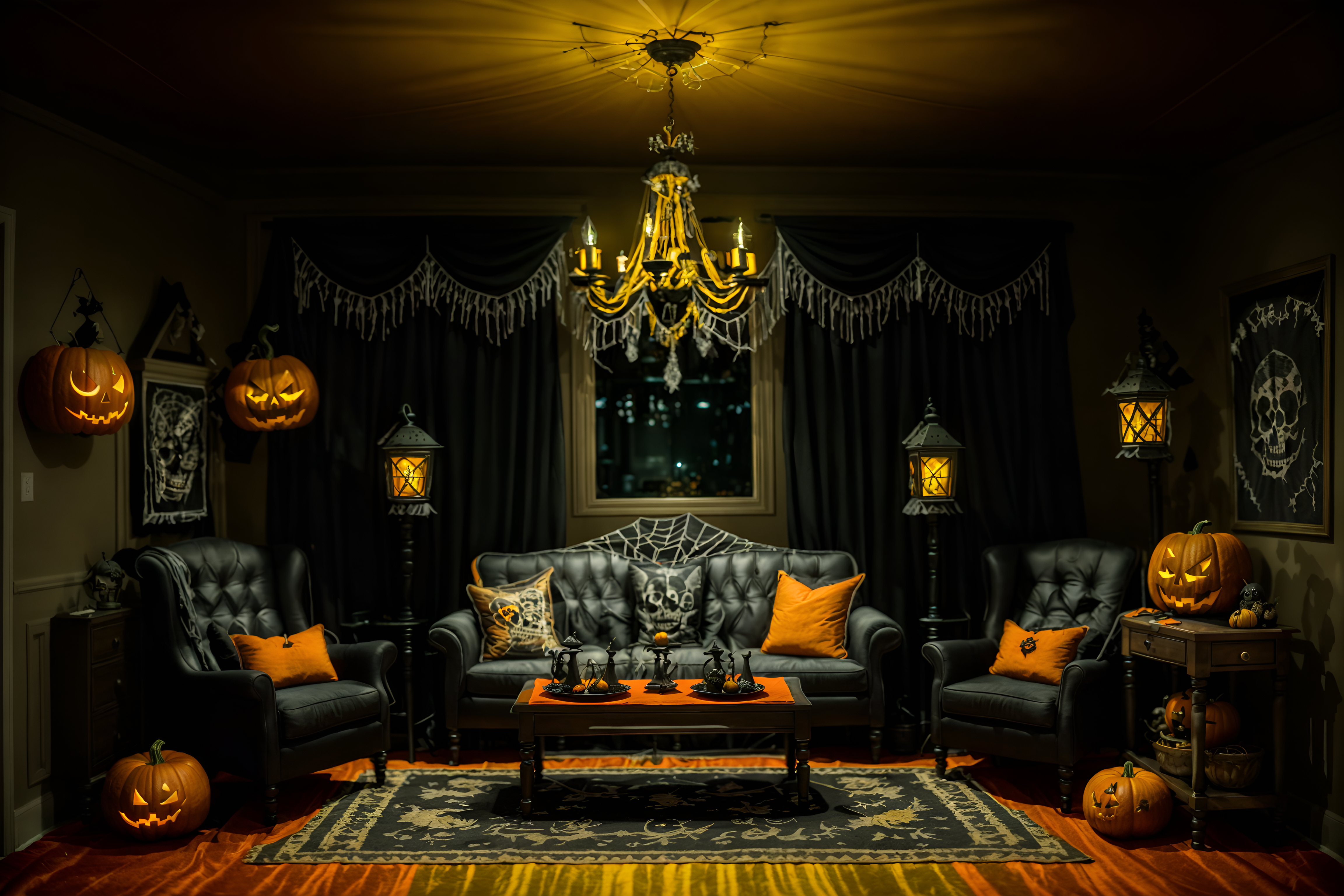 photo from pinterest of halloween-style interior designed (kitchen living combo interior) with coffee tables and chairs and refrigerator and stove and furniture and televisions and sink and rug. . with spiderwebs and lanterns and cobwebs and human skulls and lanterns and glowing pumpkins and skeletons sitting and standing and yellow black balloons. . cinematic photo, highly detailed, cinematic lighting, ultra-detailed, ultrarealistic, photorealism, 8k. trending on pinterest. halloween interior design style. masterpiece, cinematic light, ultrarealistic+, photorealistic+, 8k, raw photo, realistic, sharp focus on eyes, (symmetrical eyes), (intact eyes), hyperrealistic, highest quality, best quality, , highly detailed, masterpiece, best quality, extremely detailed 8k wallpaper, masterpiece, best quality, ultra-detailed, best shadow, detailed background, detailed face, detailed eyes, high contrast, best illumination, detailed face, dulux, caustic, dynamic angle, detailed glow. dramatic lighting. highly detailed, insanely detailed hair, symmetrical, intricate details, professionally retouched, 8k high definition. strong bokeh. award winning photo.