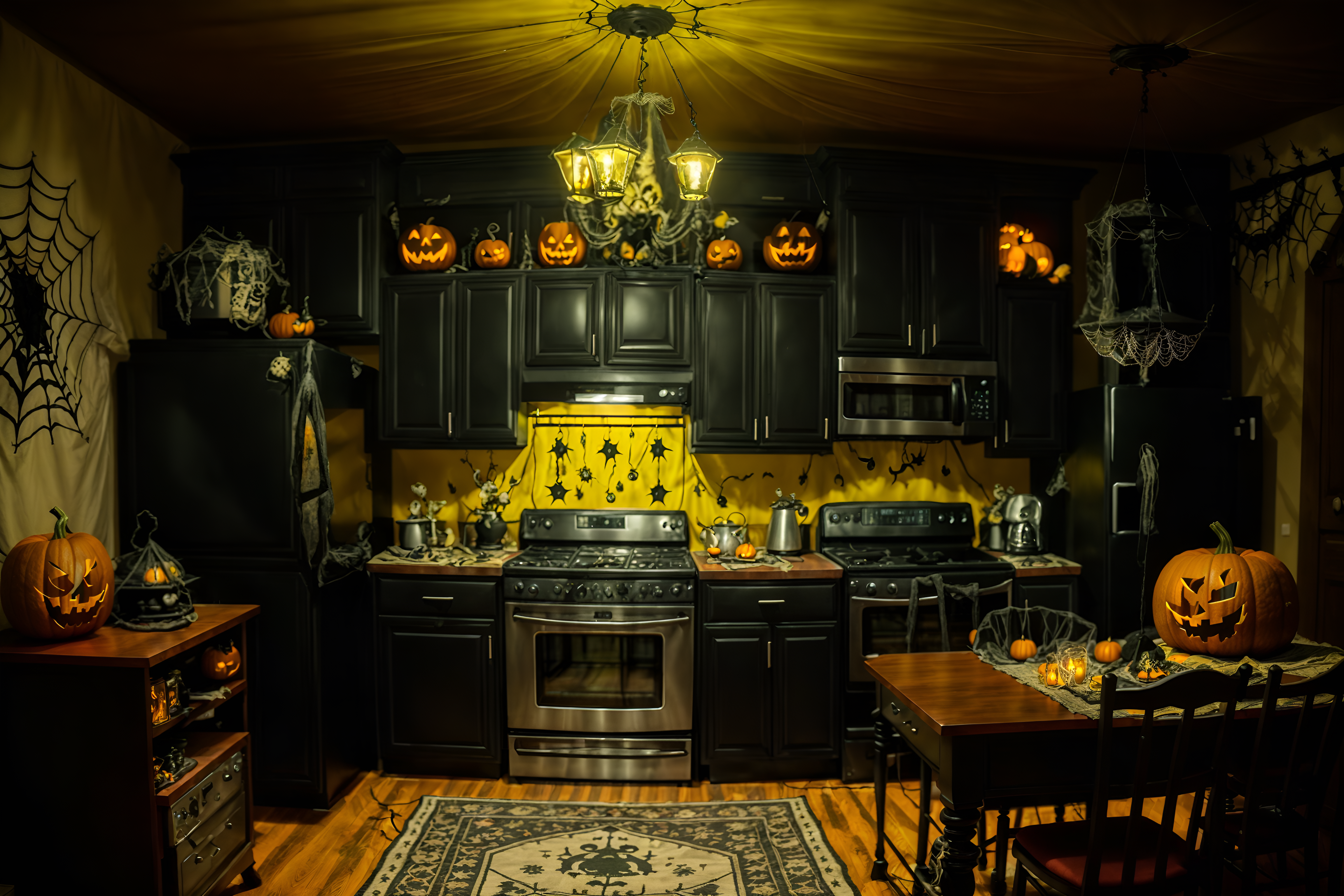 photo from pinterest of halloween-style interior designed (kitchen living combo interior) with coffee tables and chairs and refrigerator and stove and furniture and televisions and sink and rug. . with spiderwebs and lanterns and cobwebs and human skulls and lanterns and glowing pumpkins and skeletons sitting and standing and yellow black balloons. . cinematic photo, highly detailed, cinematic lighting, ultra-detailed, ultrarealistic, photorealism, 8k. trending on pinterest. halloween interior design style. masterpiece, cinematic light, ultrarealistic+, photorealistic+, 8k, raw photo, realistic, sharp focus on eyes, (symmetrical eyes), (intact eyes), hyperrealistic, highest quality, best quality, , highly detailed, masterpiece, best quality, extremely detailed 8k wallpaper, masterpiece, best quality, ultra-detailed, best shadow, detailed background, detailed face, detailed eyes, high contrast, best illumination, detailed face, dulux, caustic, dynamic angle, detailed glow. dramatic lighting. highly detailed, insanely detailed hair, symmetrical, intricate details, professionally retouched, 8k high definition. strong bokeh. award winning photo.