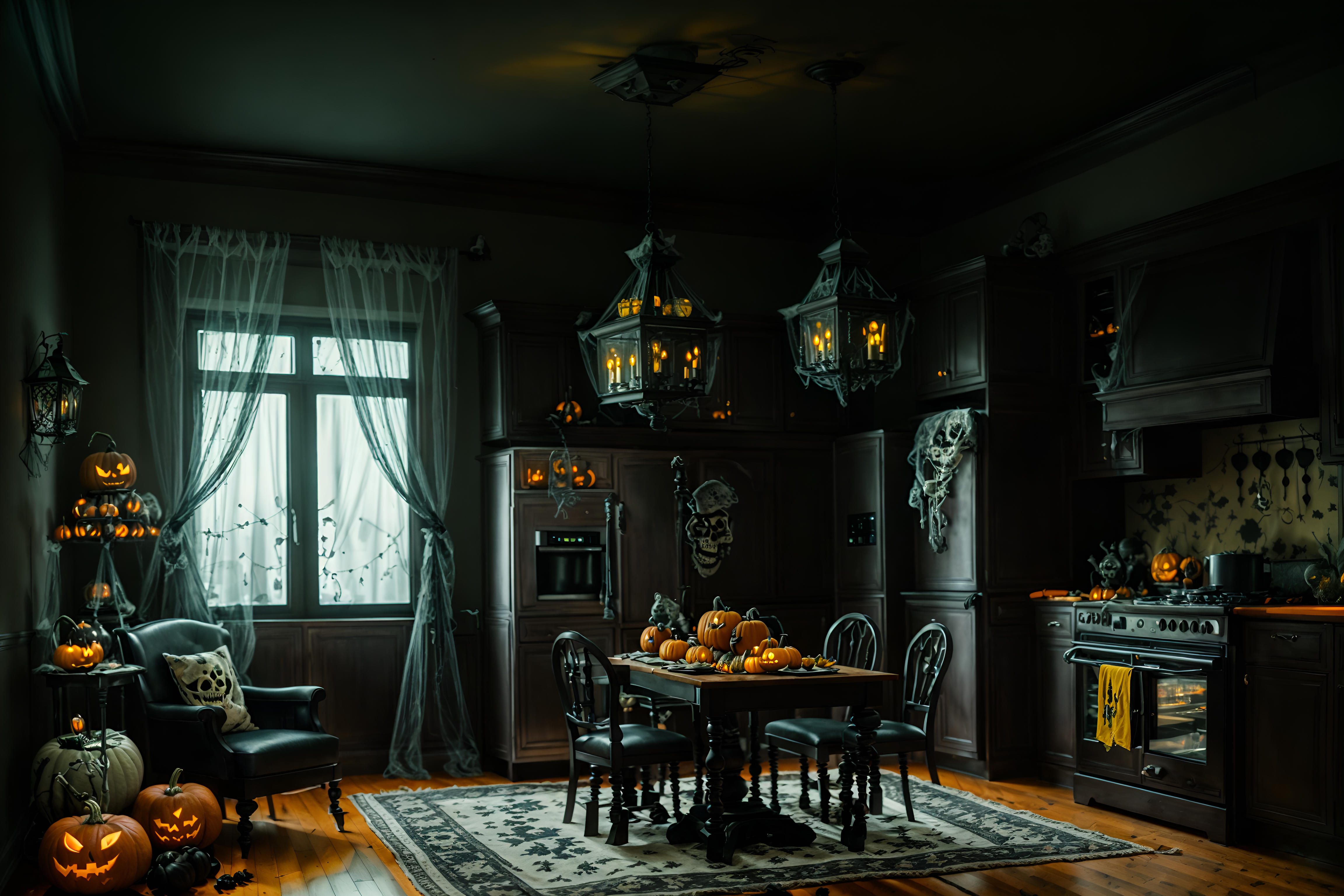 photo from pinterest of halloween-style interior designed (kitchen living combo interior) with coffee tables and chairs and refrigerator and stove and furniture and televisions and sink and rug. . with spiderwebs and lanterns and cobwebs and human skulls and lanterns and glowing pumpkins and skeletons sitting and standing and yellow black balloons. . cinematic photo, highly detailed, cinematic lighting, ultra-detailed, ultrarealistic, photorealism, 8k. trending on pinterest. halloween interior design style. masterpiece, cinematic light, ultrarealistic+, photorealistic+, 8k, raw photo, realistic, sharp focus on eyes, (symmetrical eyes), (intact eyes), hyperrealistic, highest quality, best quality, , highly detailed, masterpiece, best quality, extremely detailed 8k wallpaper, masterpiece, best quality, ultra-detailed, best shadow, detailed background, detailed face, detailed eyes, high contrast, best illumination, detailed face, dulux, caustic, dynamic angle, detailed glow. dramatic lighting. highly detailed, insanely detailed hair, symmetrical, intricate details, professionally retouched, 8k high definition. strong bokeh. award winning photo.