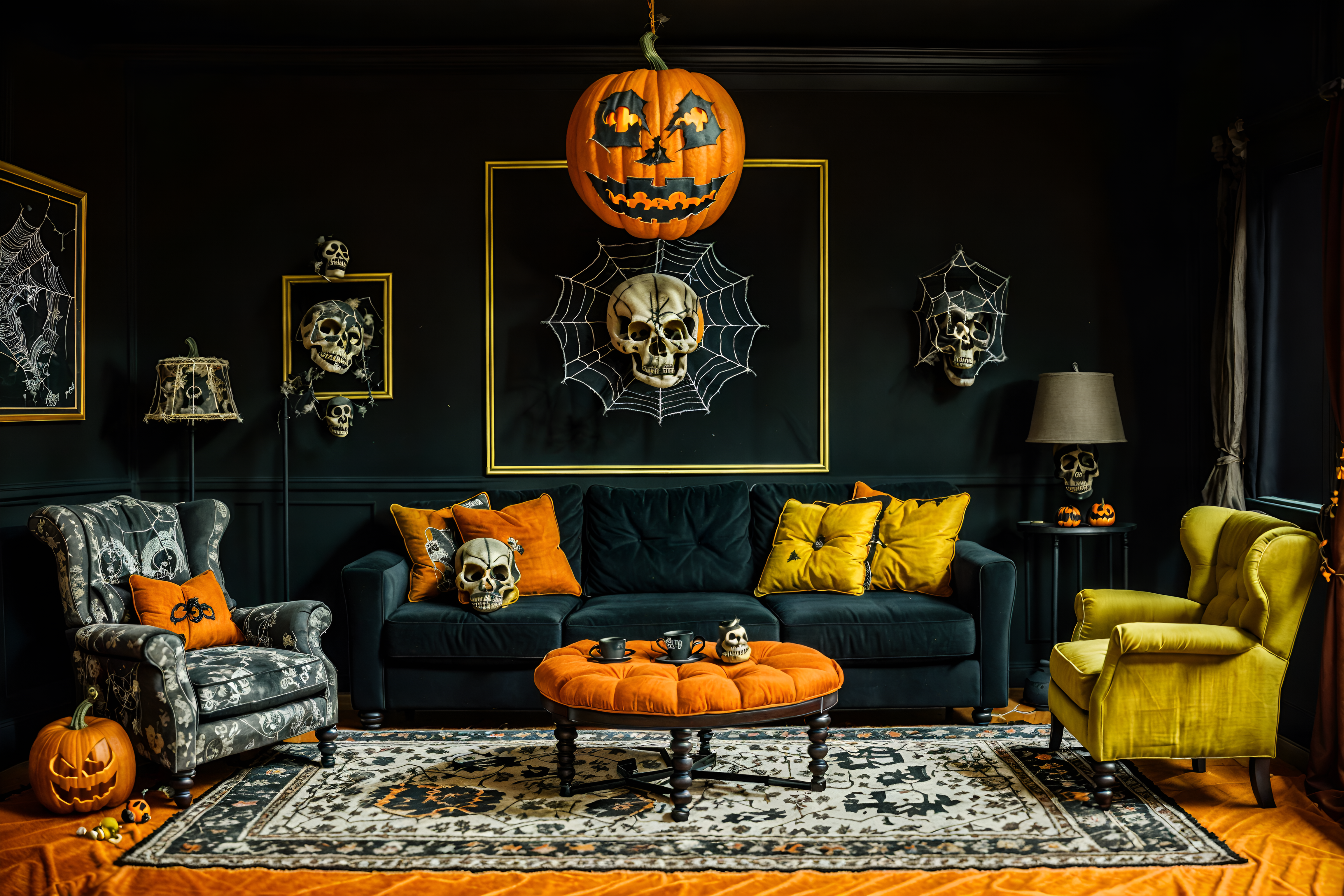 photo from pinterest of halloween-style interior designed (living room interior) with sofa and furniture and coffee tables and rug and chairs and plant and televisions and occasional tables. . with human skulls and cobwebs and spiderwebs and cobwebs and skeletons sitting and standing and glowing pumpkins and yellow black balloons and lanterns. . cinematic photo, highly detailed, cinematic lighting, ultra-detailed, ultrarealistic, photorealism, 8k. trending on pinterest. halloween interior design style. masterpiece, cinematic light, ultrarealistic+, photorealistic+, 8k, raw photo, realistic, sharp focus on eyes, (symmetrical eyes), (intact eyes), hyperrealistic, highest quality, best quality, , highly detailed, masterpiece, best quality, extremely detailed 8k wallpaper, masterpiece, best quality, ultra-detailed, best shadow, detailed background, detailed face, detailed eyes, high contrast, best illumination, detailed face, dulux, caustic, dynamic angle, detailed glow. dramatic lighting. highly detailed, insanely detailed hair, symmetrical, intricate details, professionally retouched, 8k high definition. strong bokeh. award winning photo.