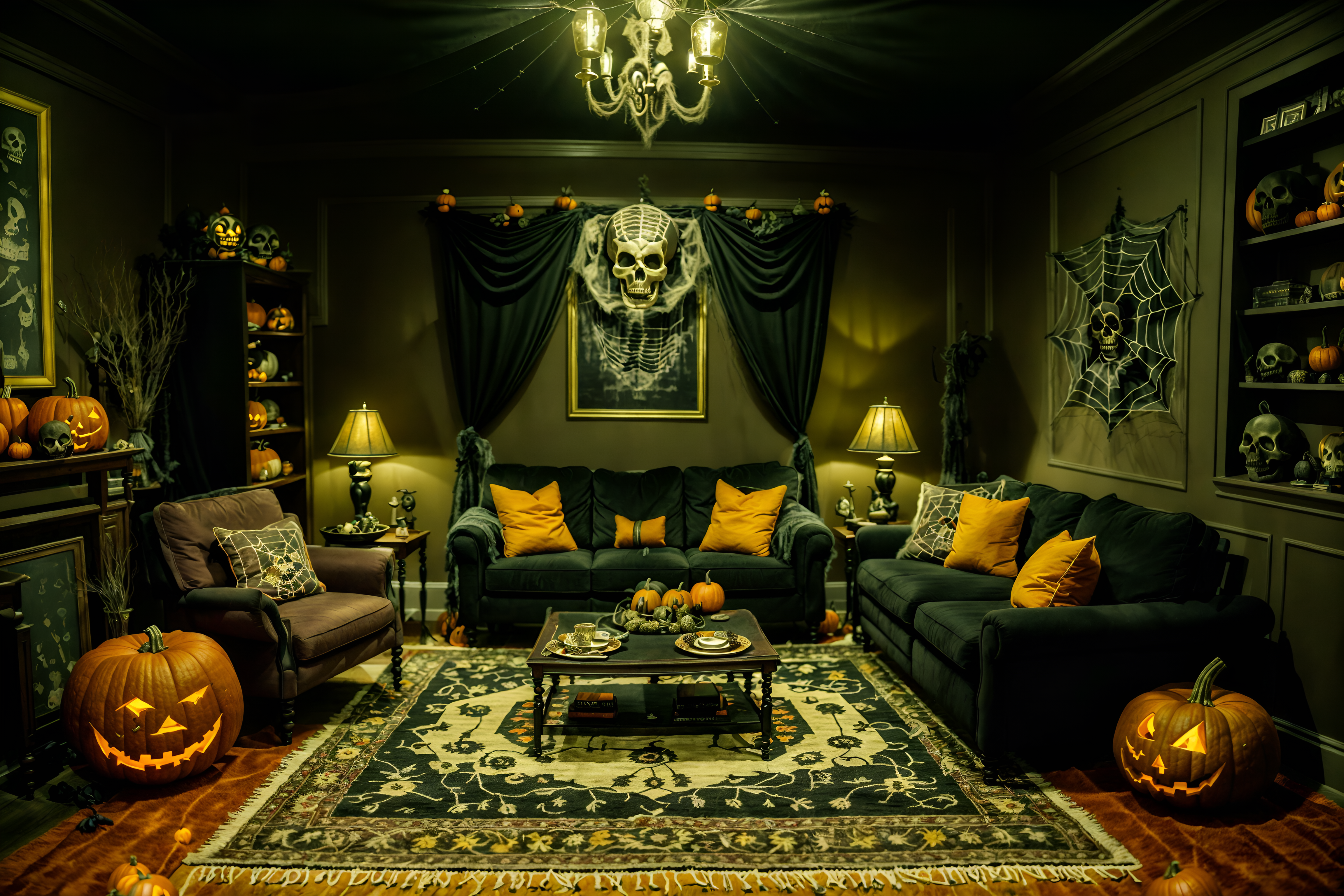 photo from pinterest of halloween-style interior designed (living room interior) with sofa and furniture and coffee tables and rug and chairs and plant and televisions and occasional tables. . with human skulls and cobwebs and spiderwebs and cobwebs and skeletons sitting and standing and glowing pumpkins and yellow black balloons and lanterns. . cinematic photo, highly detailed, cinematic lighting, ultra-detailed, ultrarealistic, photorealism, 8k. trending on pinterest. halloween interior design style. masterpiece, cinematic light, ultrarealistic+, photorealistic+, 8k, raw photo, realistic, sharp focus on eyes, (symmetrical eyes), (intact eyes), hyperrealistic, highest quality, best quality, , highly detailed, masterpiece, best quality, extremely detailed 8k wallpaper, masterpiece, best quality, ultra-detailed, best shadow, detailed background, detailed face, detailed eyes, high contrast, best illumination, detailed face, dulux, caustic, dynamic angle, detailed glow. dramatic lighting. highly detailed, insanely detailed hair, symmetrical, intricate details, professionally retouched, 8k high definition. strong bokeh. award winning photo.