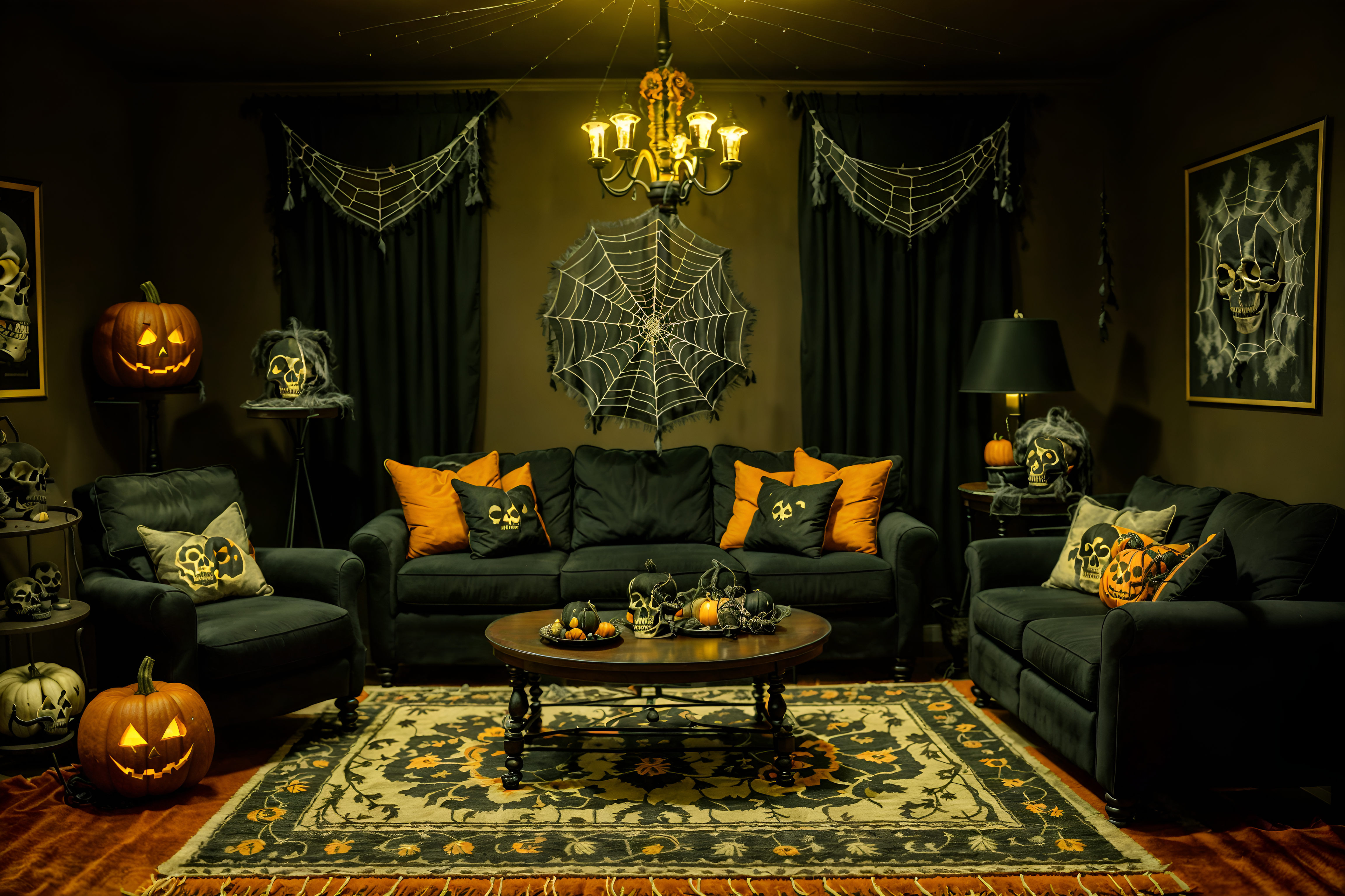 photo from pinterest of halloween-style interior designed (living room interior) with sofa and furniture and coffee tables and rug and chairs and plant and televisions and occasional tables. . with human skulls and cobwebs and spiderwebs and cobwebs and skeletons sitting and standing and glowing pumpkins and yellow black balloons and lanterns. . cinematic photo, highly detailed, cinematic lighting, ultra-detailed, ultrarealistic, photorealism, 8k. trending on pinterest. halloween interior design style. masterpiece, cinematic light, ultrarealistic+, photorealistic+, 8k, raw photo, realistic, sharp focus on eyes, (symmetrical eyes), (intact eyes), hyperrealistic, highest quality, best quality, , highly detailed, masterpiece, best quality, extremely detailed 8k wallpaper, masterpiece, best quality, ultra-detailed, best shadow, detailed background, detailed face, detailed eyes, high contrast, best illumination, detailed face, dulux, caustic, dynamic angle, detailed glow. dramatic lighting. highly detailed, insanely detailed hair, symmetrical, intricate details, professionally retouched, 8k high definition. strong bokeh. award winning photo.