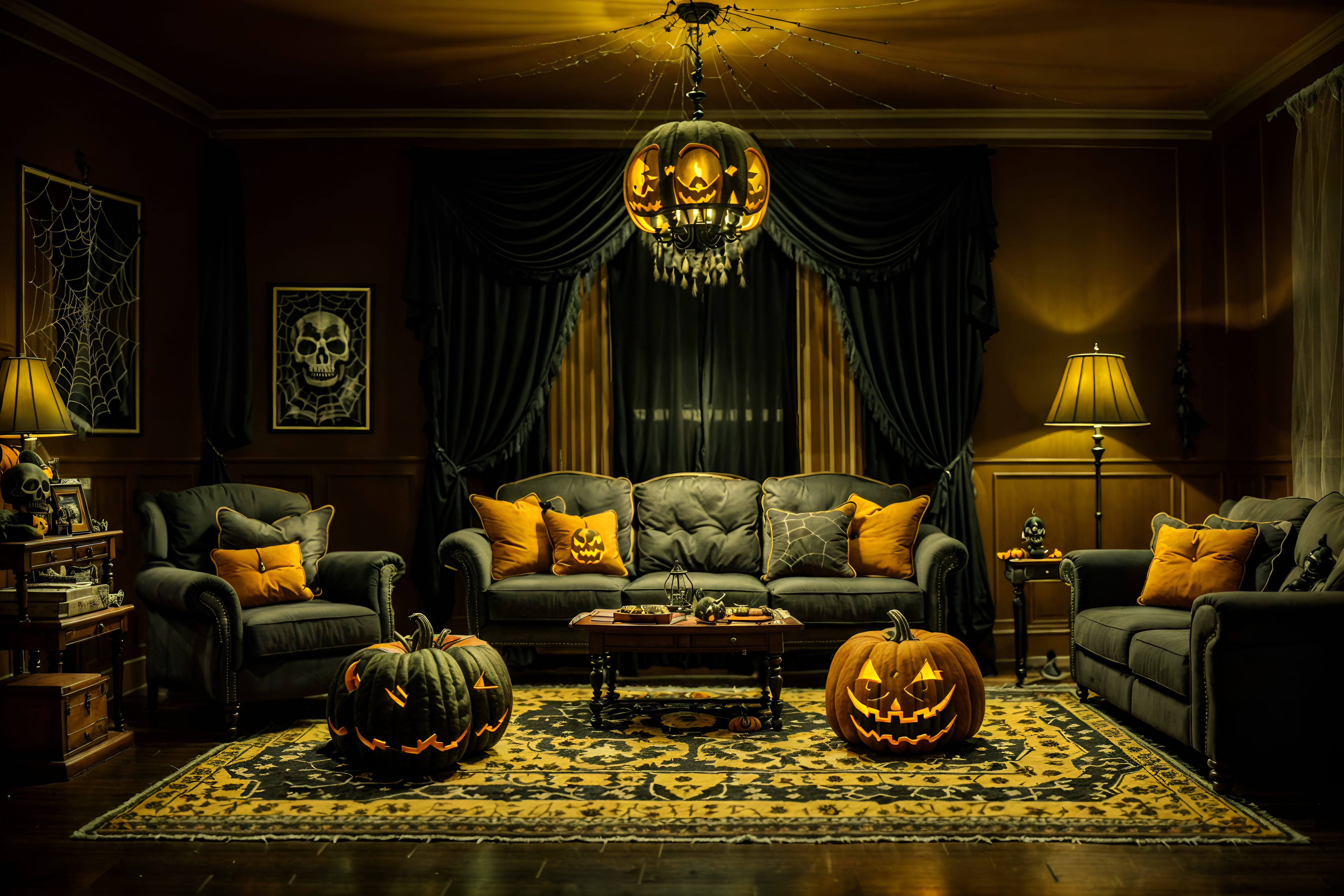 photo from pinterest of halloween-style interior designed (living room interior) with sofa and furniture and coffee tables and rug and chairs and plant and televisions and occasional tables. . with human skulls and cobwebs and spiderwebs and cobwebs and skeletons sitting and standing and glowing pumpkins and yellow black balloons and lanterns. . cinematic photo, highly detailed, cinematic lighting, ultra-detailed, ultrarealistic, photorealism, 8k. trending on pinterest. halloween interior design style. masterpiece, cinematic light, ultrarealistic+, photorealistic+, 8k, raw photo, realistic, sharp focus on eyes, (symmetrical eyes), (intact eyes), hyperrealistic, highest quality, best quality, , highly detailed, masterpiece, best quality, extremely detailed 8k wallpaper, masterpiece, best quality, ultra-detailed, best shadow, detailed background, detailed face, detailed eyes, high contrast, best illumination, detailed face, dulux, caustic, dynamic angle, detailed glow. dramatic lighting. highly detailed, insanely detailed hair, symmetrical, intricate details, professionally retouched, 8k high definition. strong bokeh. award winning photo.