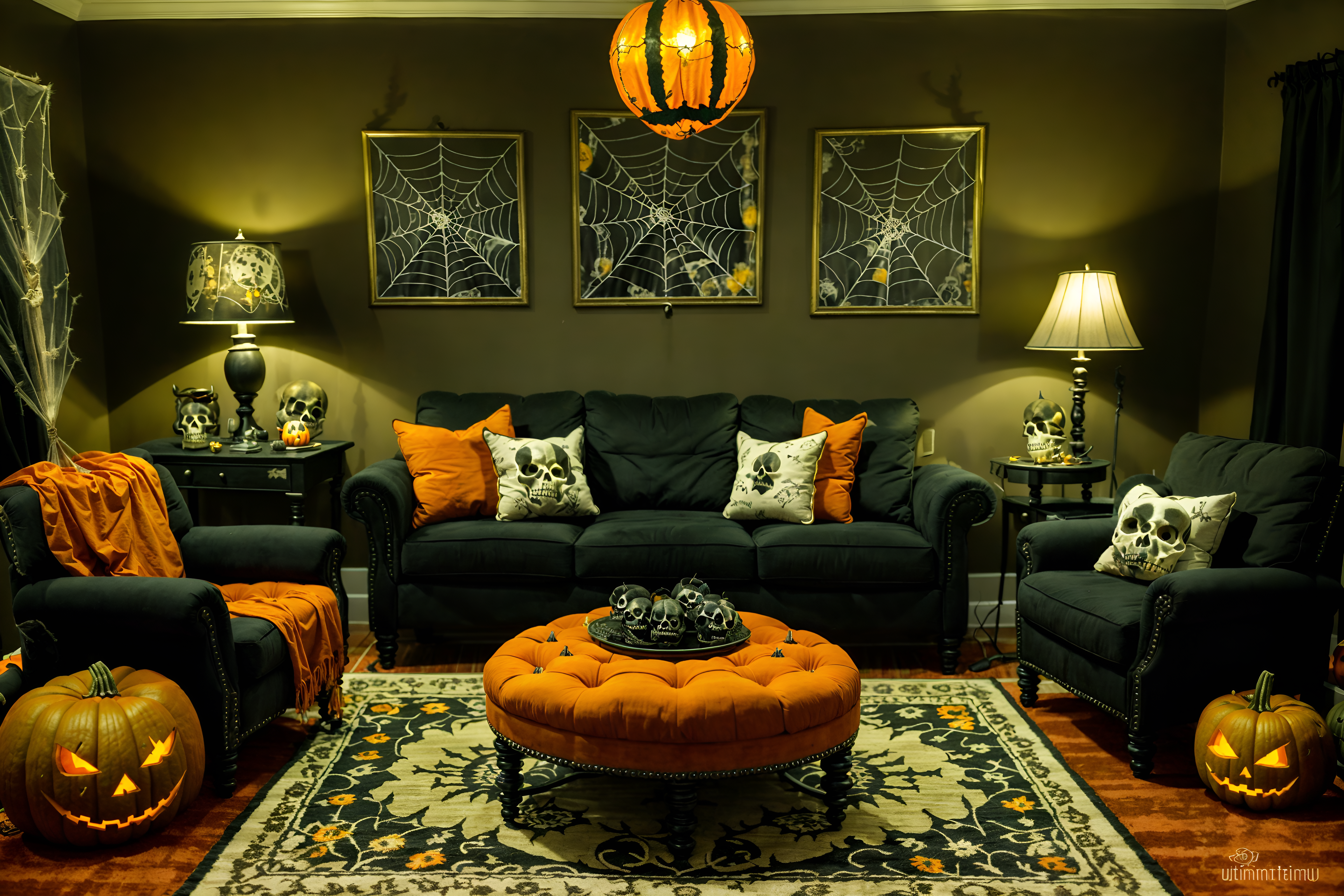 photo from pinterest of halloween-style interior designed (living room interior) with sofa and furniture and coffee tables and rug and chairs and plant and televisions and occasional tables. . with human skulls and cobwebs and spiderwebs and cobwebs and skeletons sitting and standing and glowing pumpkins and yellow black balloons and lanterns. . cinematic photo, highly detailed, cinematic lighting, ultra-detailed, ultrarealistic, photorealism, 8k. trending on pinterest. halloween interior design style. masterpiece, cinematic light, ultrarealistic+, photorealistic+, 8k, raw photo, realistic, sharp focus on eyes, (symmetrical eyes), (intact eyes), hyperrealistic, highest quality, best quality, , highly detailed, masterpiece, best quality, extremely detailed 8k wallpaper, masterpiece, best quality, ultra-detailed, best shadow, detailed background, detailed face, detailed eyes, high contrast, best illumination, detailed face, dulux, caustic, dynamic angle, detailed glow. dramatic lighting. highly detailed, insanely detailed hair, symmetrical, intricate details, professionally retouched, 8k high definition. strong bokeh. award winning photo.