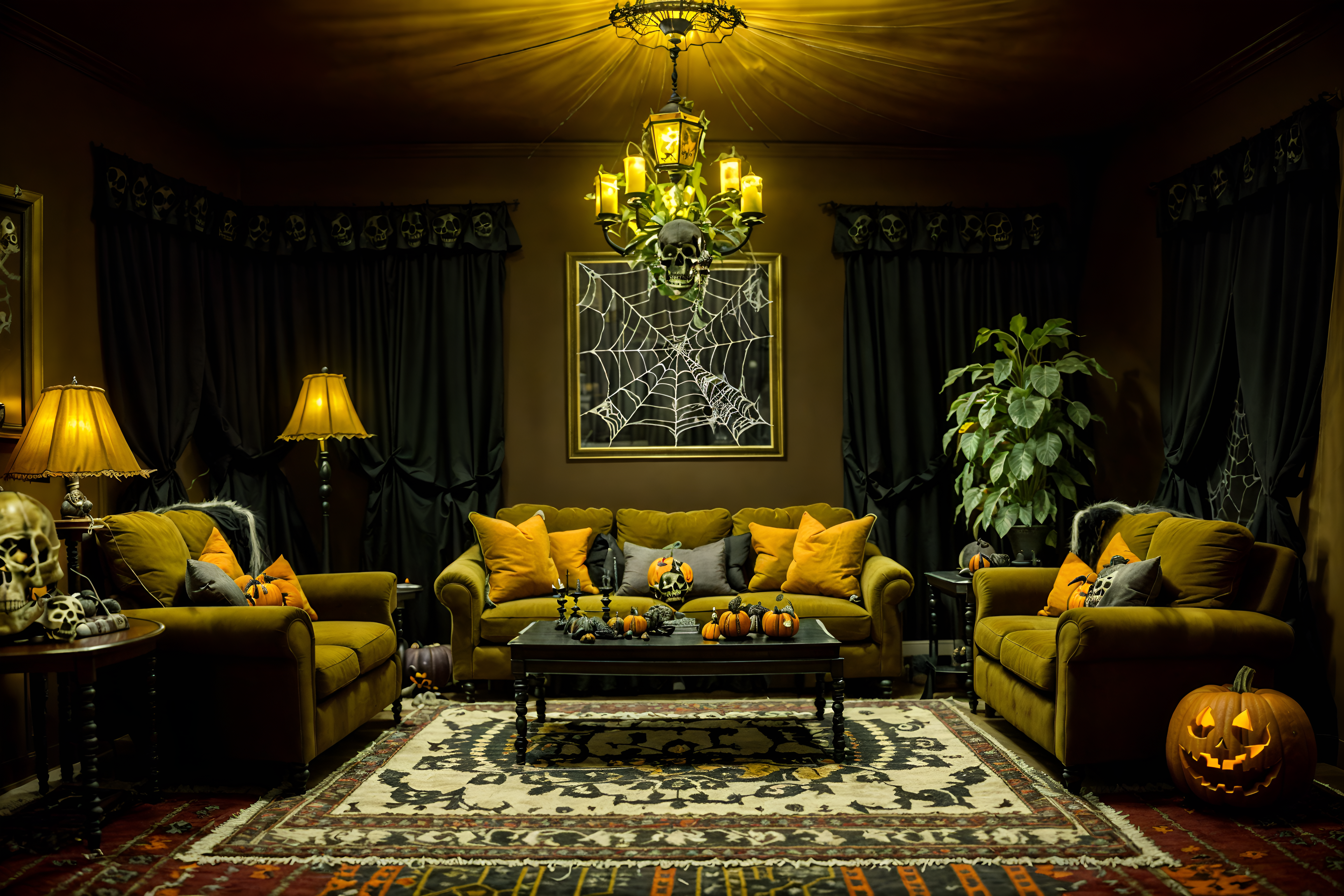 photo from pinterest of halloween-style interior designed (living room interior) with sofa and furniture and coffee tables and rug and chairs and plant and televisions and occasional tables. . with human skulls and cobwebs and spiderwebs and cobwebs and skeletons sitting and standing and glowing pumpkins and yellow black balloons and lanterns. . cinematic photo, highly detailed, cinematic lighting, ultra-detailed, ultrarealistic, photorealism, 8k. trending on pinterest. halloween interior design style. masterpiece, cinematic light, ultrarealistic+, photorealistic+, 8k, raw photo, realistic, sharp focus on eyes, (symmetrical eyes), (intact eyes), hyperrealistic, highest quality, best quality, , highly detailed, masterpiece, best quality, extremely detailed 8k wallpaper, masterpiece, best quality, ultra-detailed, best shadow, detailed background, detailed face, detailed eyes, high contrast, best illumination, detailed face, dulux, caustic, dynamic angle, detailed glow. dramatic lighting. highly detailed, insanely detailed hair, symmetrical, intricate details, professionally retouched, 8k high definition. strong bokeh. award winning photo.