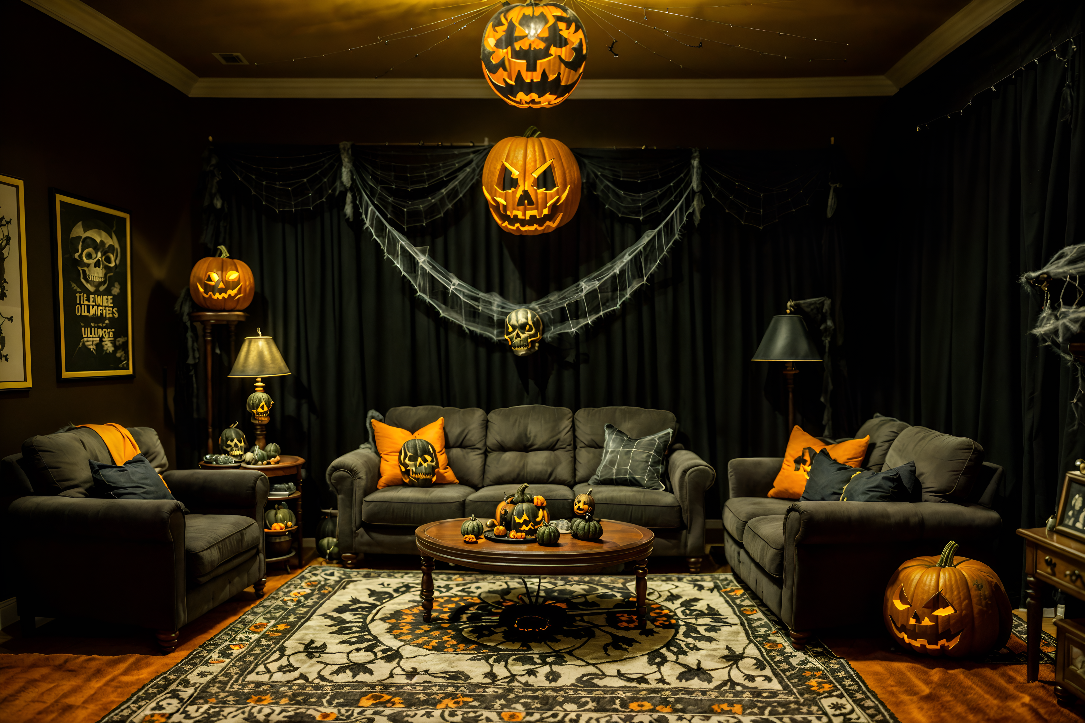 photo from pinterest of halloween-style interior designed (living room interior) with sofa and furniture and coffee tables and rug and chairs and plant and televisions and occasional tables. . with human skulls and cobwebs and spiderwebs and cobwebs and skeletons sitting and standing and glowing pumpkins and yellow black balloons and lanterns. . cinematic photo, highly detailed, cinematic lighting, ultra-detailed, ultrarealistic, photorealism, 8k. trending on pinterest. halloween interior design style. masterpiece, cinematic light, ultrarealistic+, photorealistic+, 8k, raw photo, realistic, sharp focus on eyes, (symmetrical eyes), (intact eyes), hyperrealistic, highest quality, best quality, , highly detailed, masterpiece, best quality, extremely detailed 8k wallpaper, masterpiece, best quality, ultra-detailed, best shadow, detailed background, detailed face, detailed eyes, high contrast, best illumination, detailed face, dulux, caustic, dynamic angle, detailed glow. dramatic lighting. highly detailed, insanely detailed hair, symmetrical, intricate details, professionally retouched, 8k high definition. strong bokeh. award winning photo.