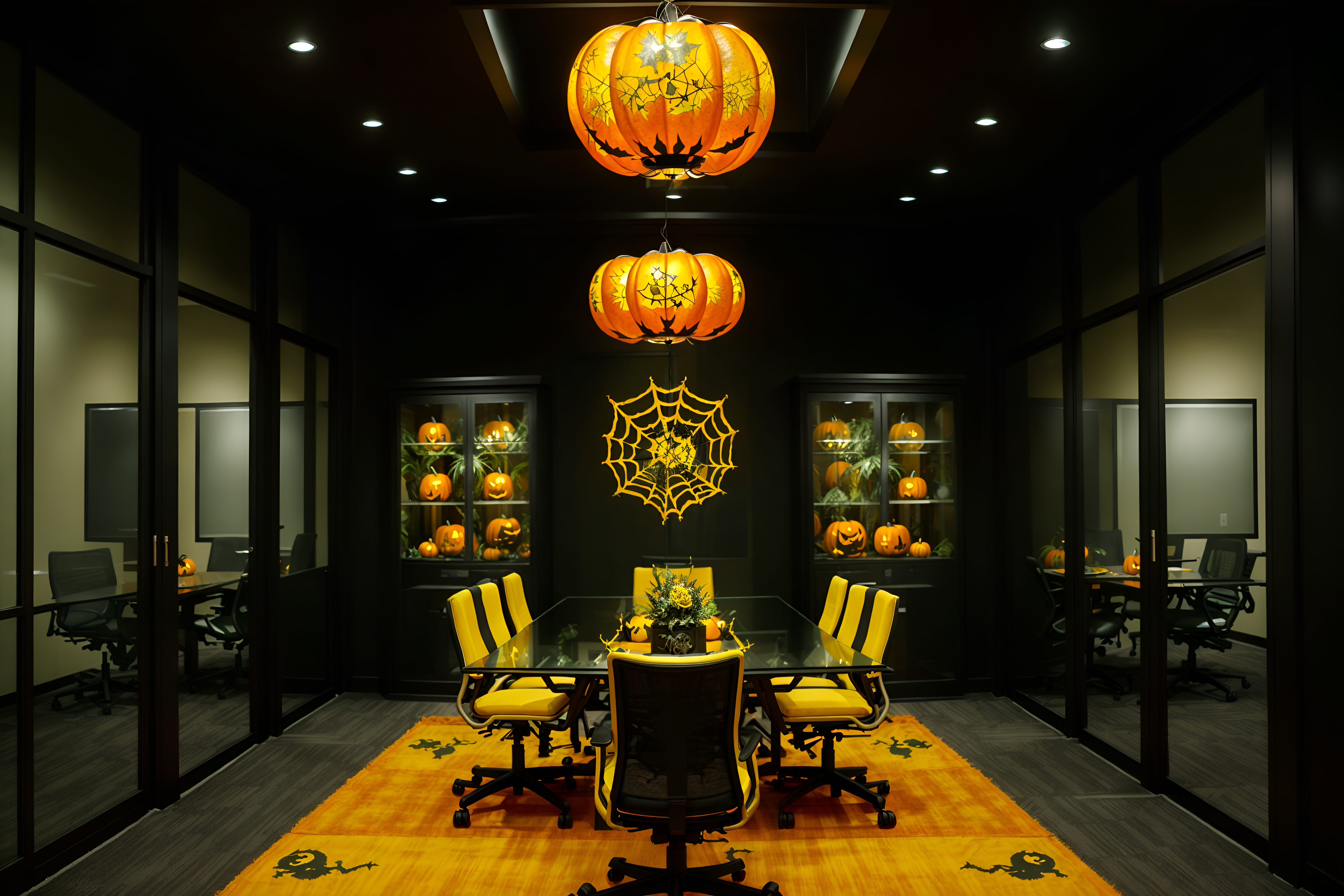 halloween meeting roomsinterior decorate this meeting room with halloween style. . . with vase and glass walls and painting or photo on wall and glass doors and boardroom table and office chairs and plant and cabinets. . with cobwebs and glowing pumpkins and cobwebs and lanterns and human skulls and lanterns and yellow black balloons and spiderwebs. . .