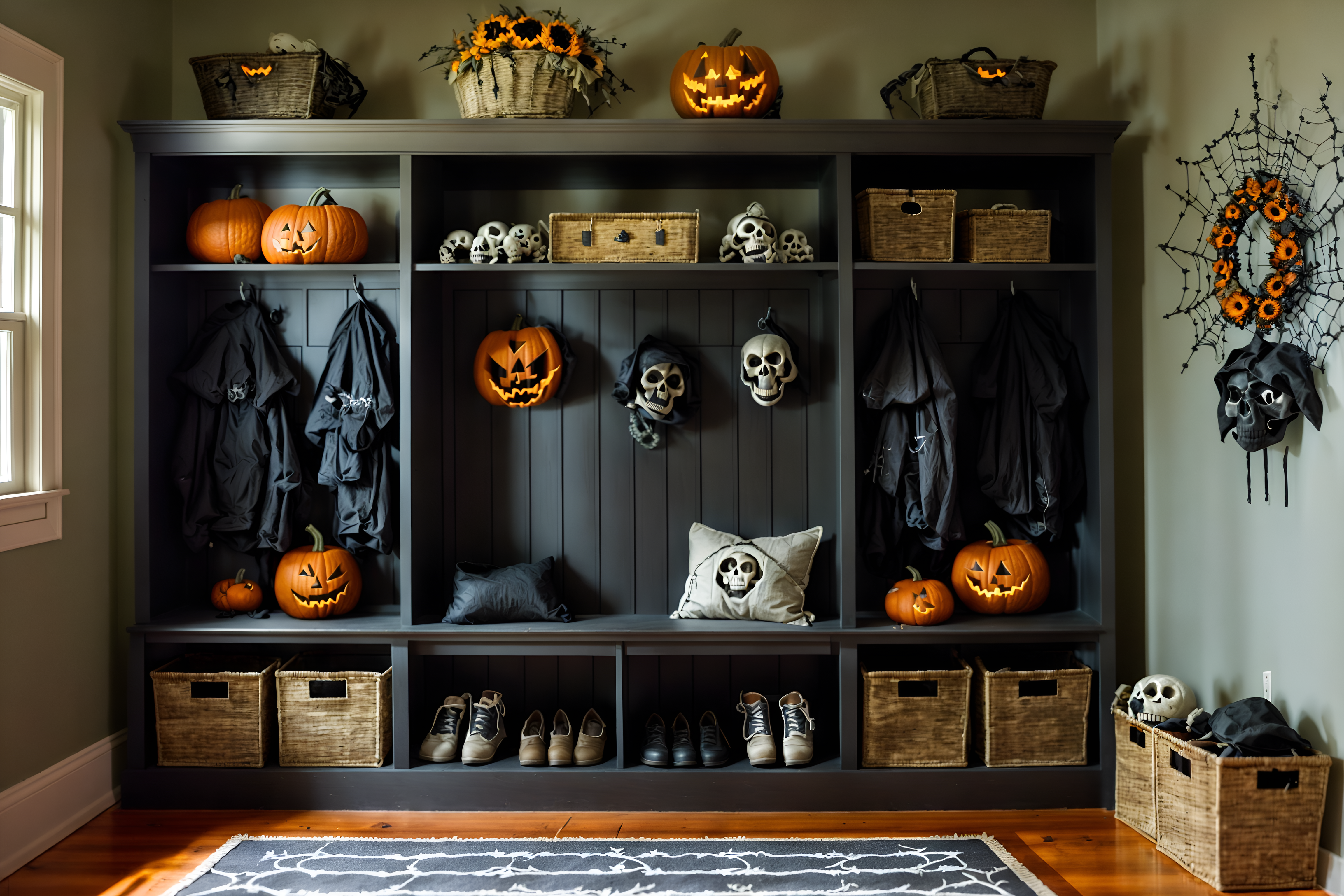 halloween mudroomsinterior decorate this mudroom with halloween style. . . with storage baskets and cabinets and cubbies and wall hooks for coats and high up storage and storage drawers and a bench and shelves for shoes. . with cobwebs and lanterns and human skulls and cobwebs and lanterns and yellow black balloons and spiderwebs and skeletons sitting and standing. . .
