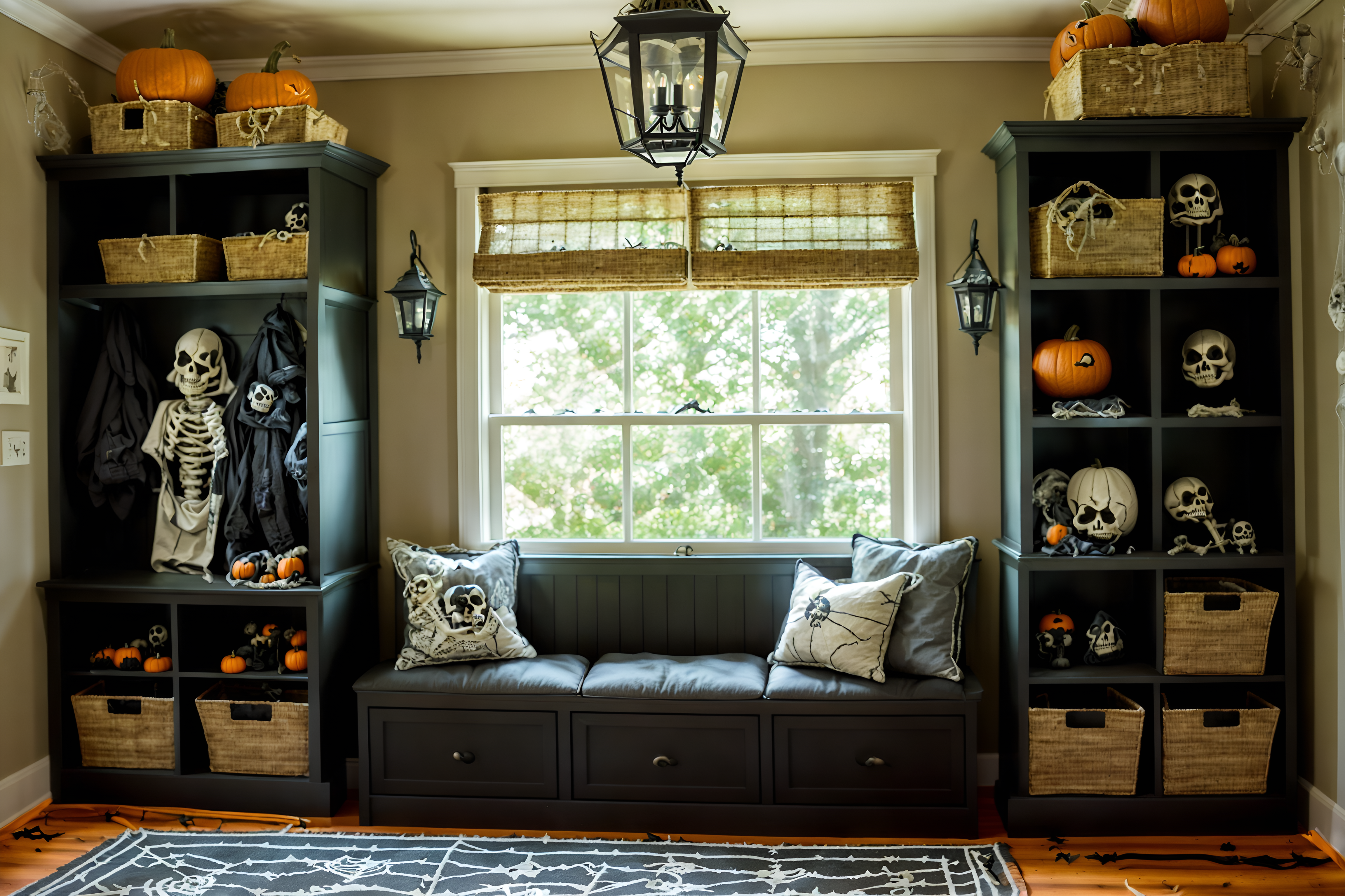 photo from pinterest of halloween-style interior designed (mudroom interior) with storage drawers and wall hooks for coats and high up storage and a bench and cubbies and storage baskets and cabinets and shelves for shoes. . with cobwebs and lanterns and cobwebs and spiderwebs and lanterns and skeletons sitting and standing and human skulls and glowing pumpkins. . cinematic photo, highly detailed, cinematic lighting, ultra-detailed, ultrarealistic, photorealism, 8k. trending on pinterest. halloween interior design style. masterpiece, cinematic light, ultrarealistic+, photorealistic+, 8k, raw photo, realistic, sharp focus on eyes, (symmetrical eyes), (intact eyes), hyperrealistic, highest quality, best quality, , highly detailed, masterpiece, best quality, extremely detailed 8k wallpaper, masterpiece, best quality, ultra-detailed, best shadow, detailed background, detailed face, detailed eyes, high contrast, best illumination, detailed face, dulux, caustic, dynamic angle, detailed glow. dramatic lighting. highly detailed, insanely detailed hair, symmetrical, intricate details, professionally retouched, 8k high definition. strong bokeh. award winning photo.